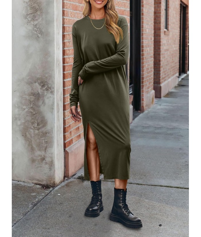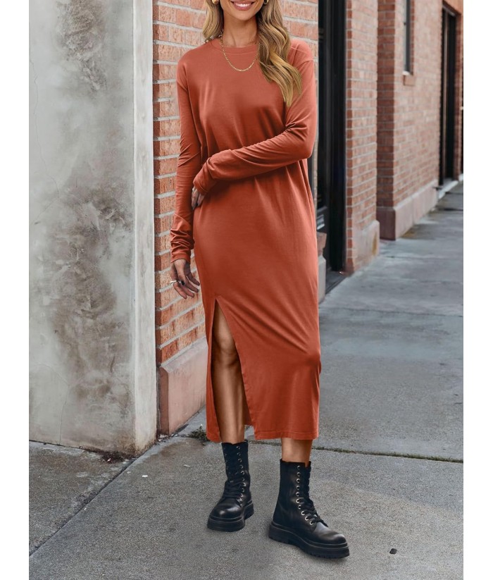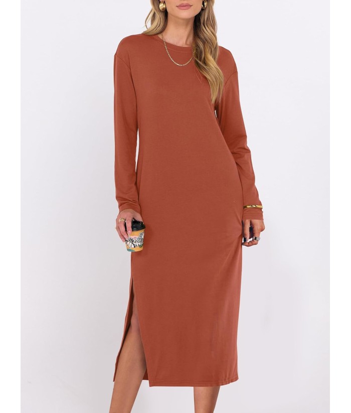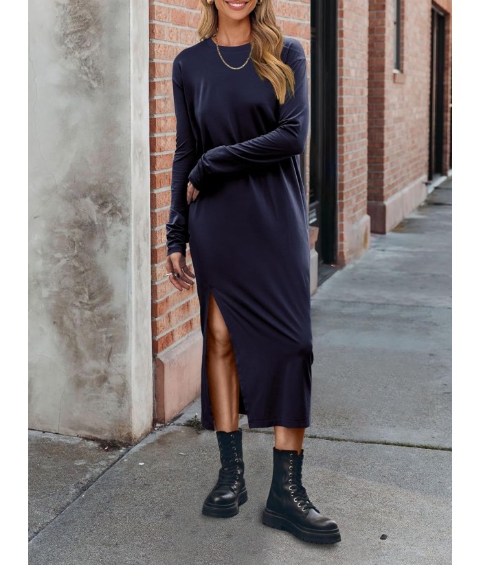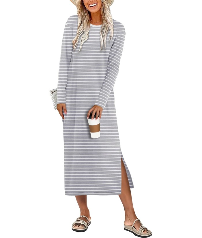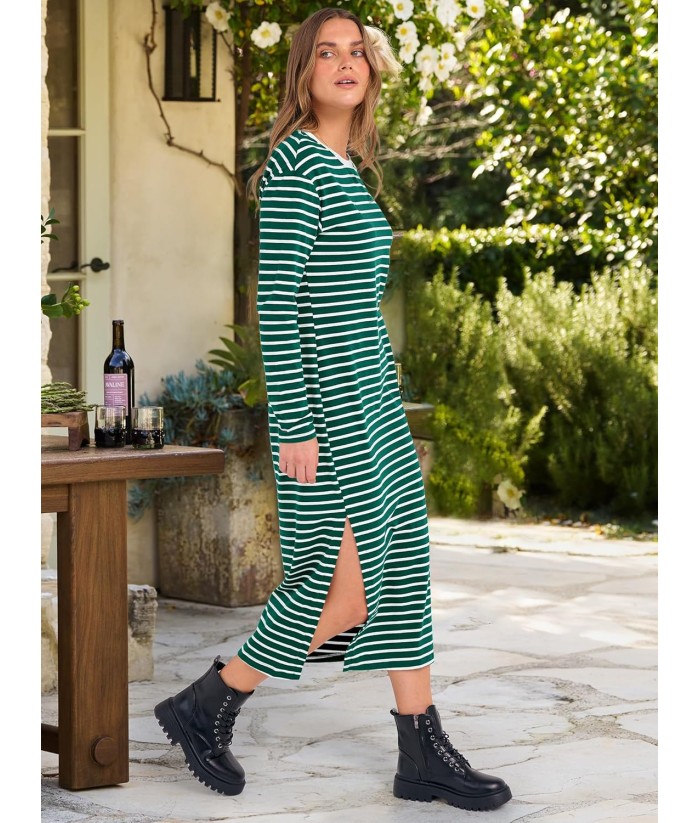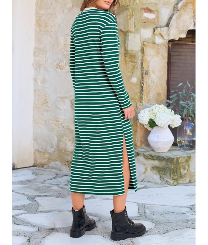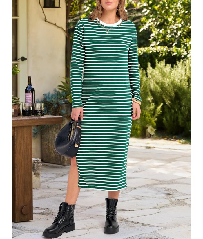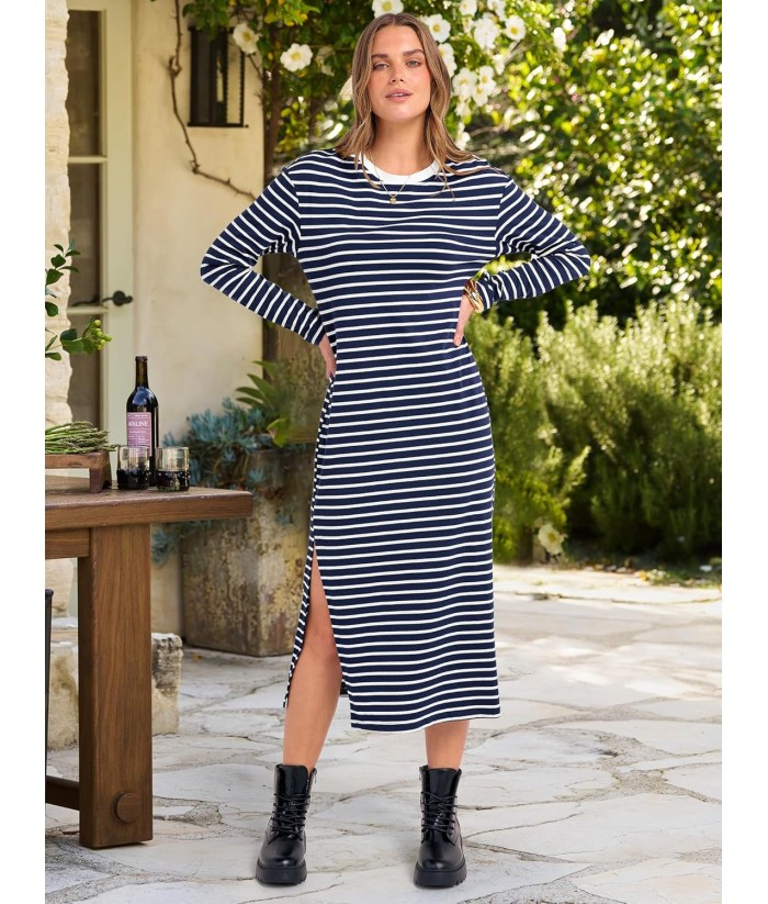 ANRABESS Long Sleeve Midi Dresses for Women Fall Fashion Casual Vacation Crewneck Loose Split Striped Long Tshirts Dress