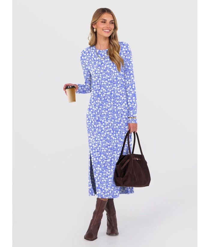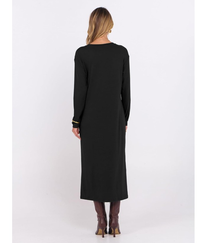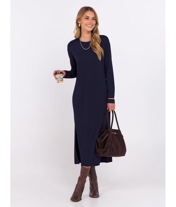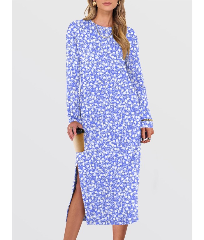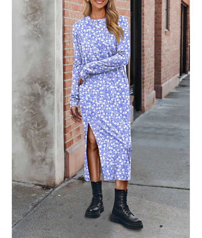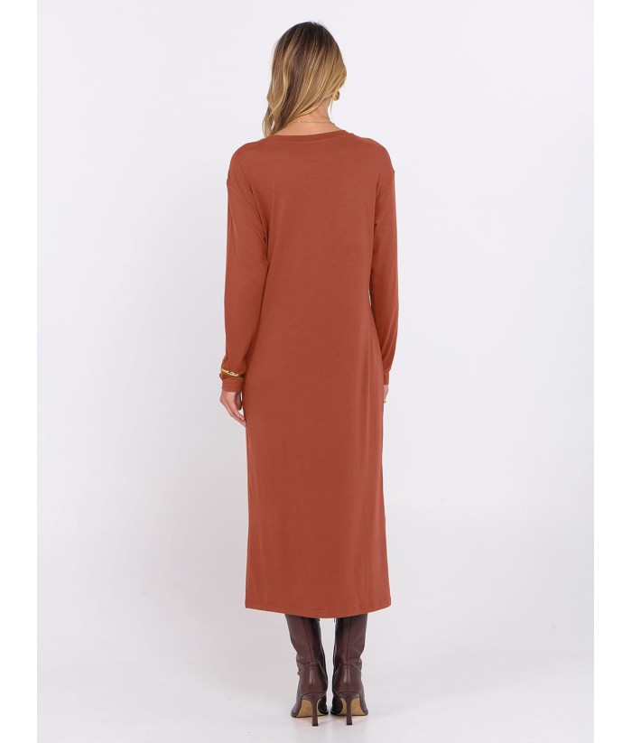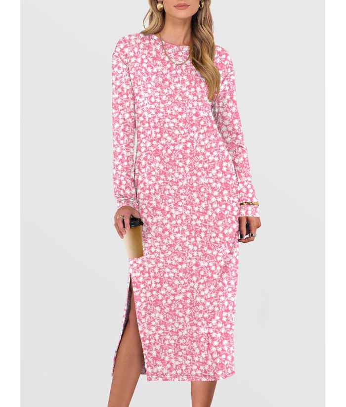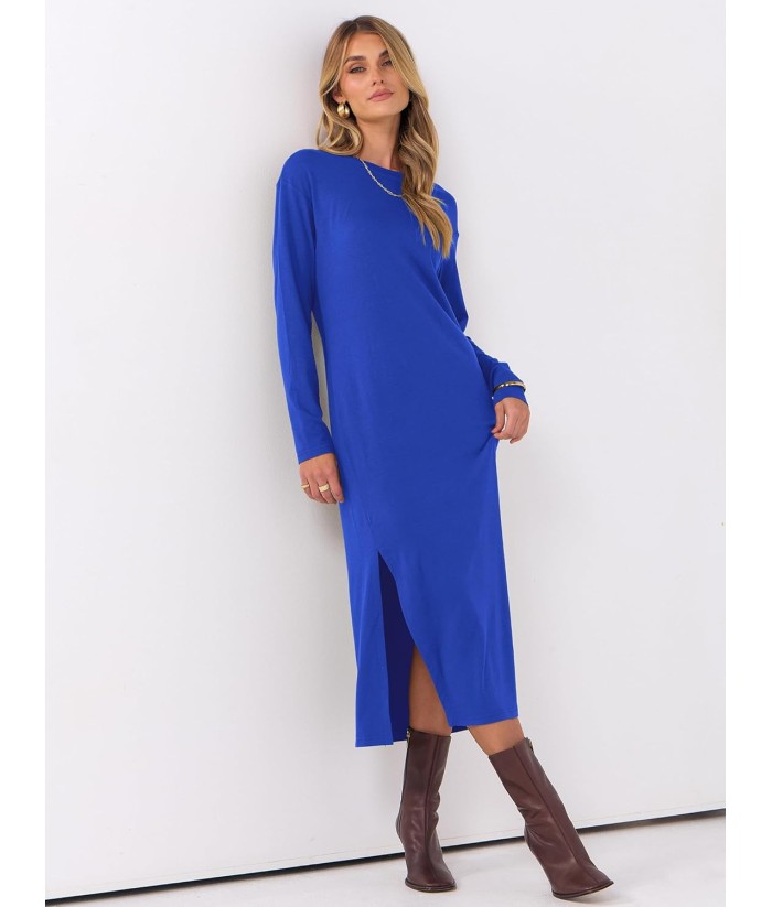 ANRABESS Long Sleeve Midi Dresses for Women Fall Fashion Casual Vacation Crewneck Loose Split Striped Long Tshirts Dress