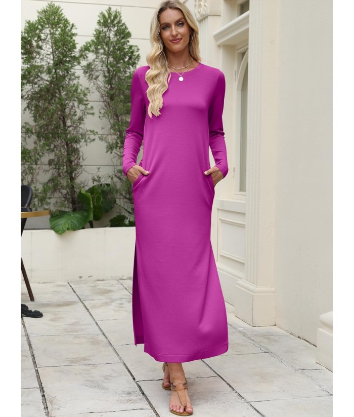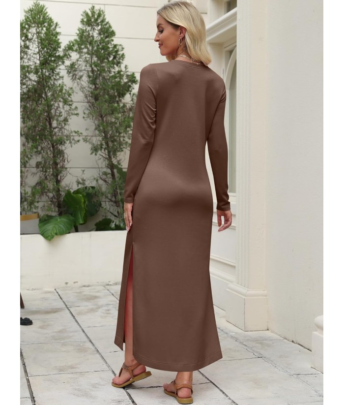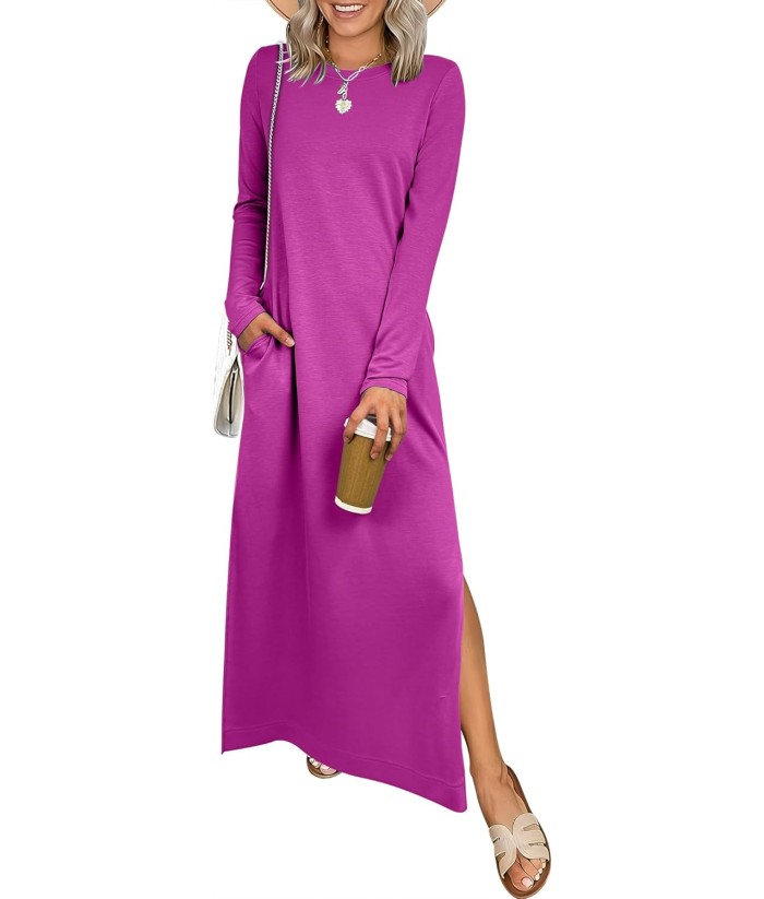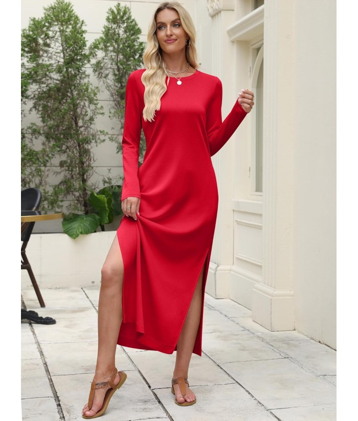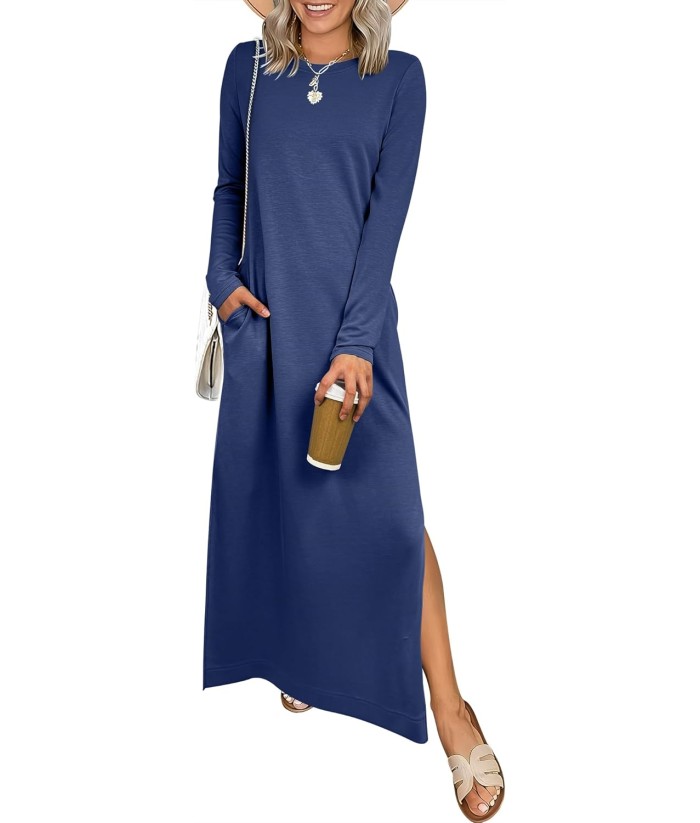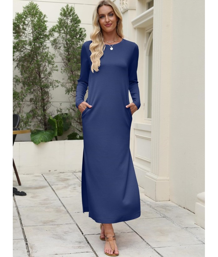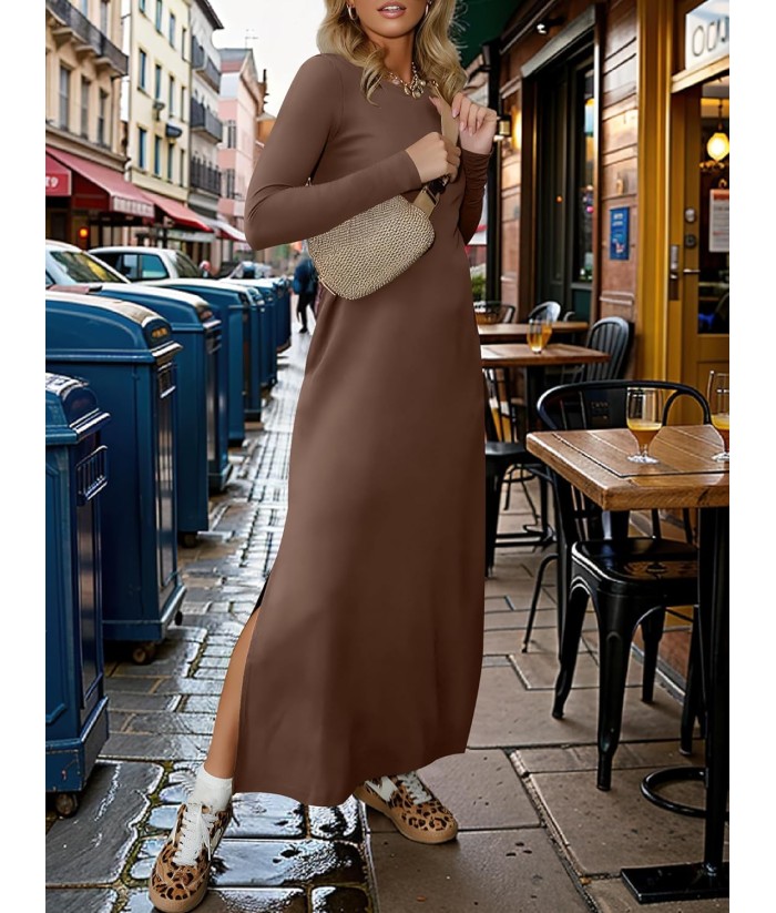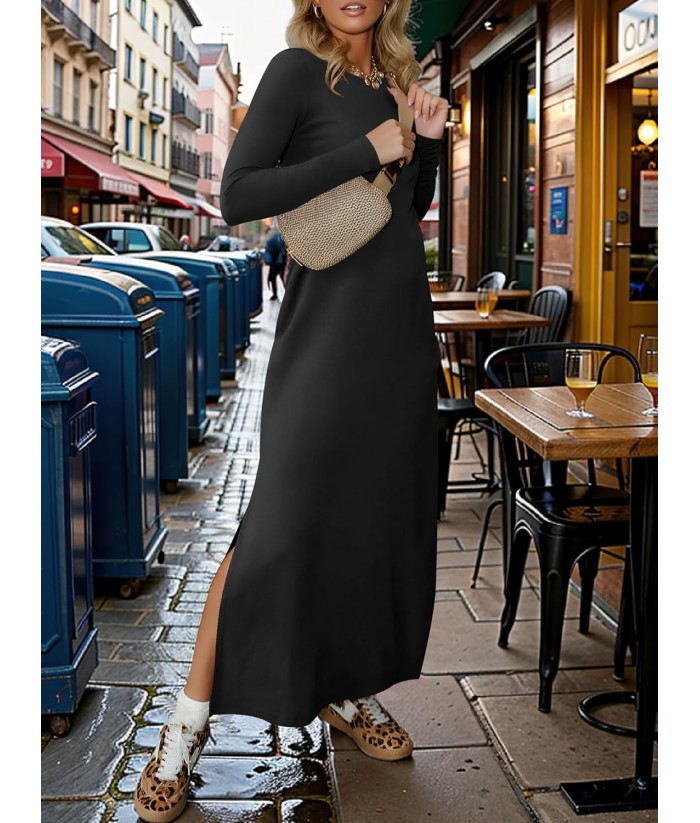 ANRABESS Women Long Sleeve Dresses 2025 Fall Casual Crewneck Loose Fit Split Flowy Wrinkle-Free Travel Vacation Maxi Dress