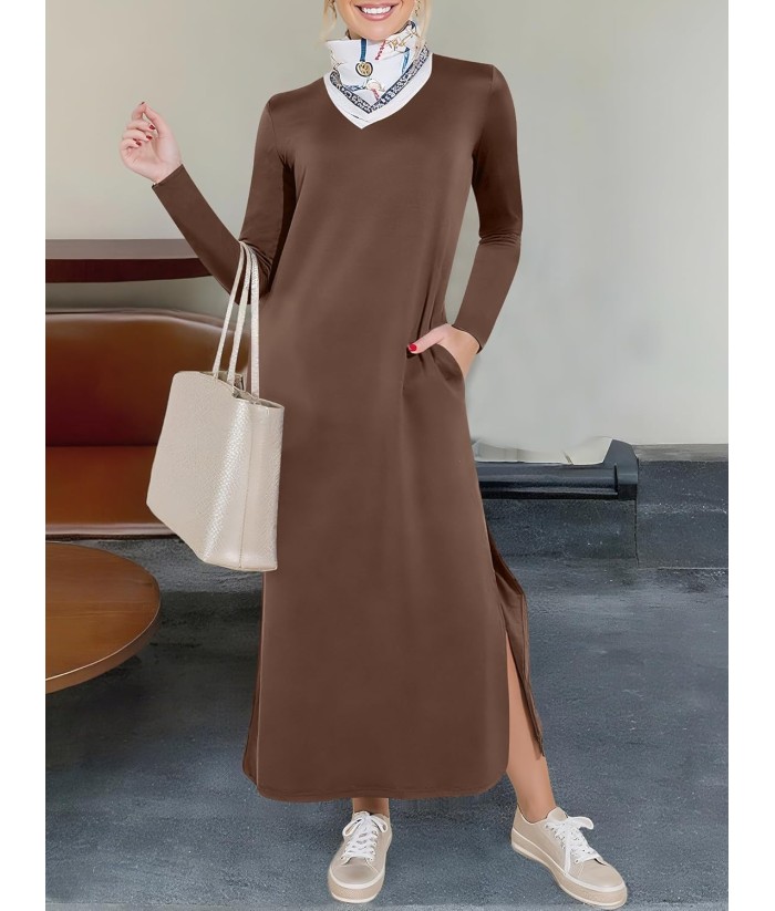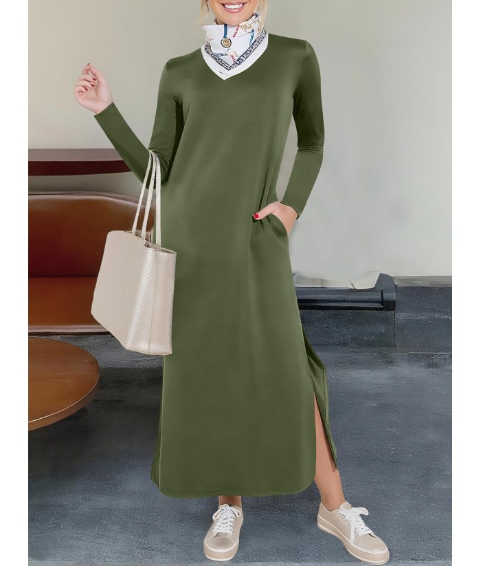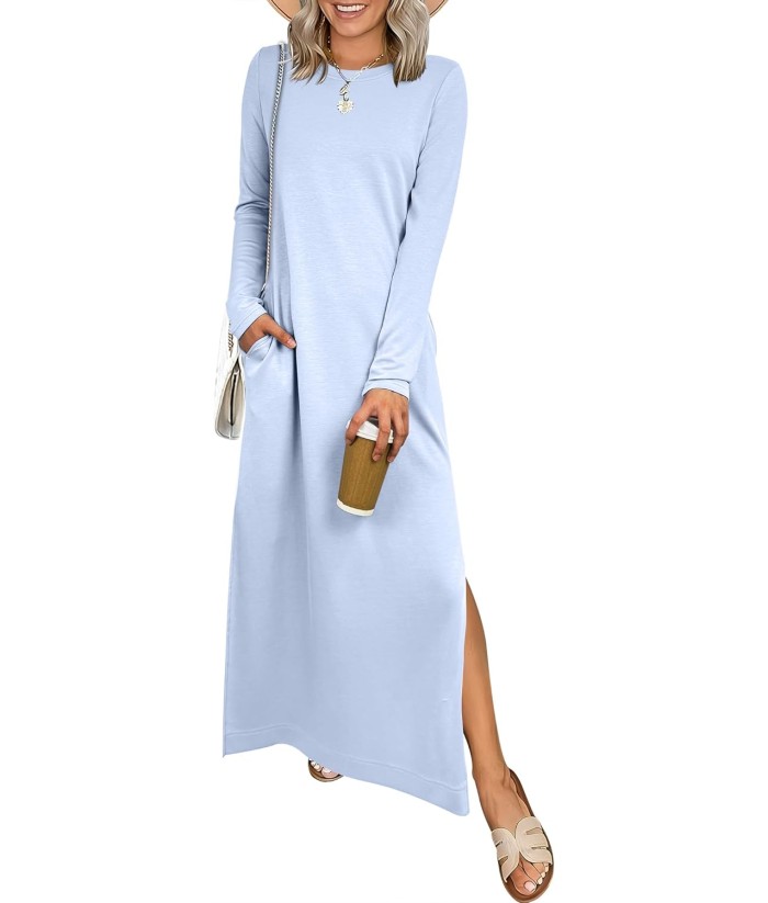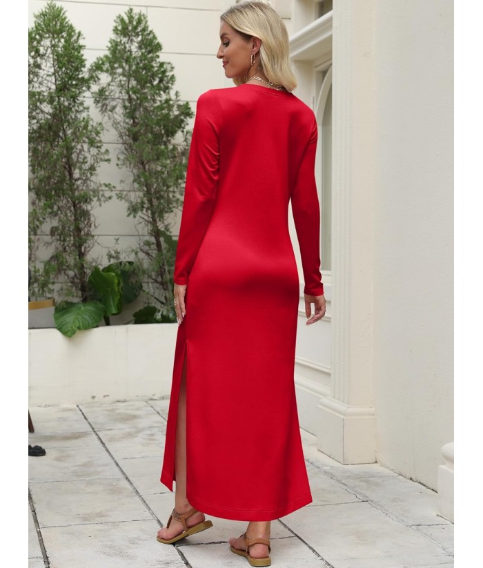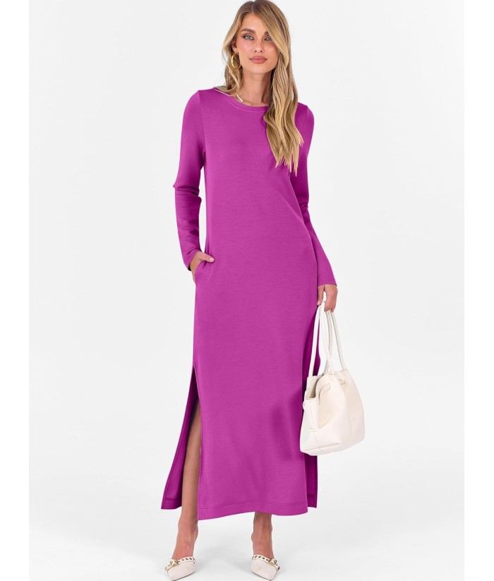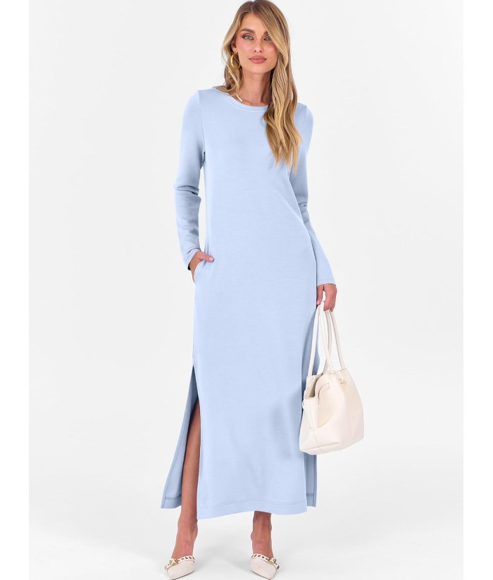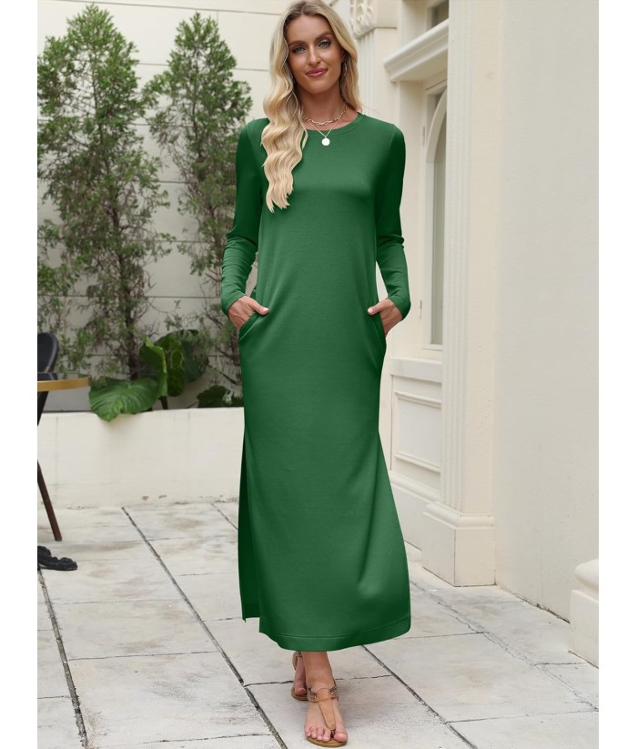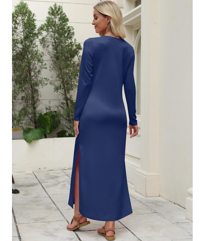 ANRABESS Women Long Sleeve Dresses 2025 Fall Casual Crewneck Loose Fit Split Flowy Wrinkle-Free Travel Vacation Maxi Dress
