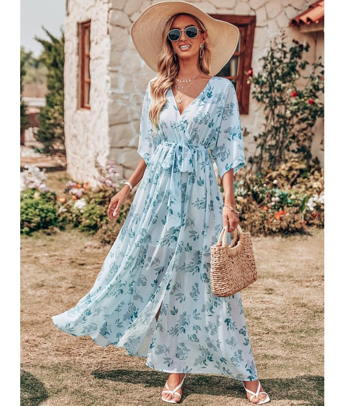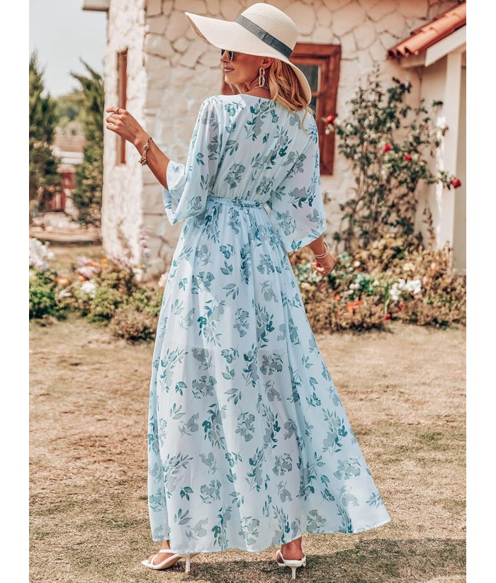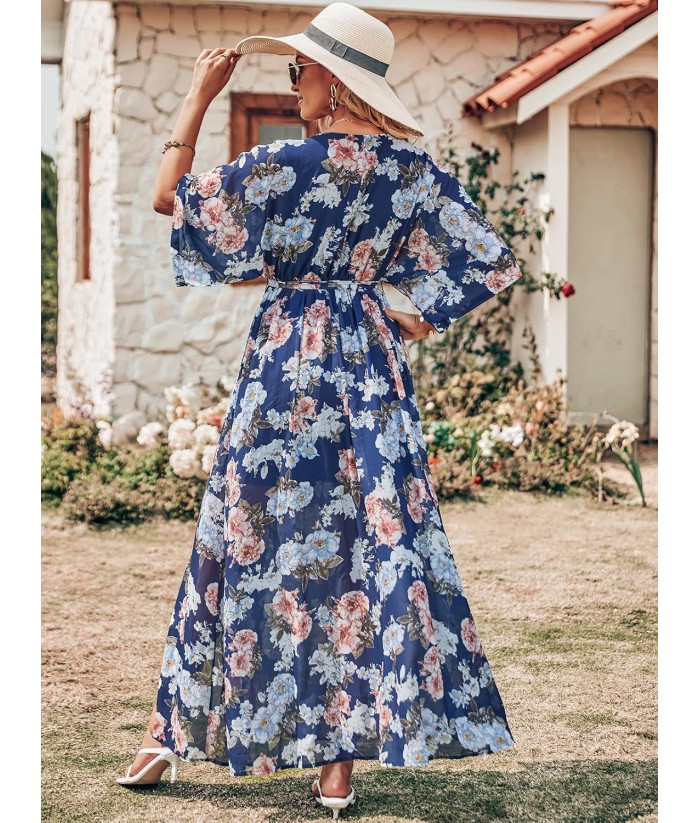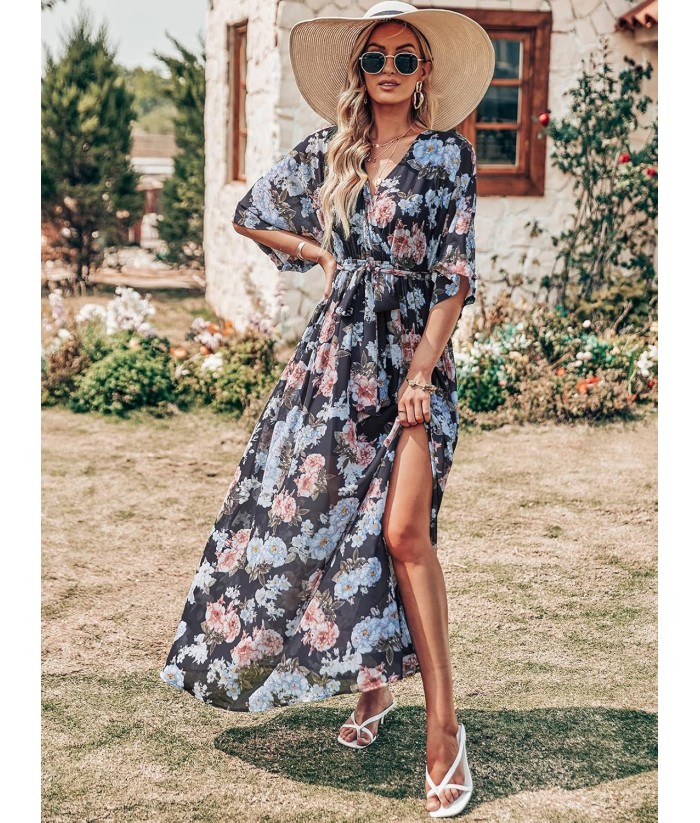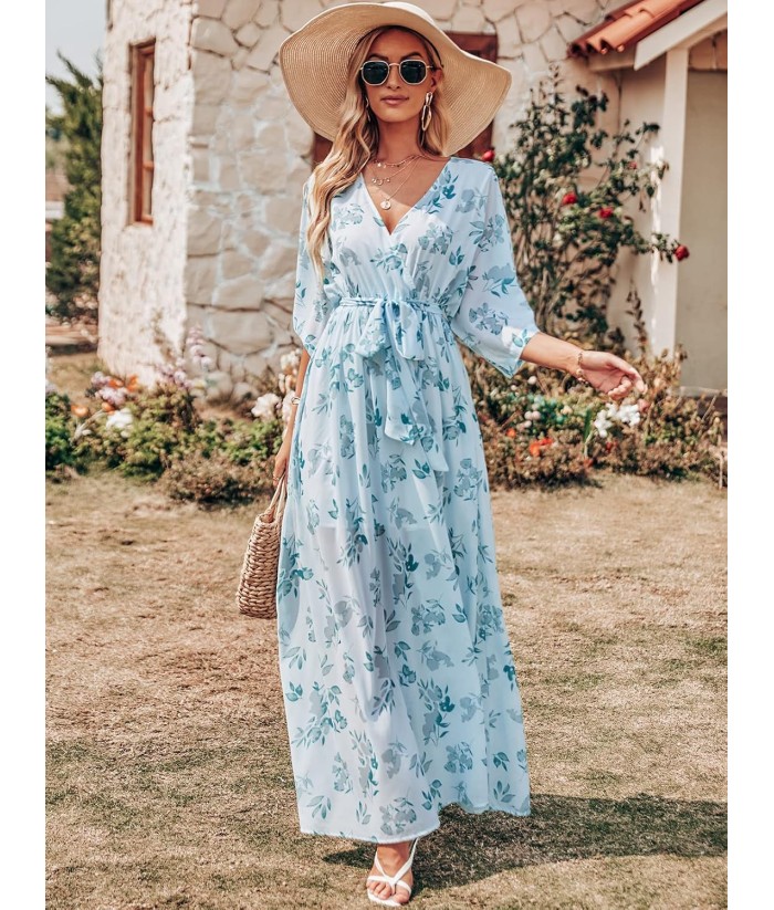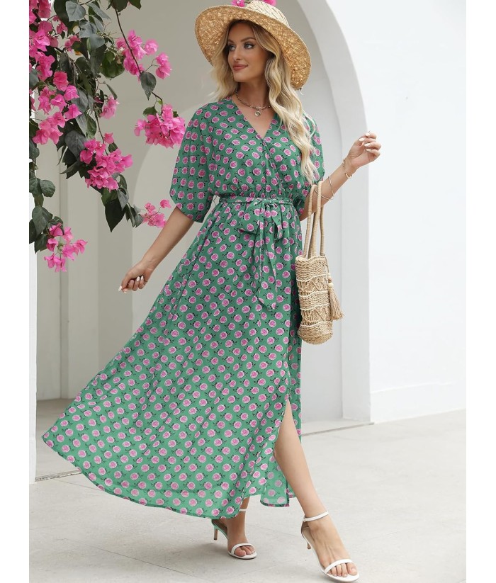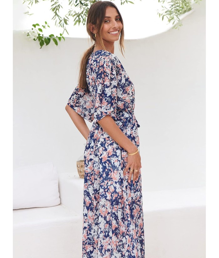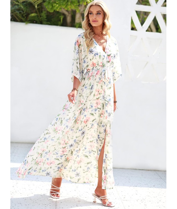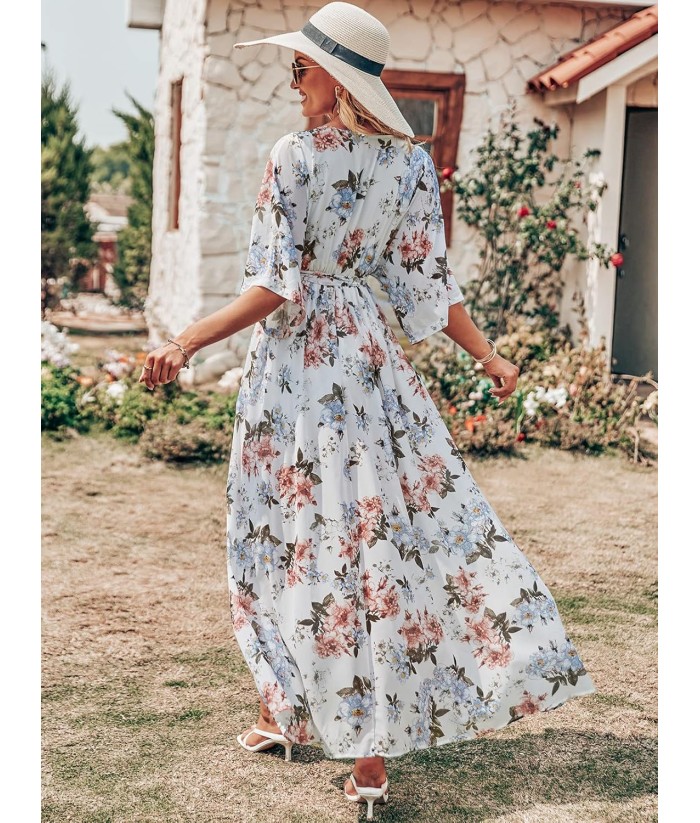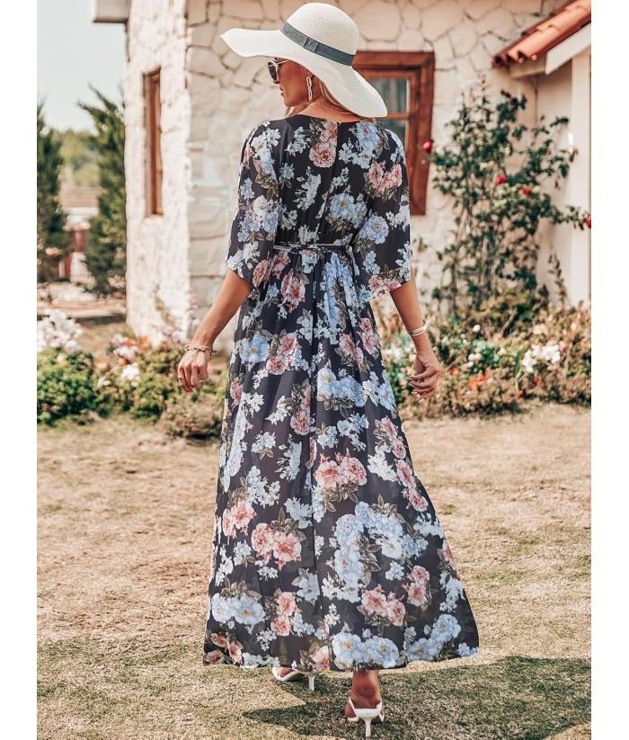 ANRABESS Women’s Summer Loose Boho Flowy Wrap V Neck 3/4 Sleeve Floral Print Slit Beach Wedding Guest Long Maxi Dresses