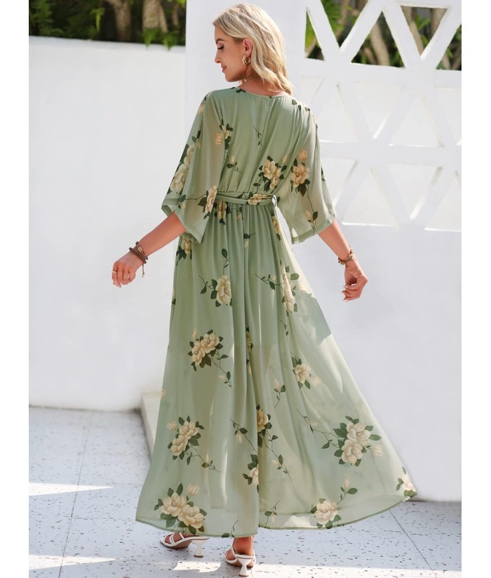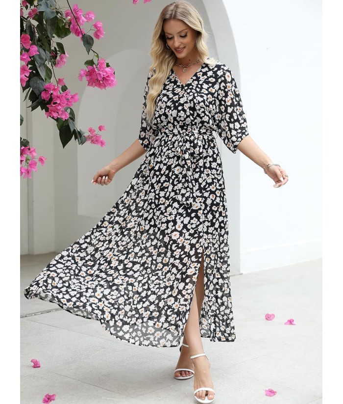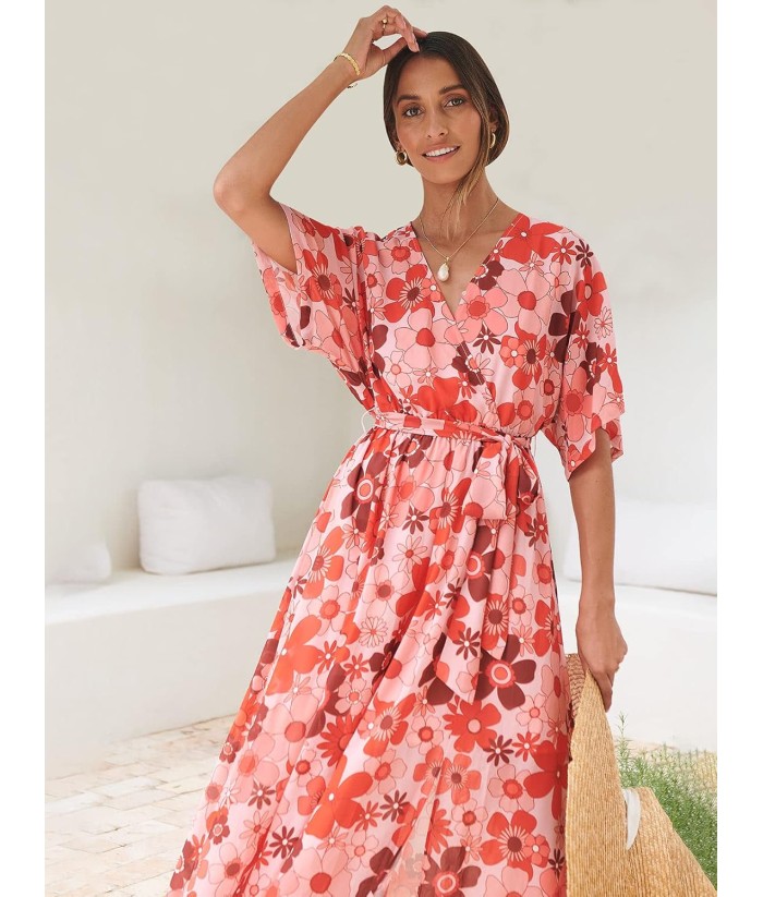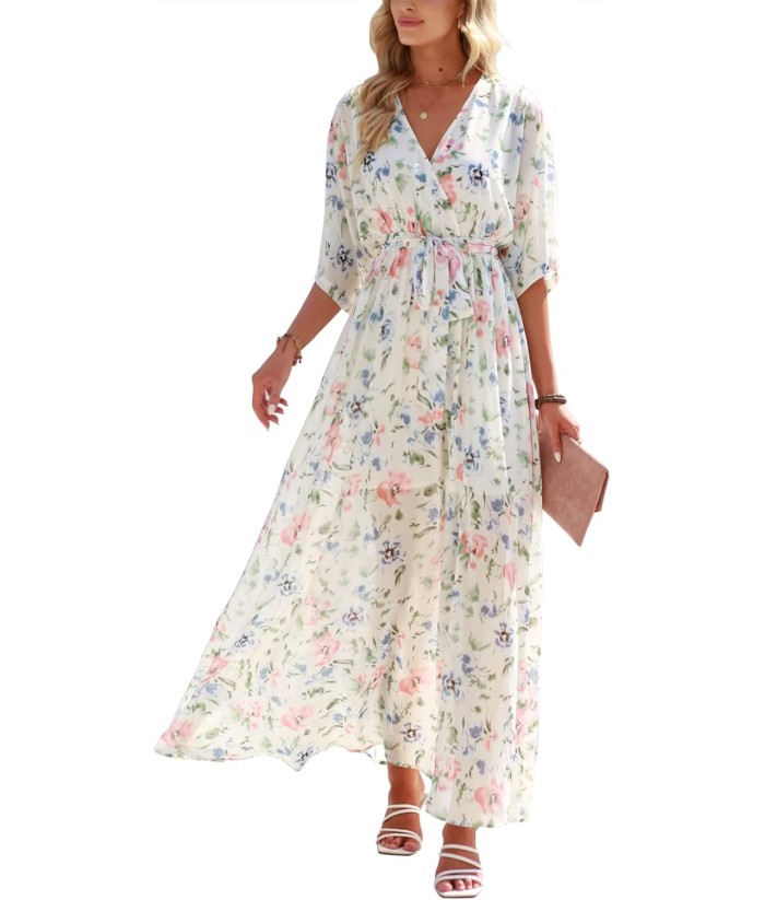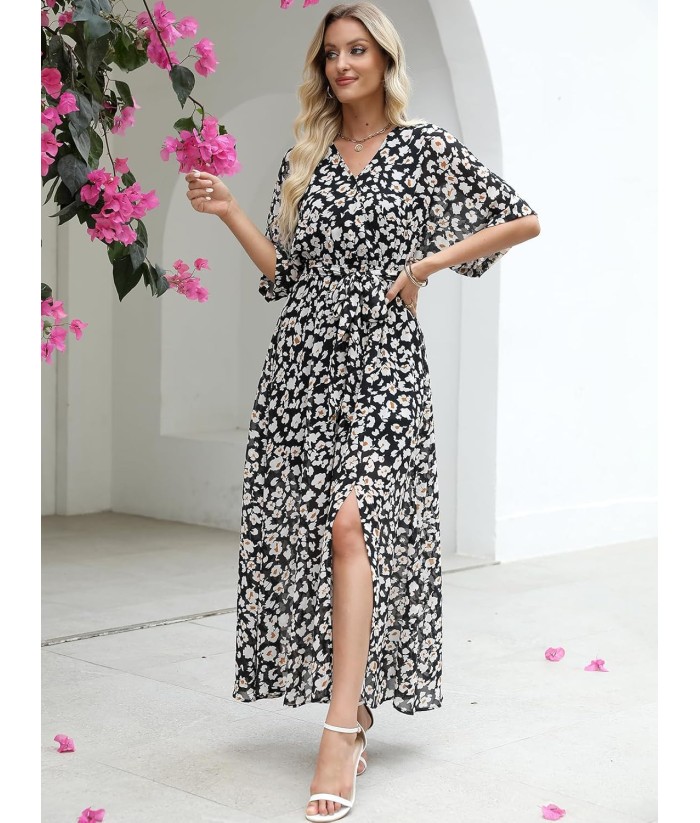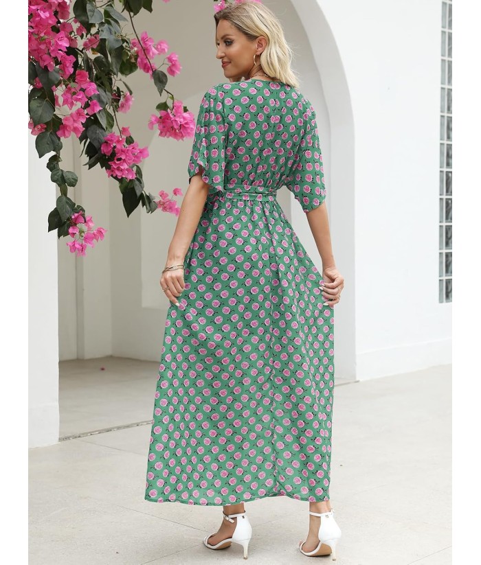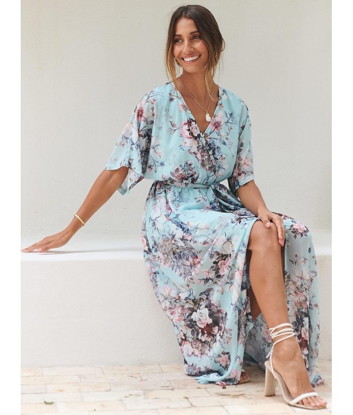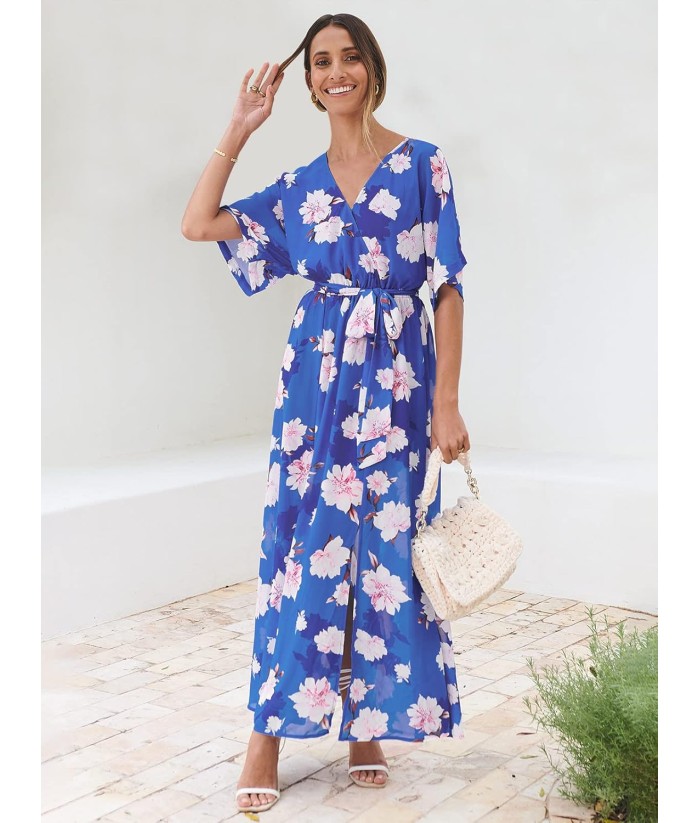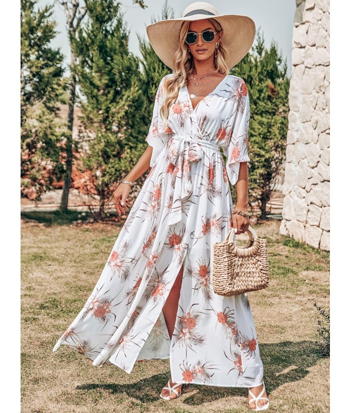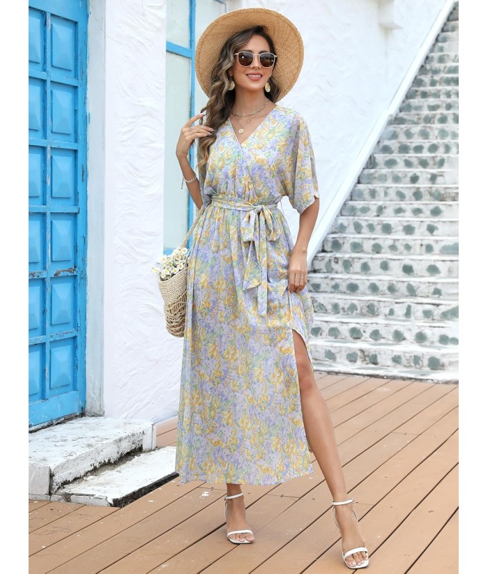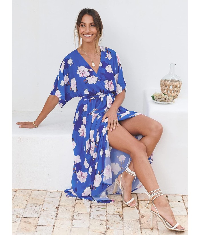 ANRABESS Women’s Summer Loose Boho Flowy Wrap V Neck 3/4 Sleeve Floral Print Slit Beach Wedding Guest Long Maxi Dresses