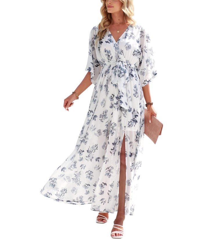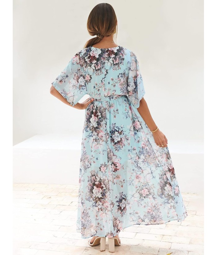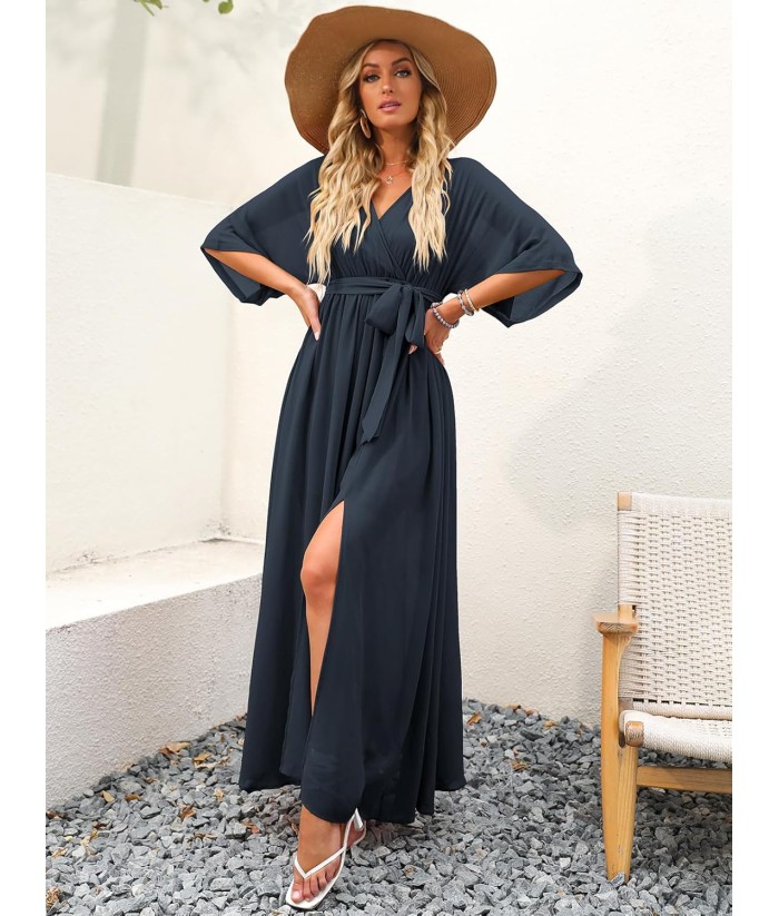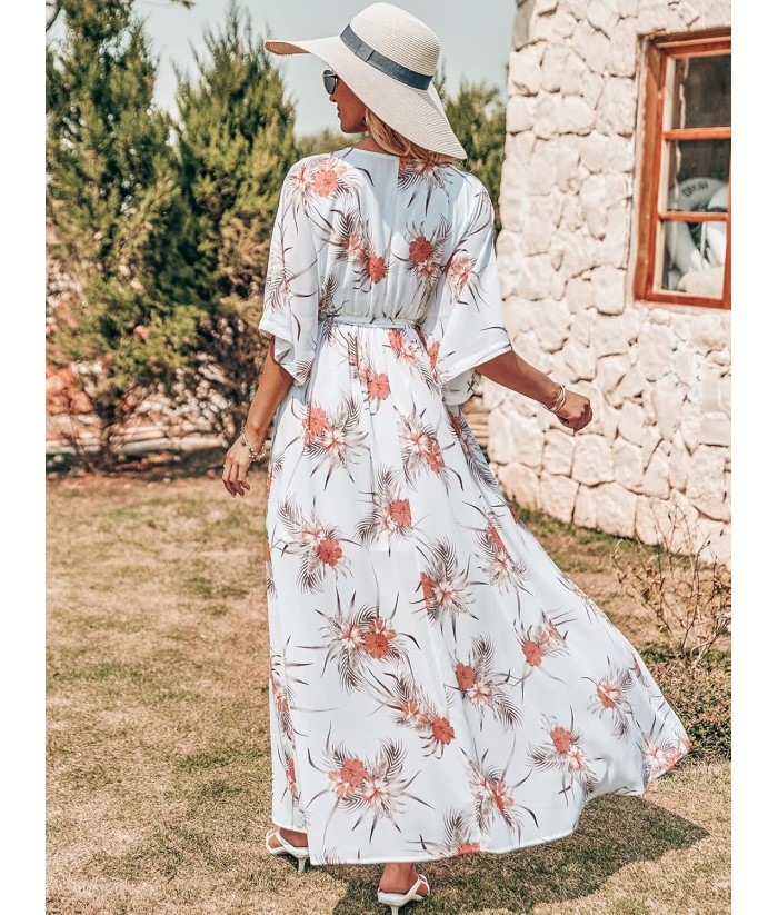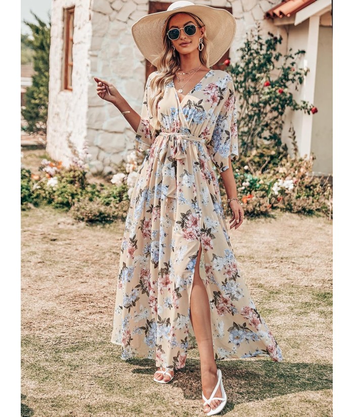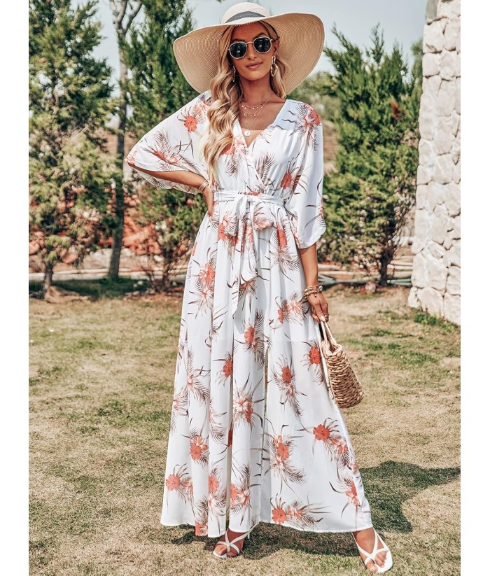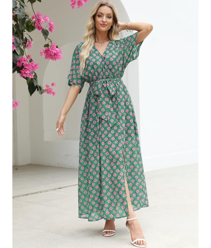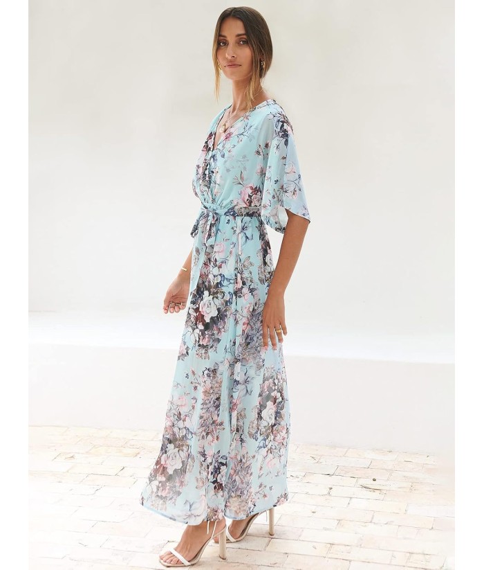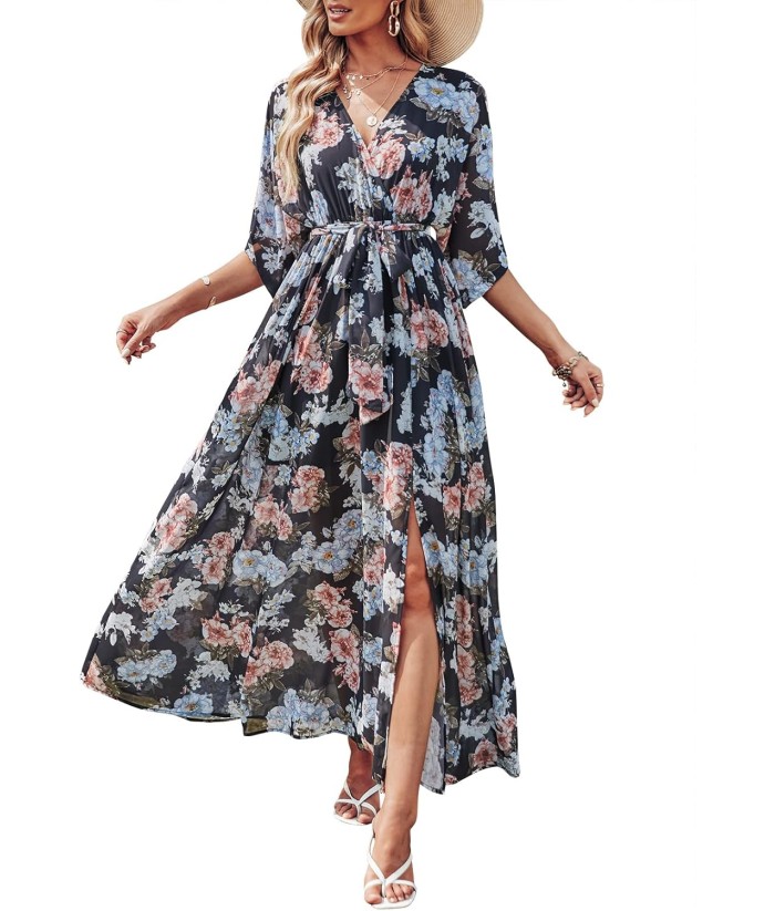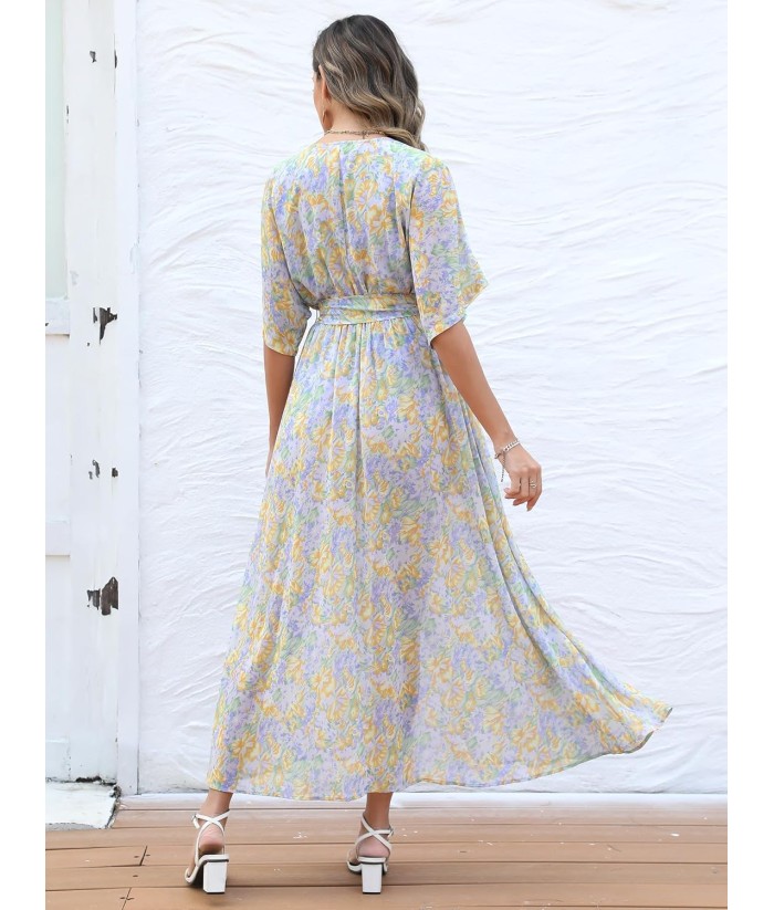 ANRABESS Women’s Summer Loose Boho Flowy Wrap V Neck 3/4 Sleeve Floral Print Slit Beach Wedding Guest Long Maxi Dresses