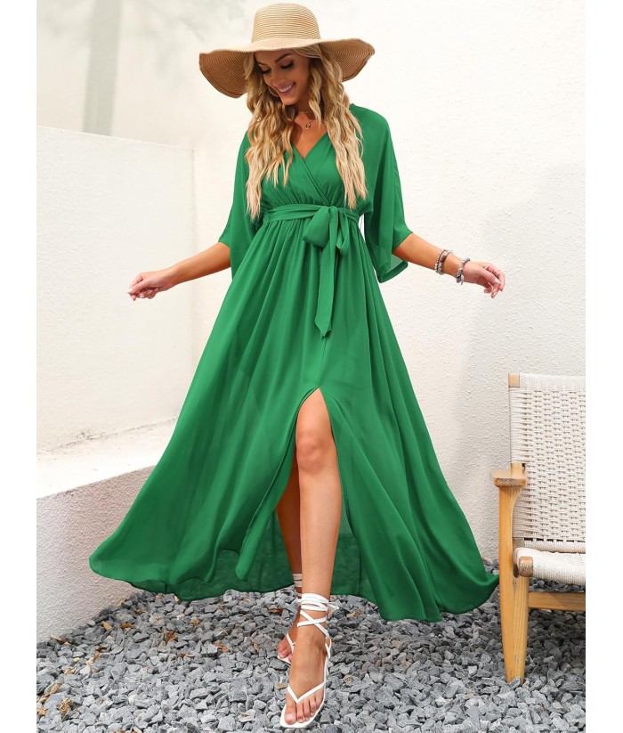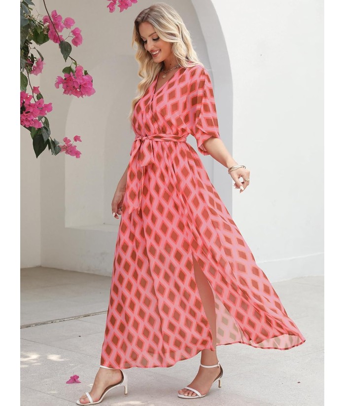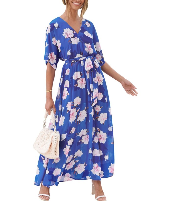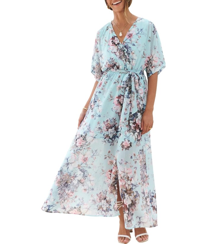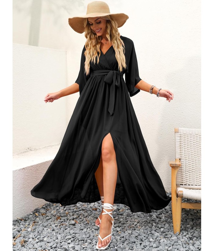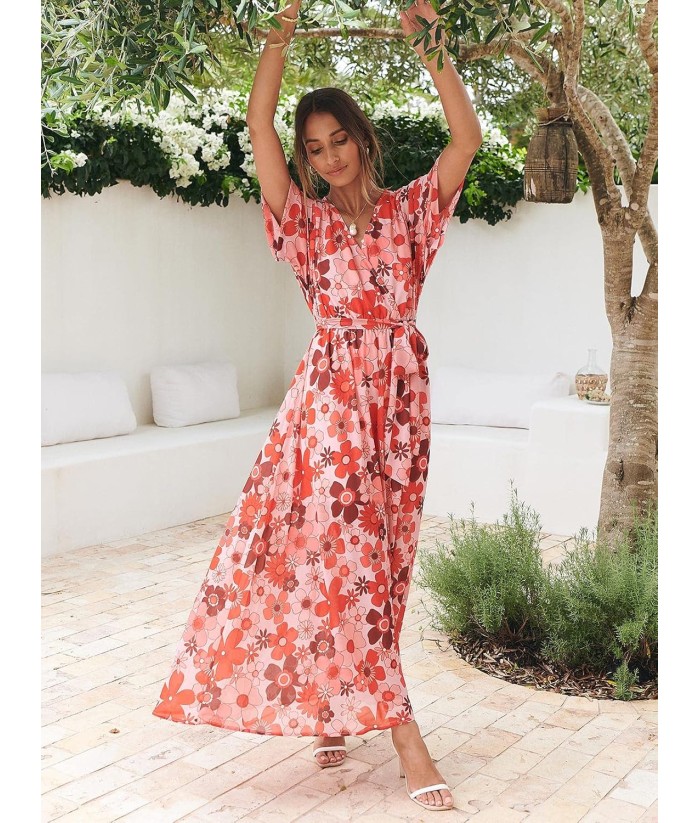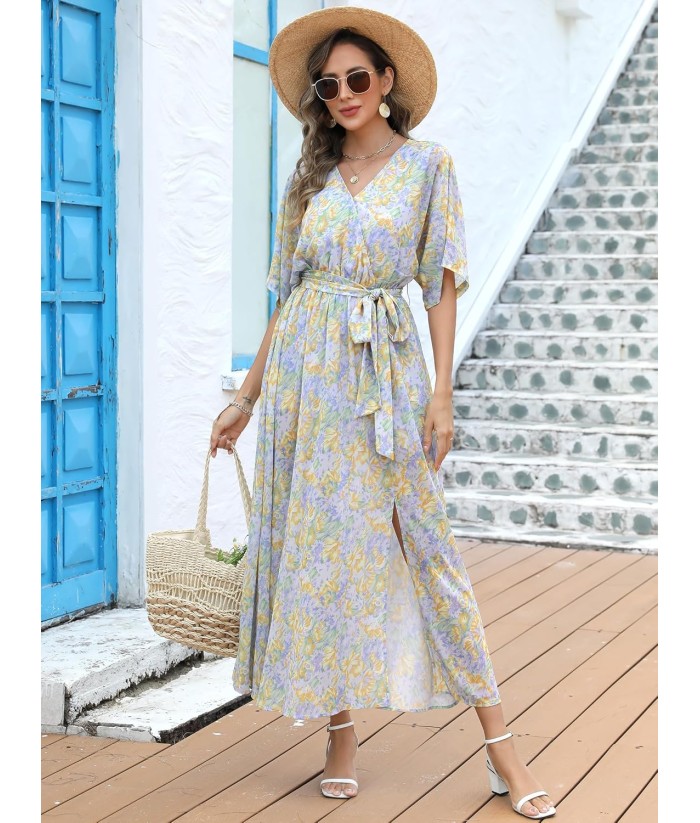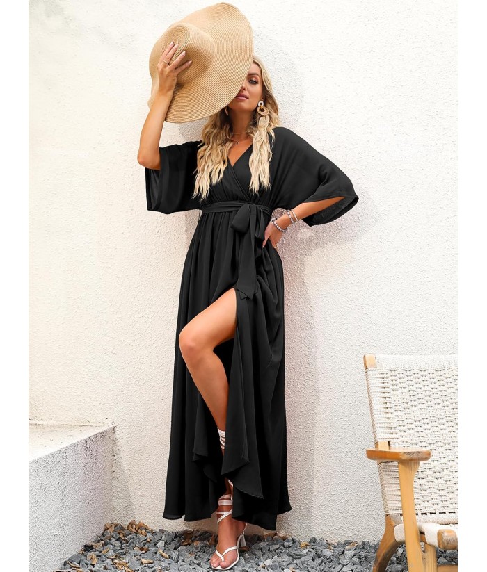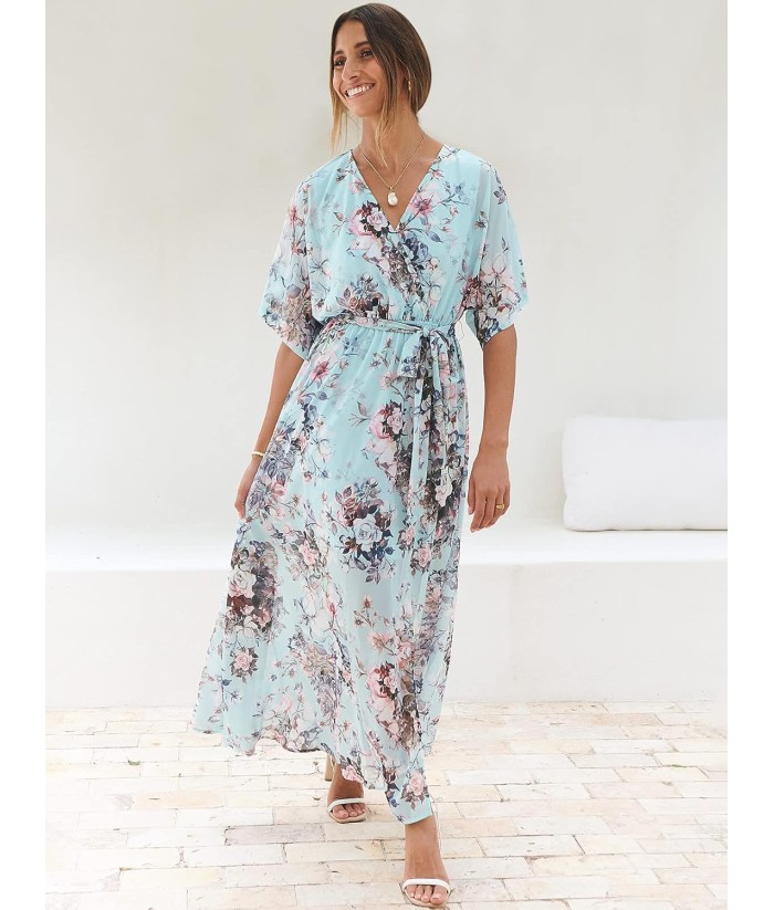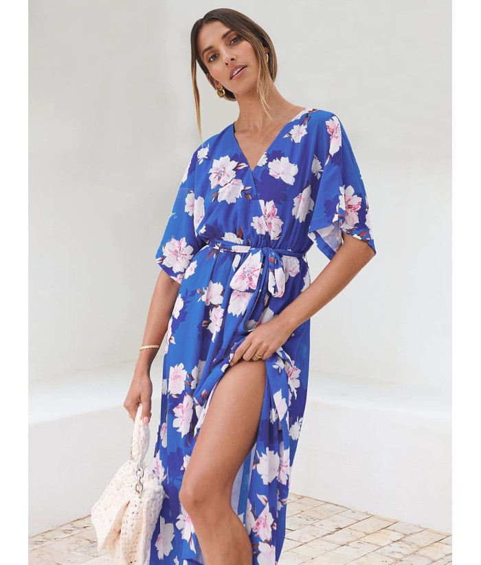 ANRABESS Women’s Summer Loose Boho Flowy Wrap V Neck 3/4 Sleeve Floral Print Slit Beach Wedding Guest Long Maxi Dresses