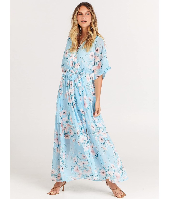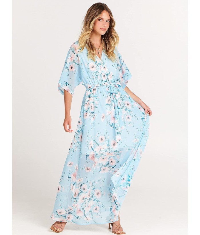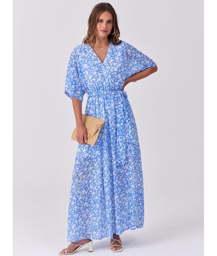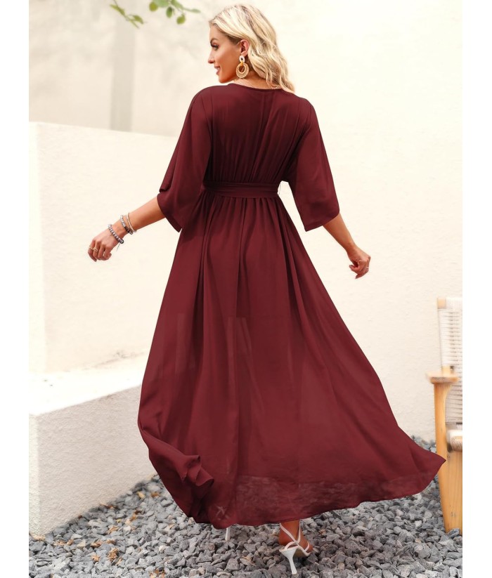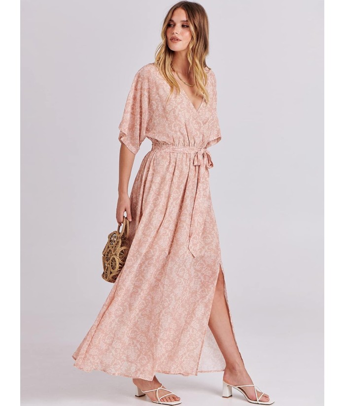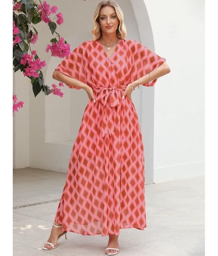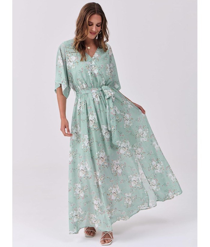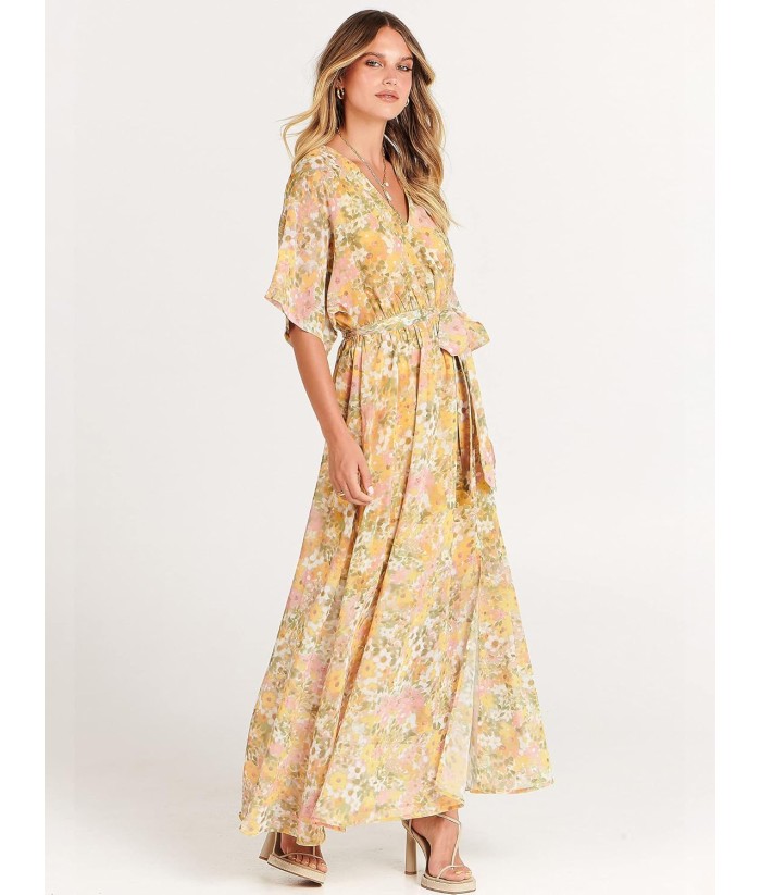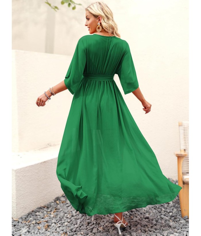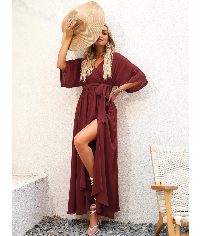 ANRABESS Women’s Summer Loose Boho Flowy Wrap V Neck 3/4 Sleeve Floral Print Slit Beach Wedding Guest Long Maxi Dresses