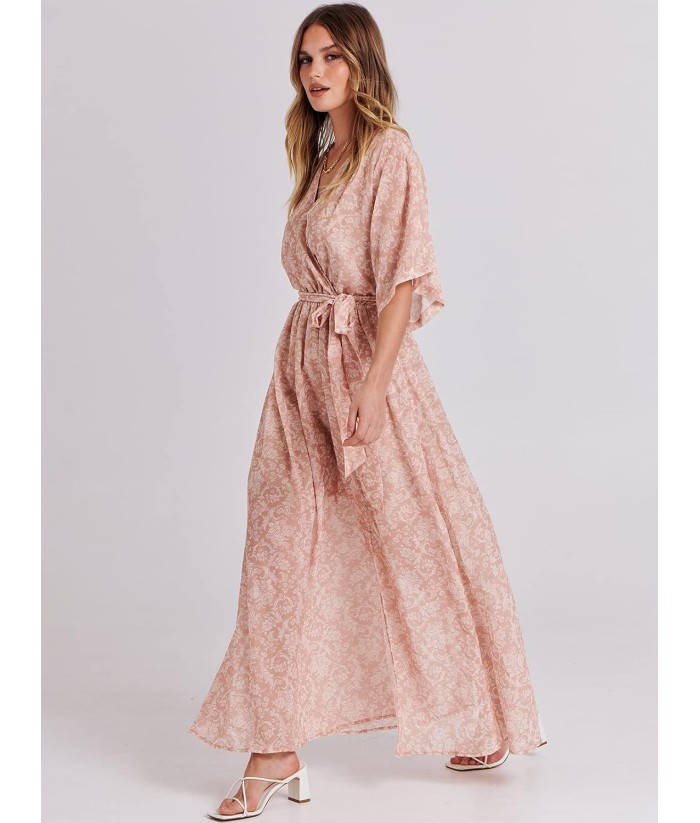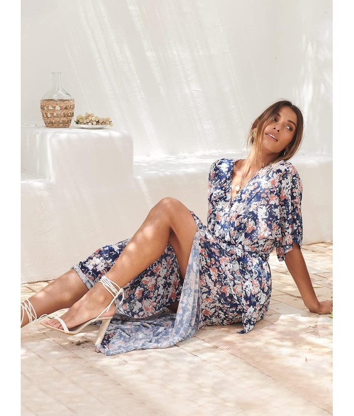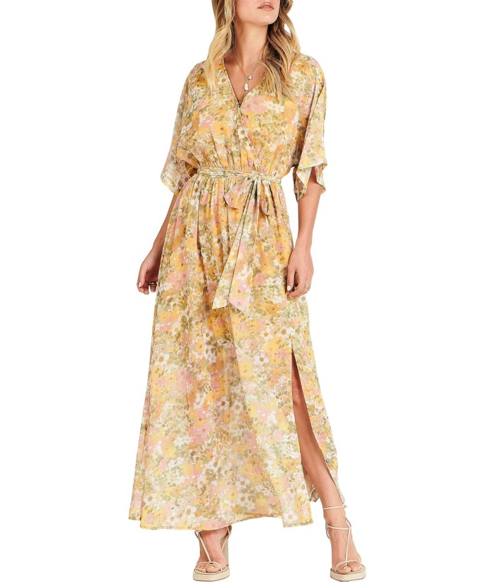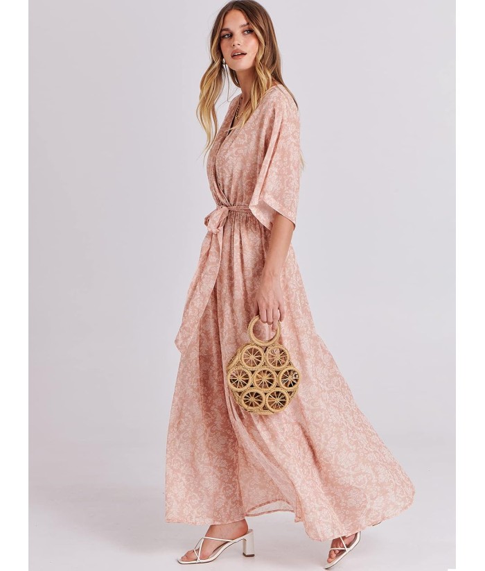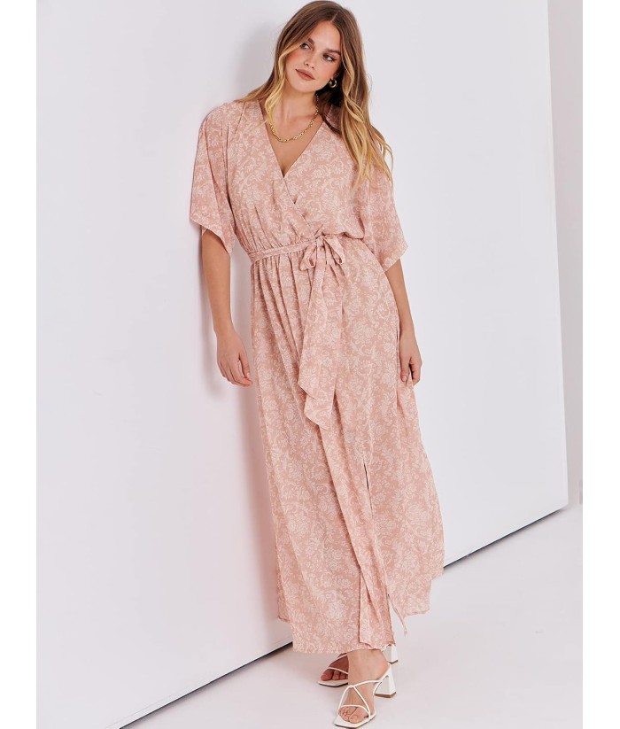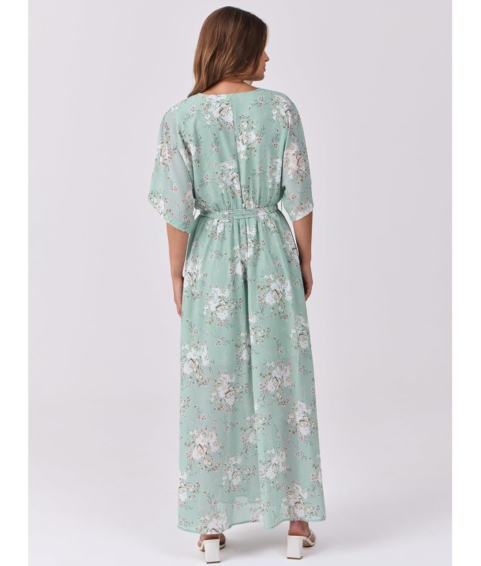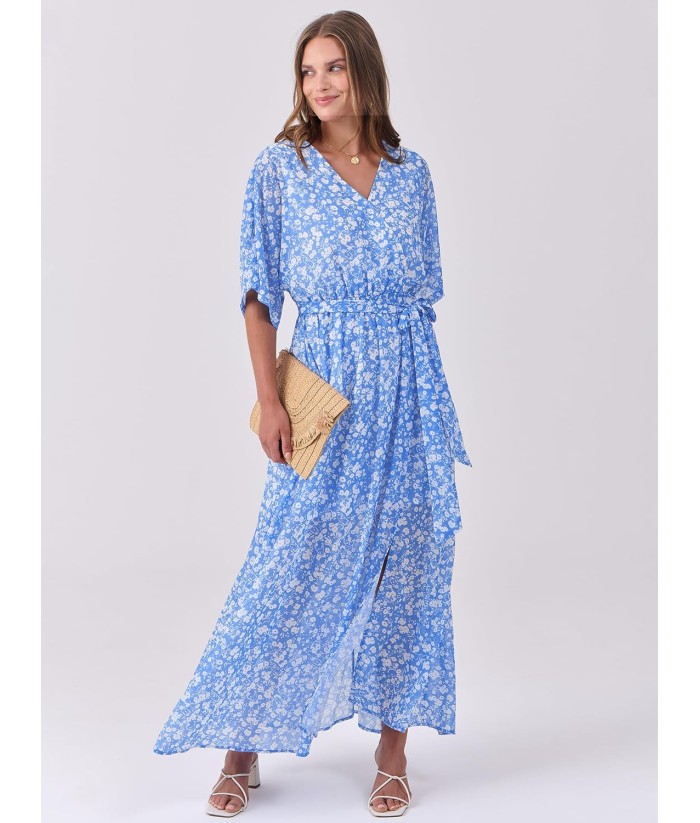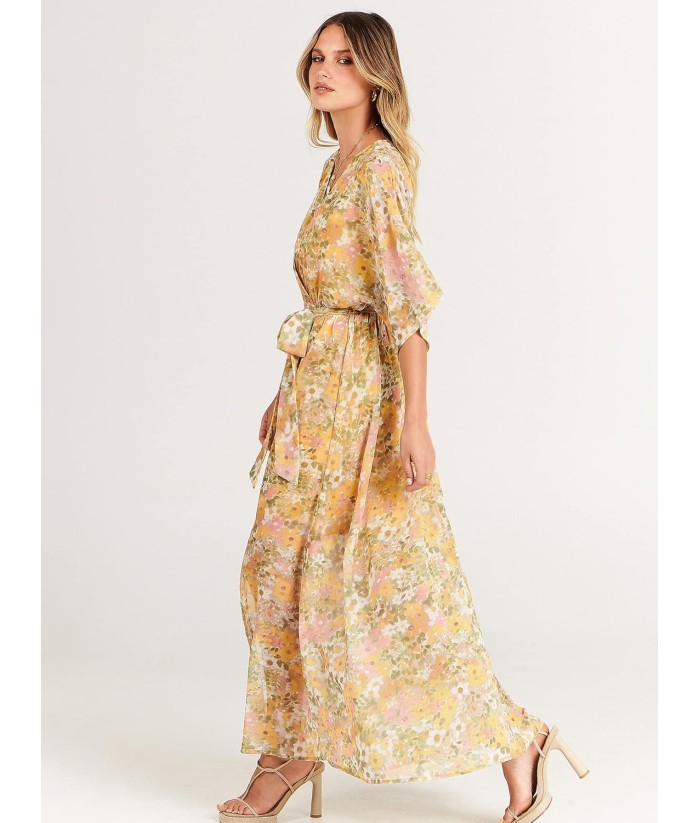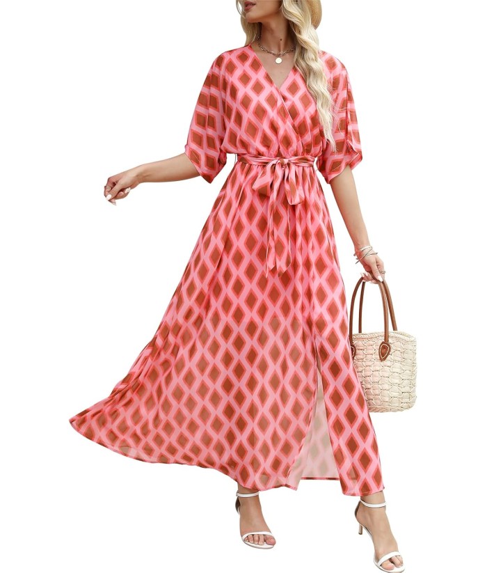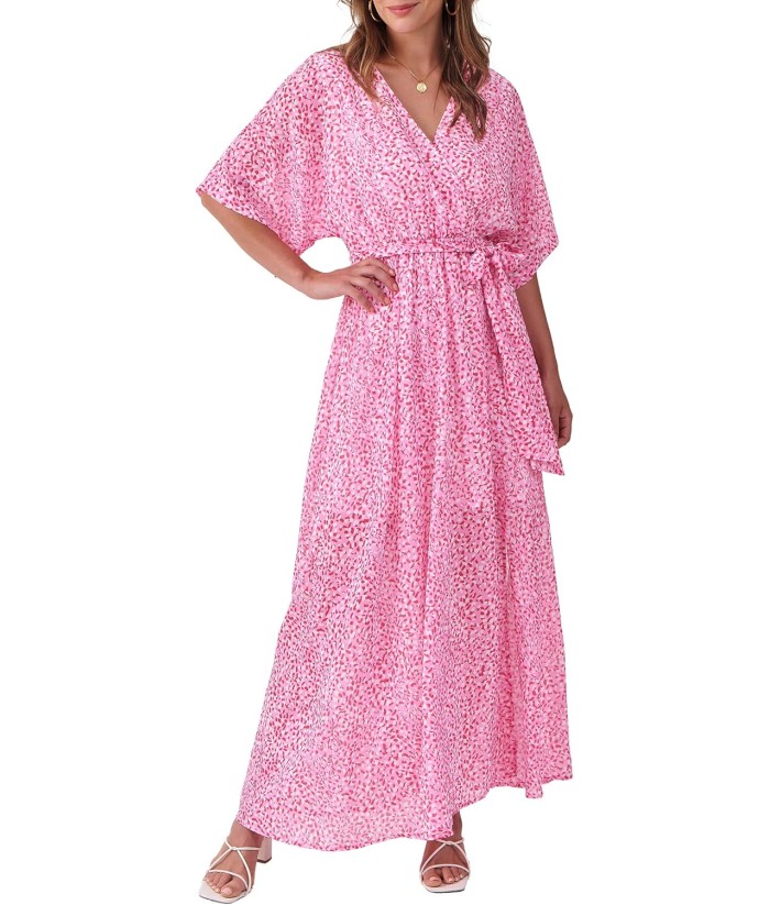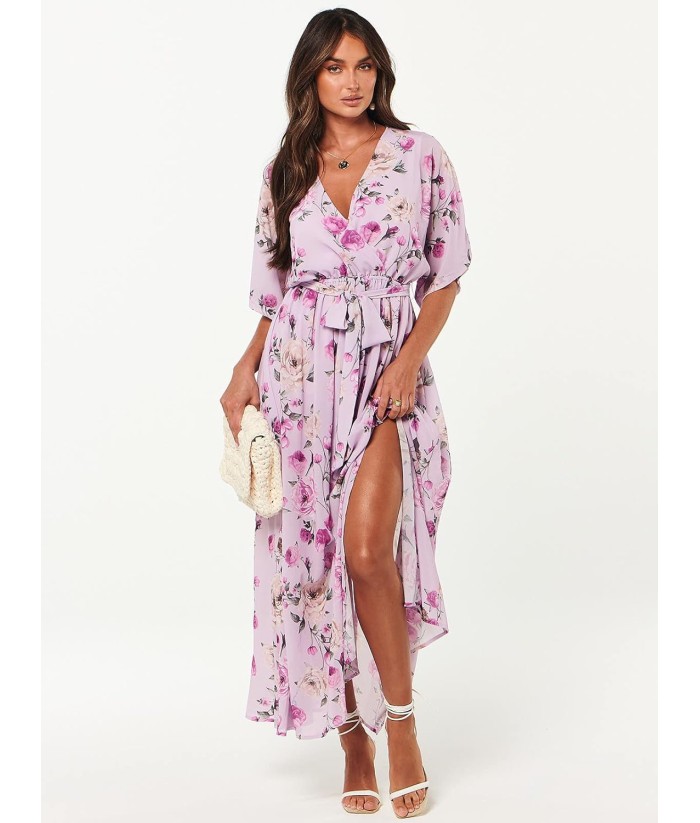 ANRABESS Women’s Summer Loose Boho Flowy Wrap V Neck 3/4 Sleeve Floral Print Slit Beach Wedding Guest Long Maxi Dresses