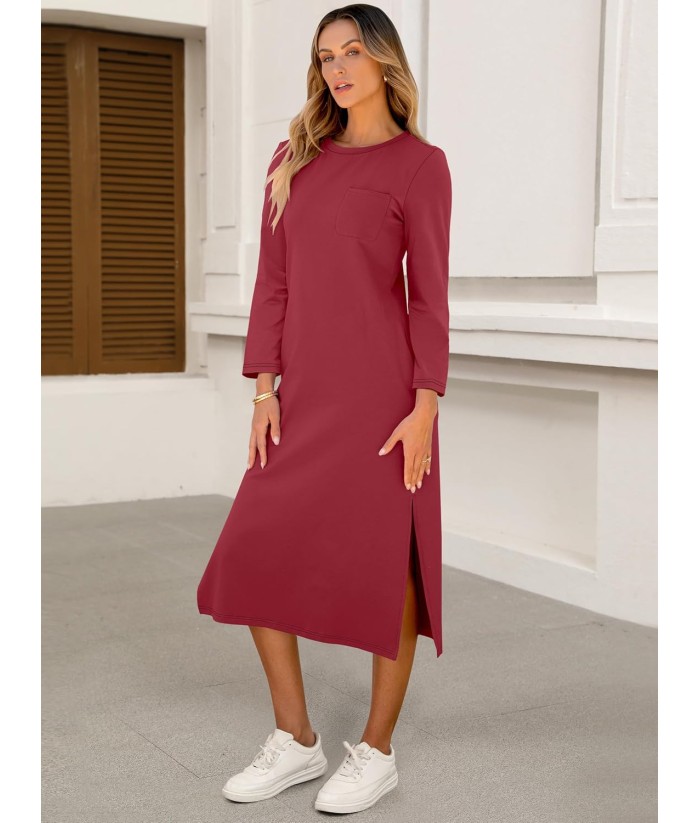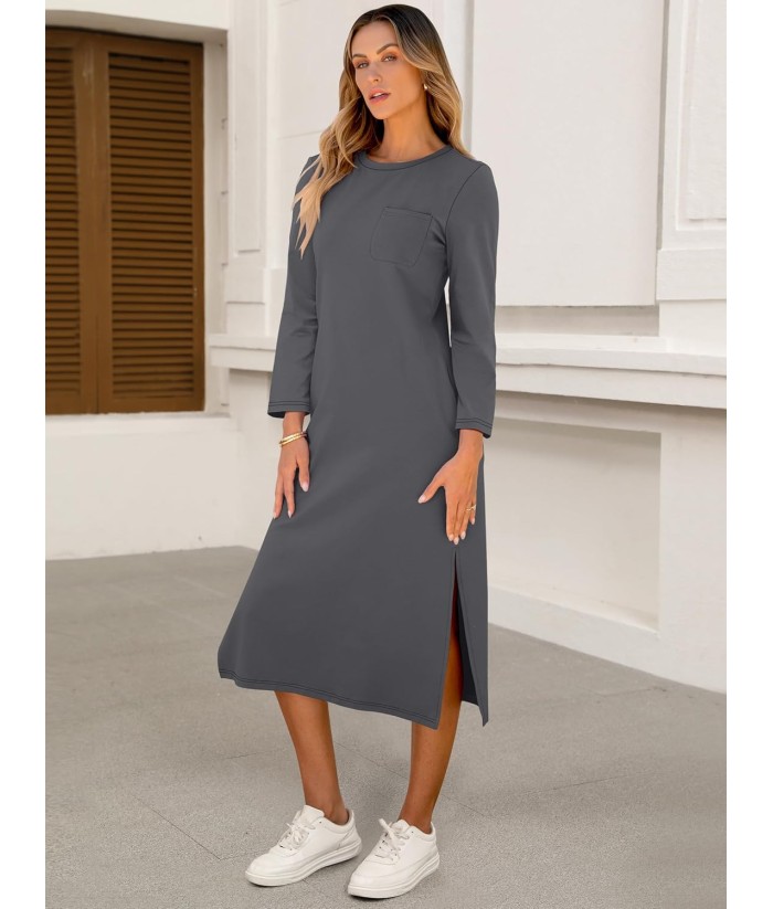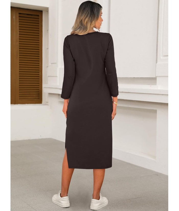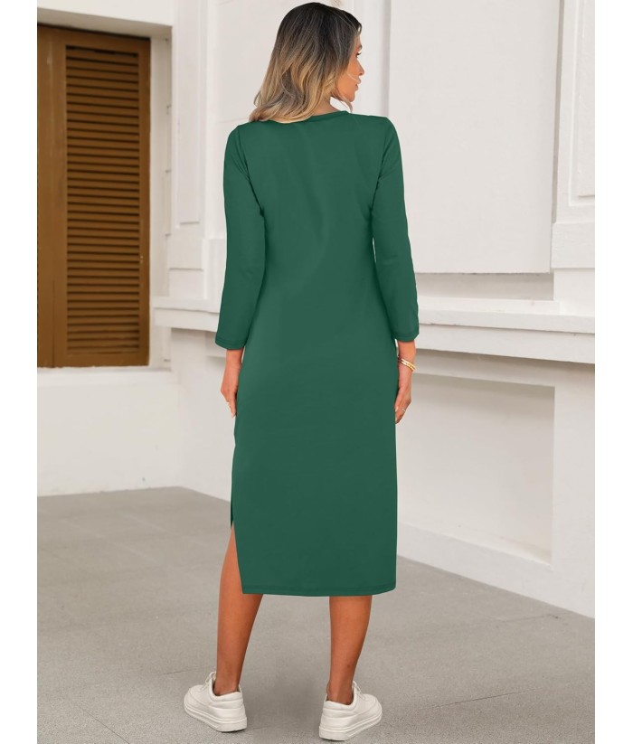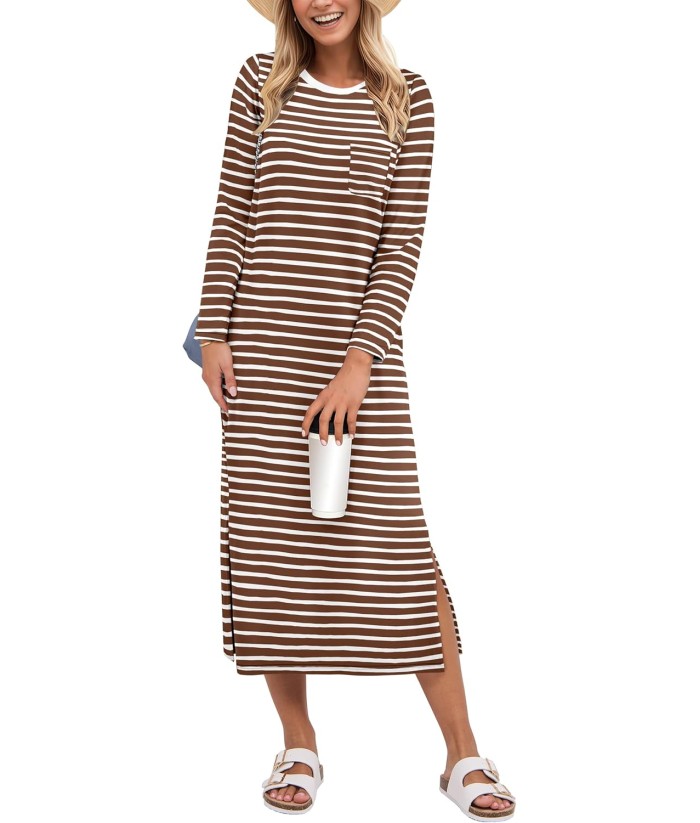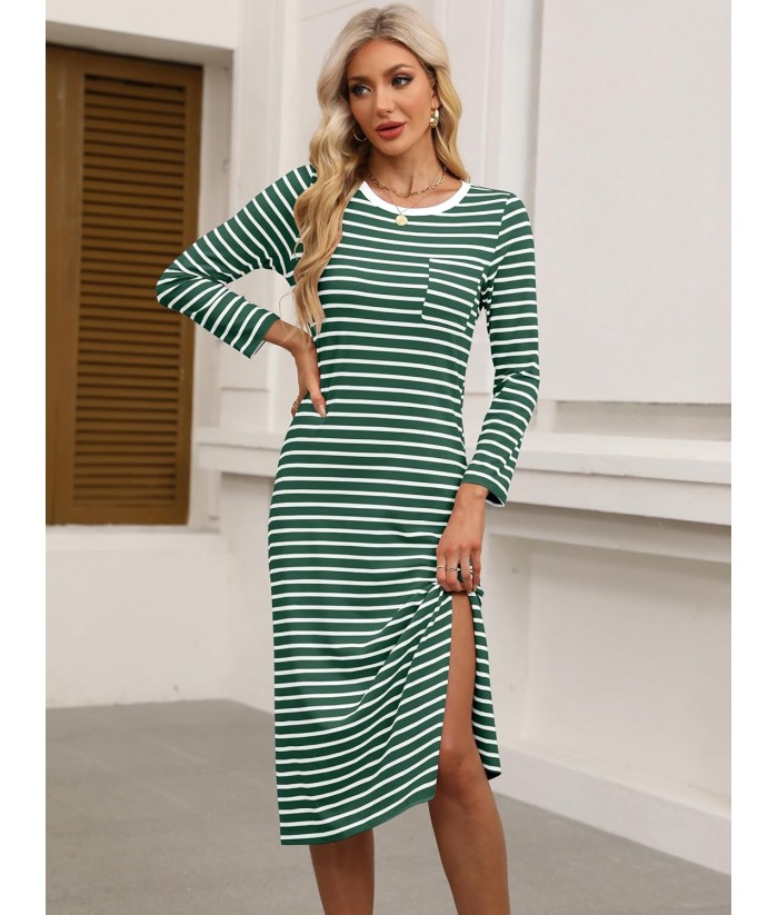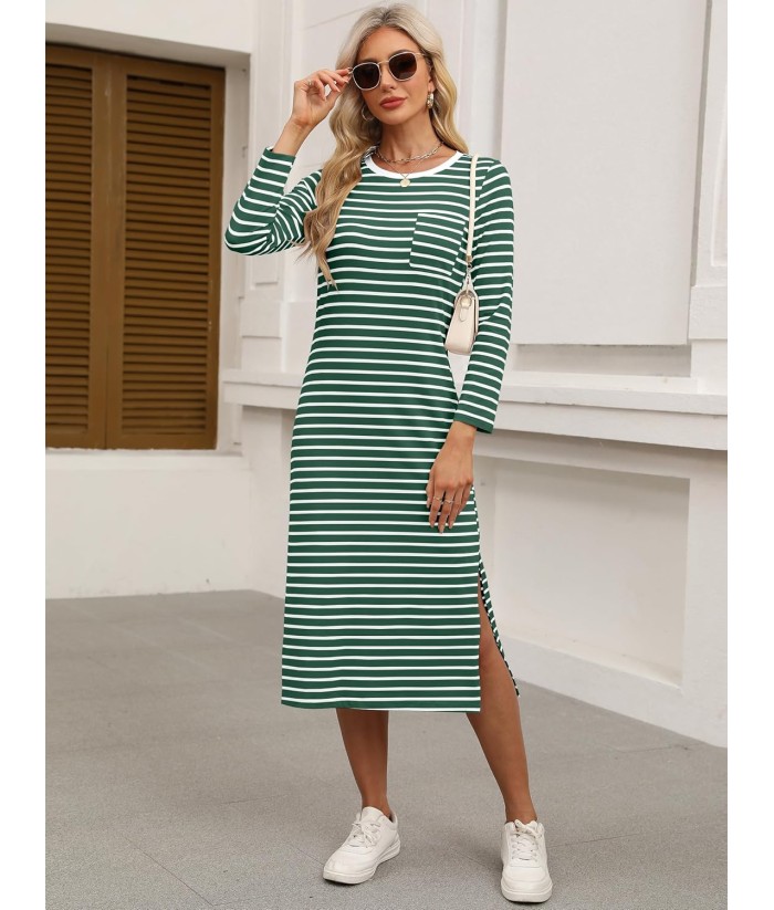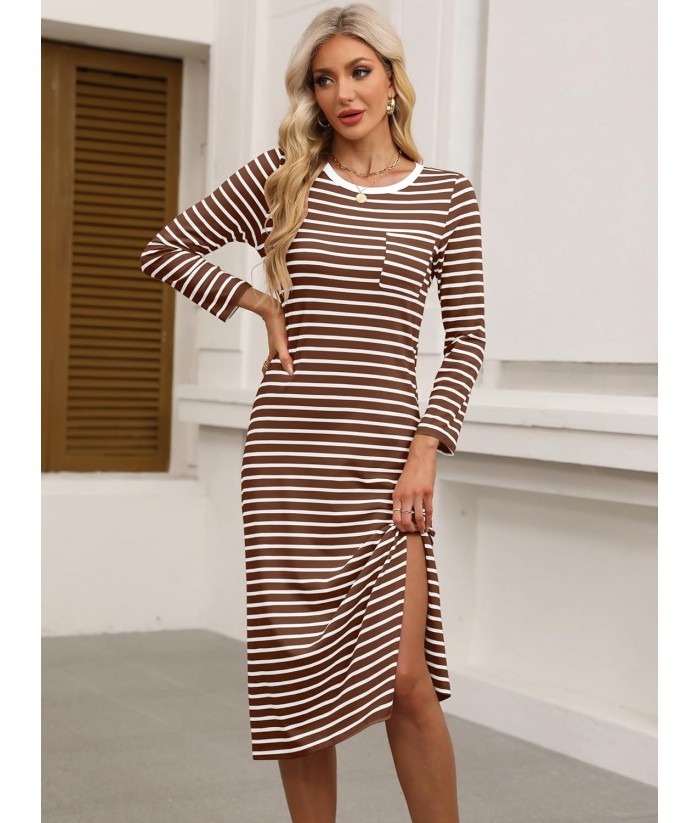 ANRABESS Womens 3/4 Long Sleeve Striped Slit Midi T Shirt Dresses with Pockets 2025 Dressy Casual Fall Fashion Travel Outfits