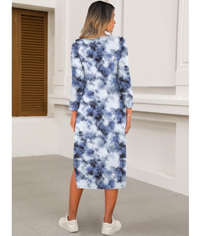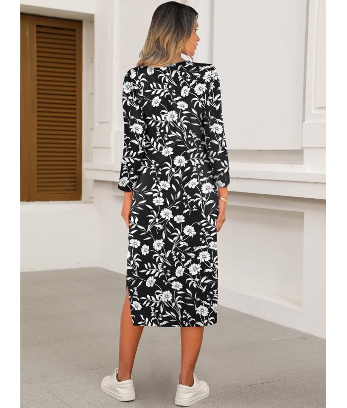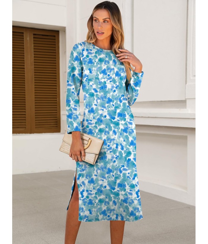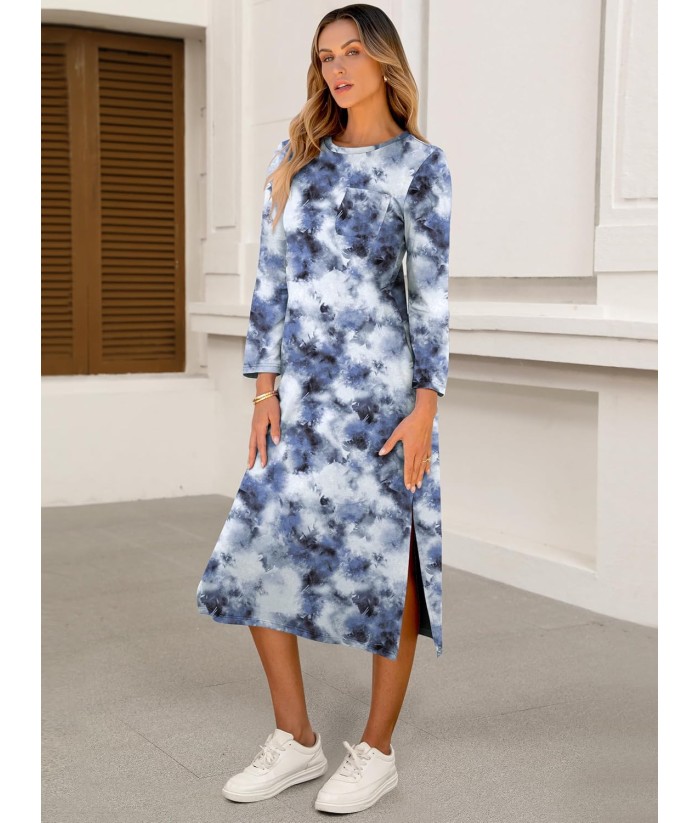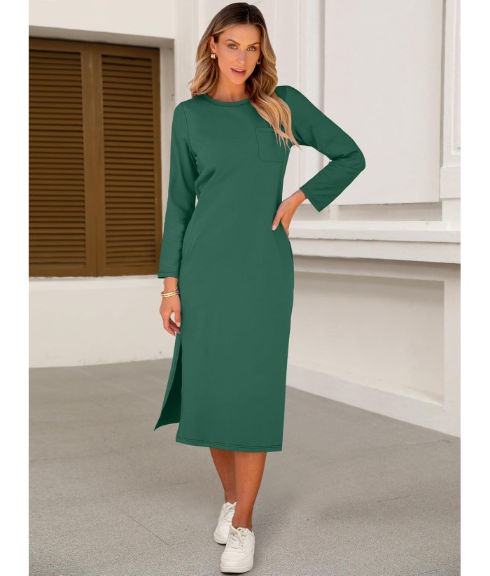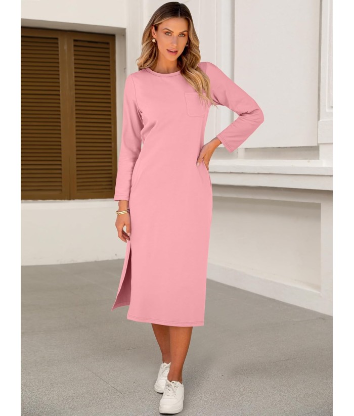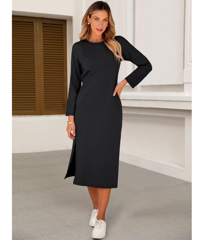 ANRABESS Womens 3/4 Long Sleeve Striped Slit Midi T Shirt Dresses with Pockets 2025 Dressy Casual Fall Fashion Travel Outfits