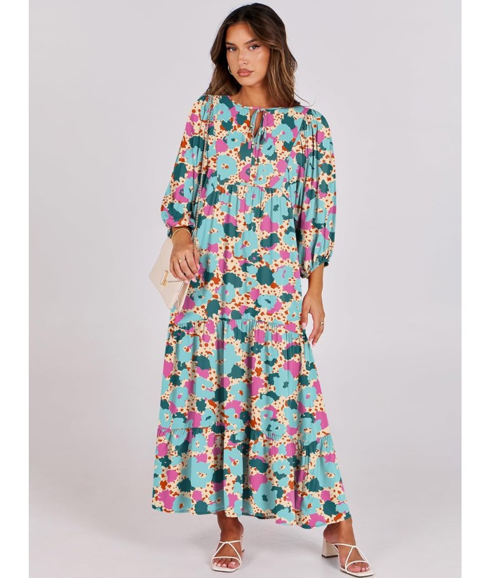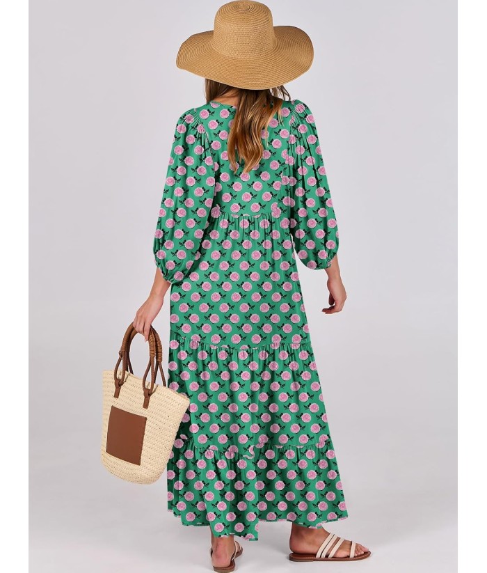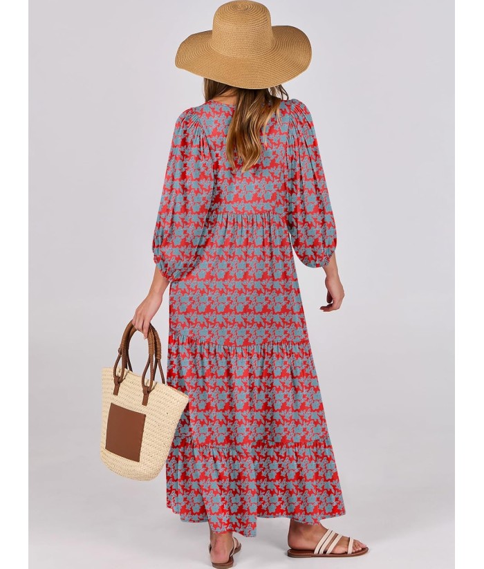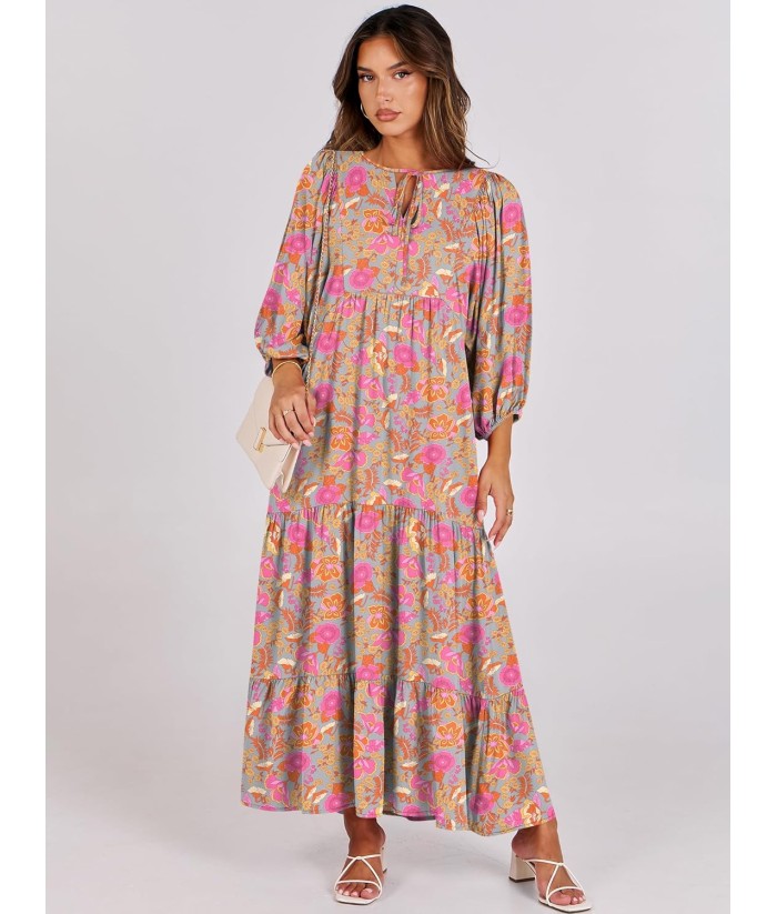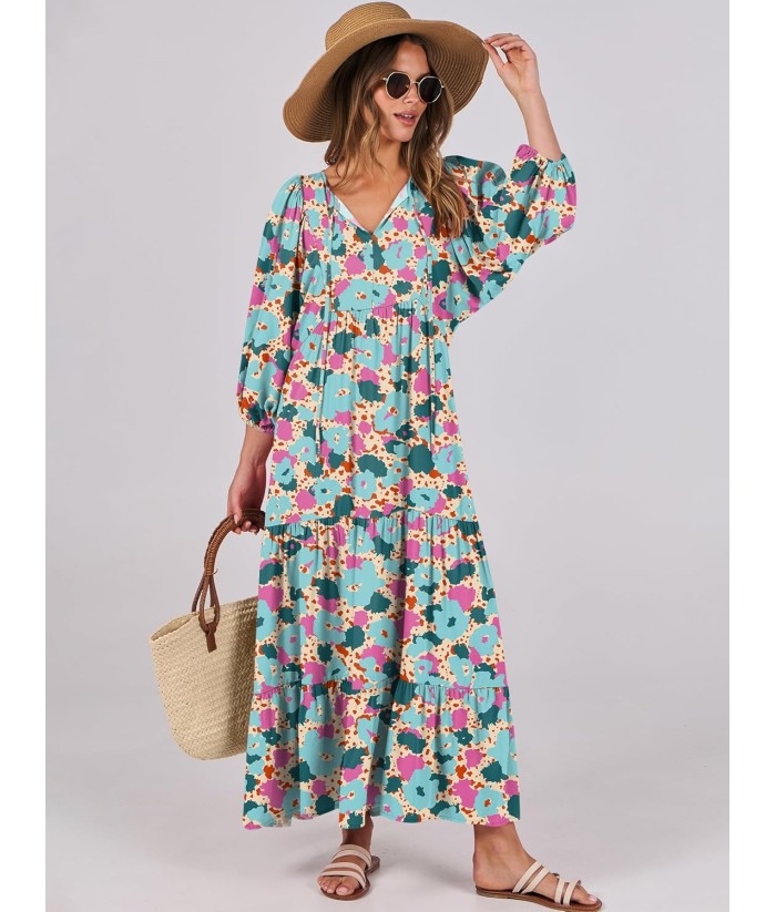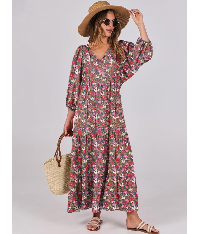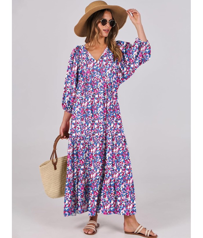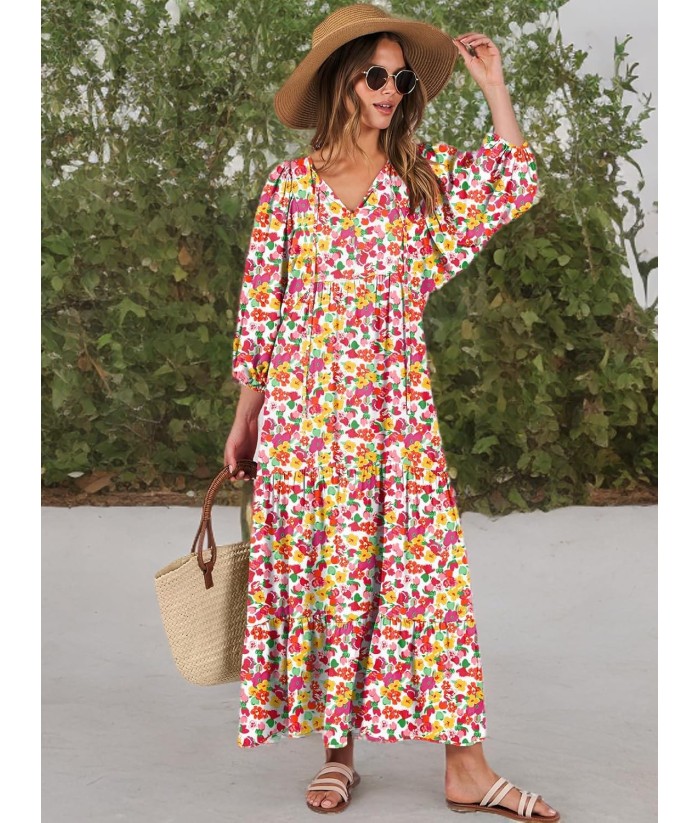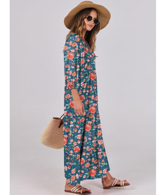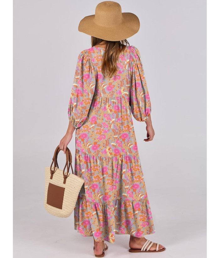ANRABESS Womens Boho Maxi Dresses 2025 Summer V Neck Puff Sleeve Floral Flowy Swing Fall Casual Long Dress