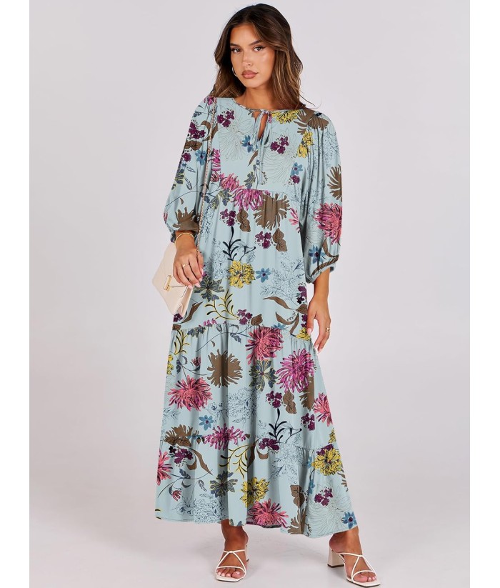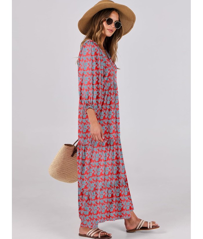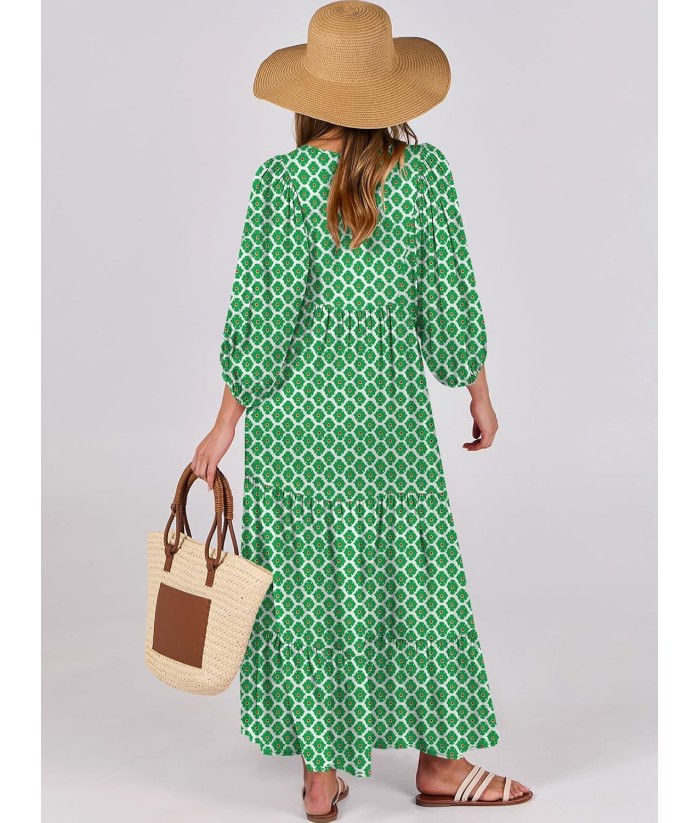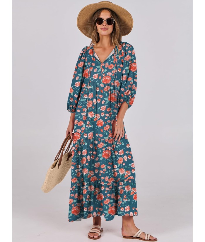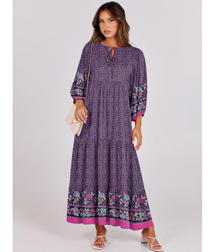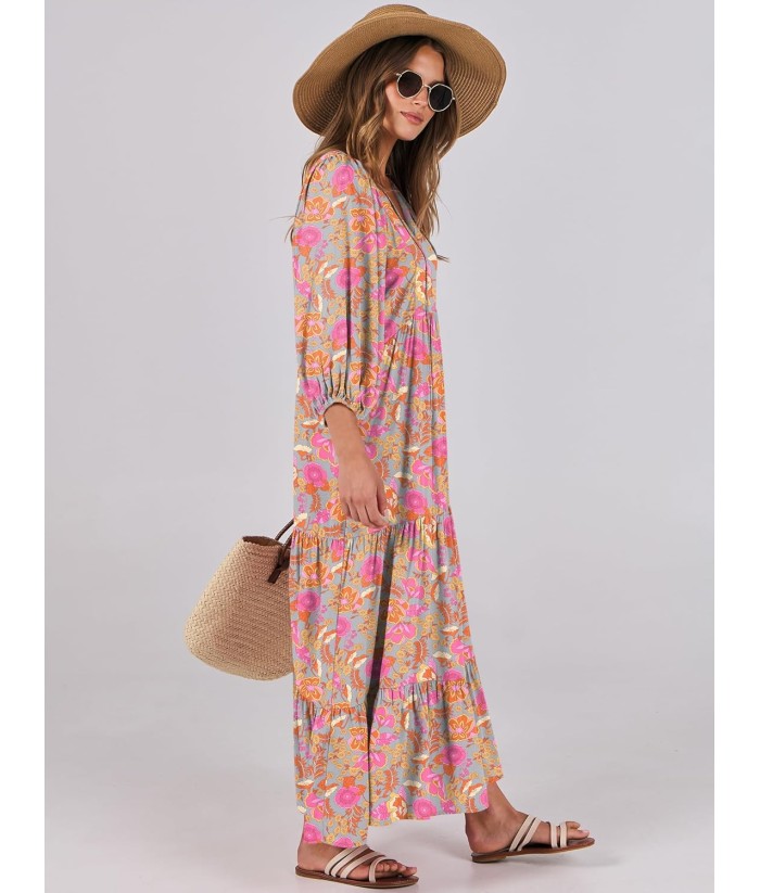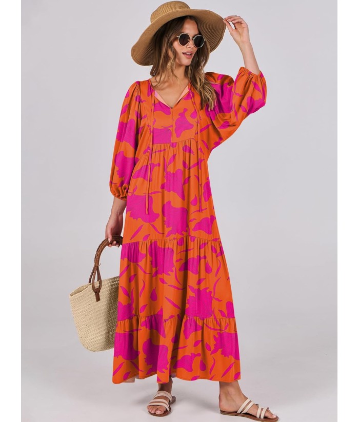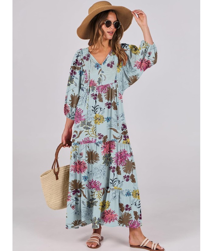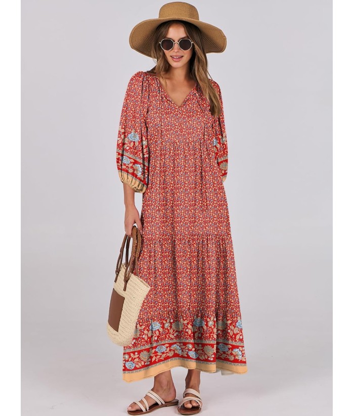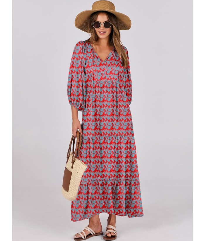 ANRABESS Womens Boho Maxi Dresses 2025 Summer V Neck Puff Sleeve Floral Flowy Swing Fall Casual Long Dress