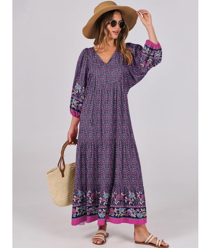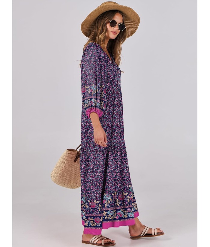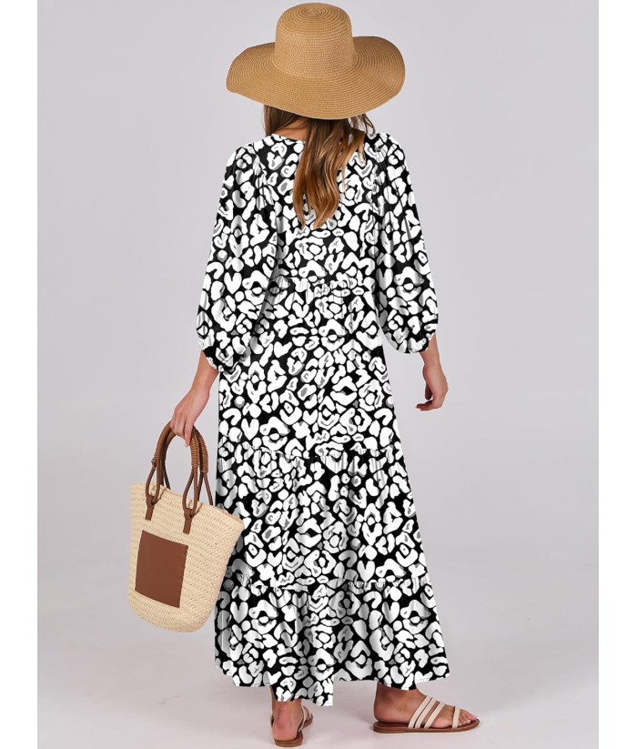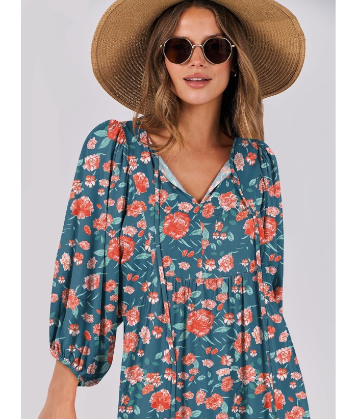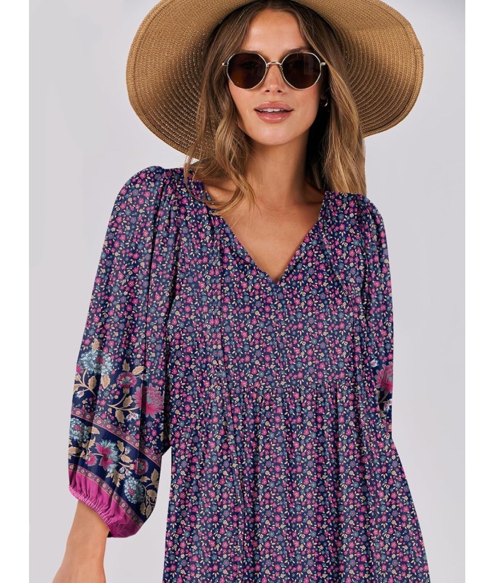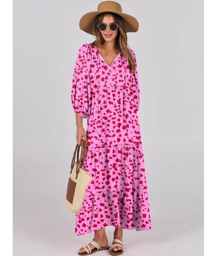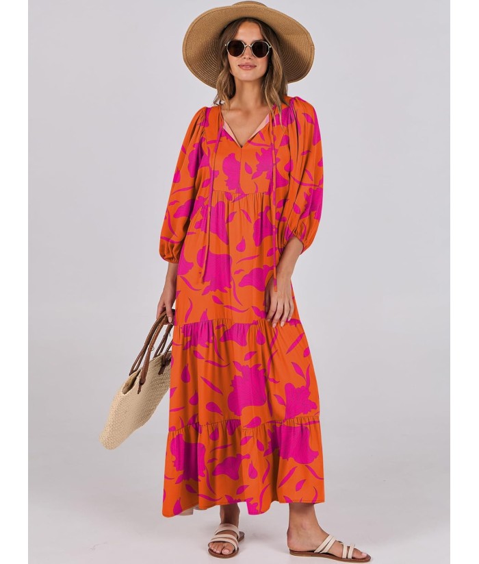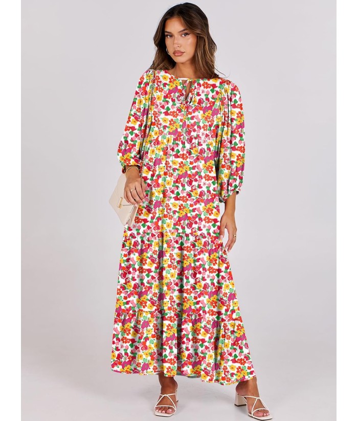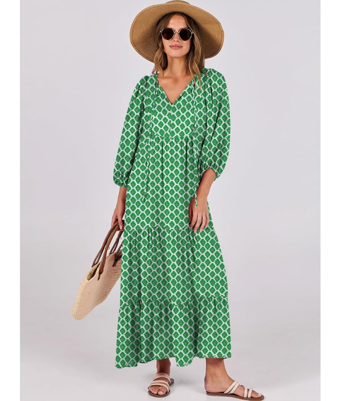 ANRABESS Womens Boho Maxi Dresses 2025 Summer V Neck Puff Sleeve Floral Flowy Swing Fall Casual Long Dress