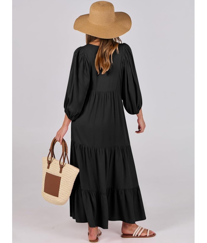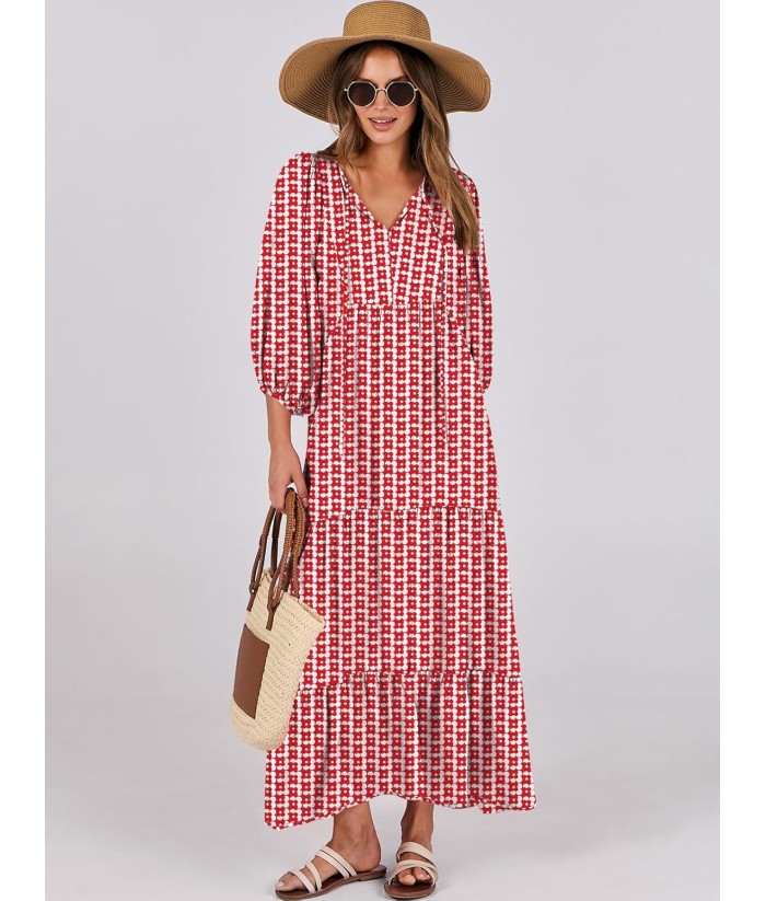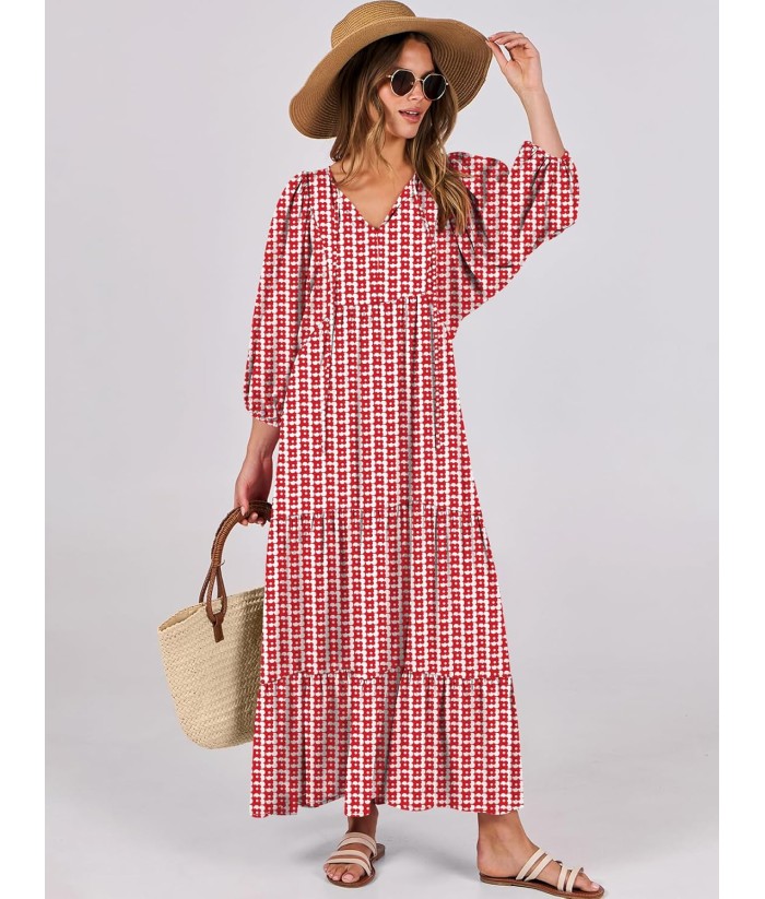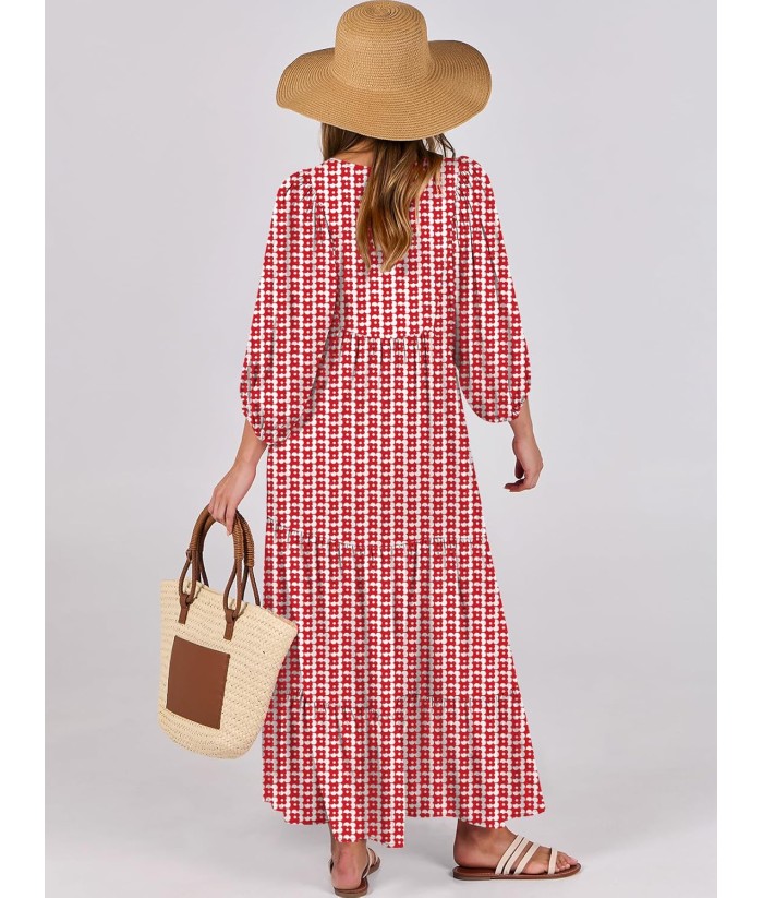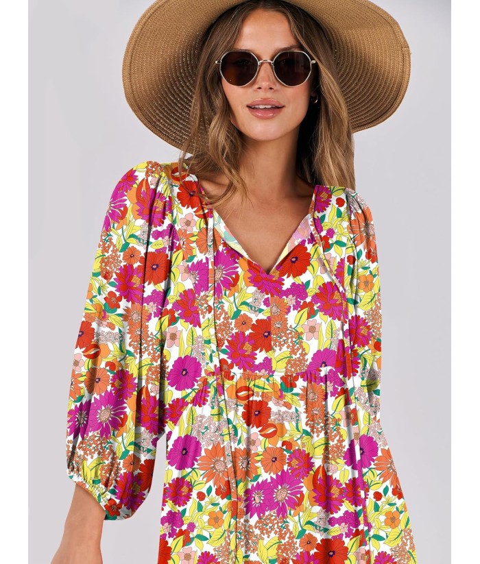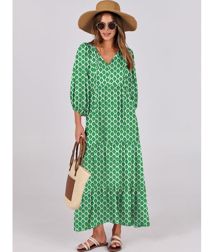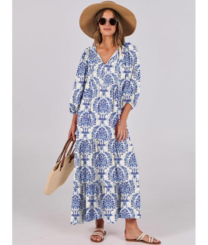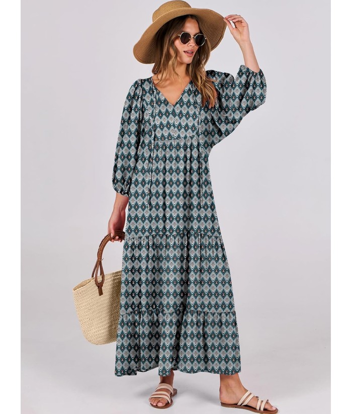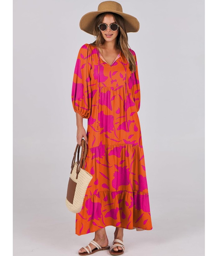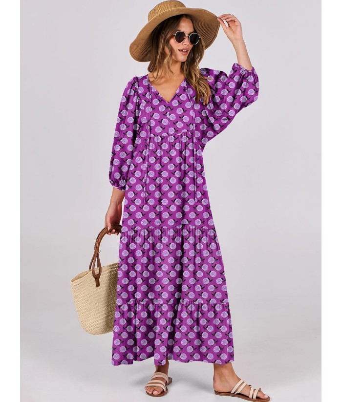 ANRABESS Womens Boho Maxi Dresses 2025 Summer V Neck Puff Sleeve Floral Flowy Swing Fall Casual Long Dress