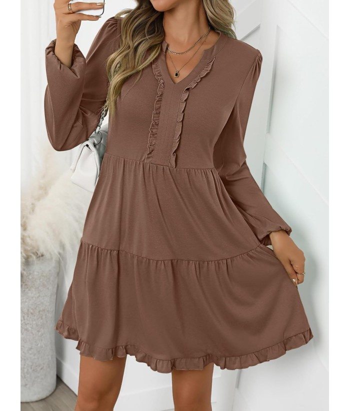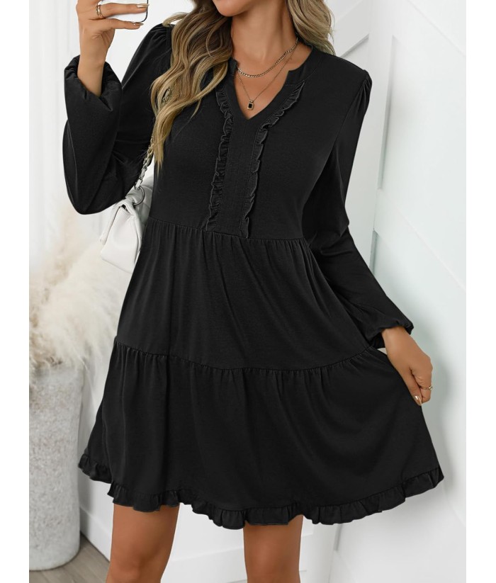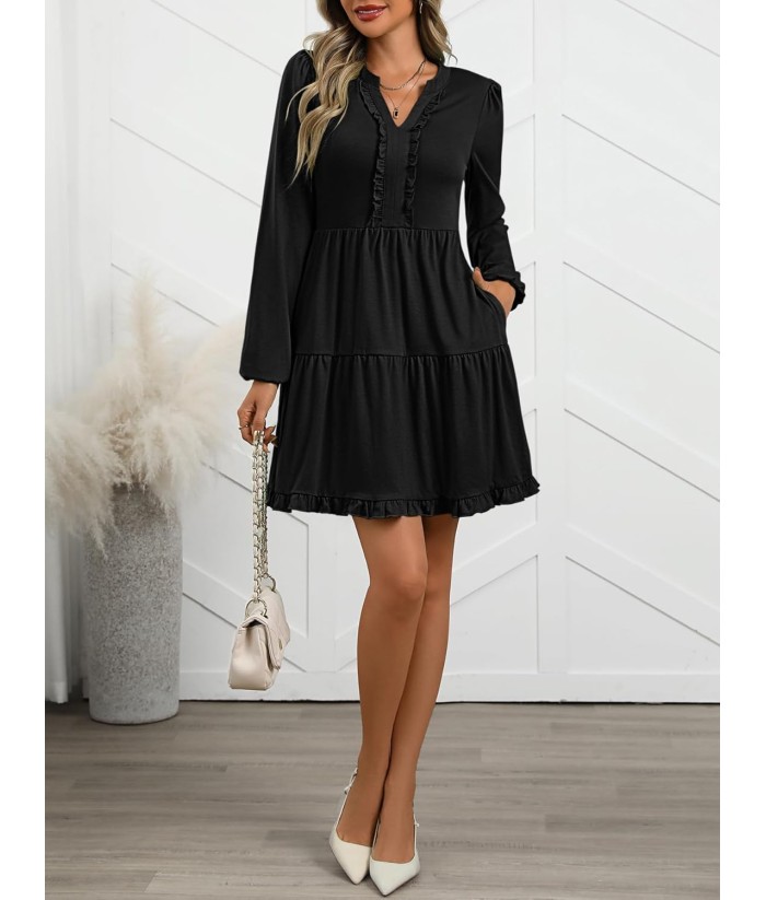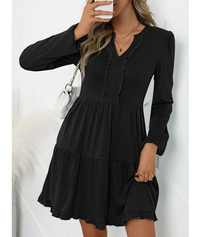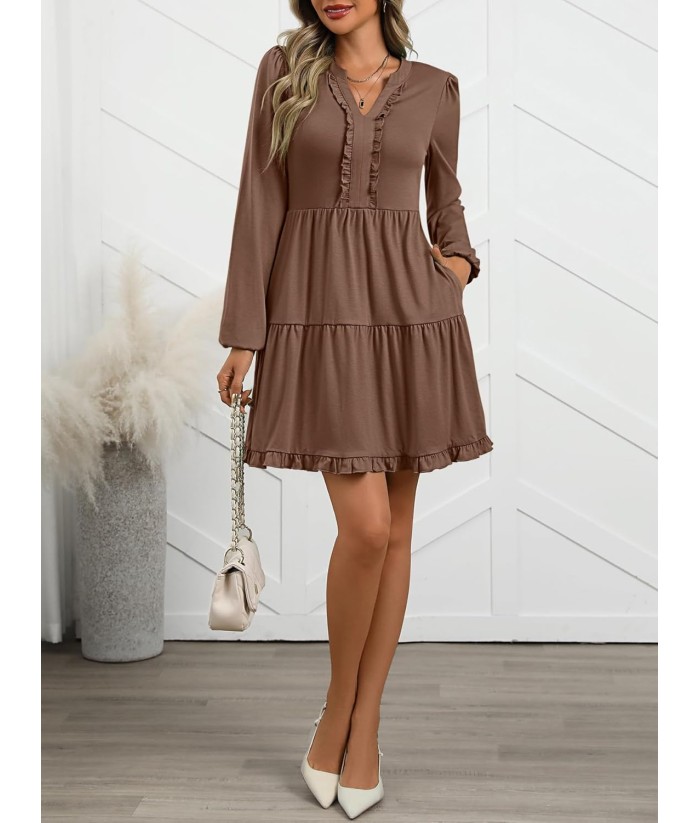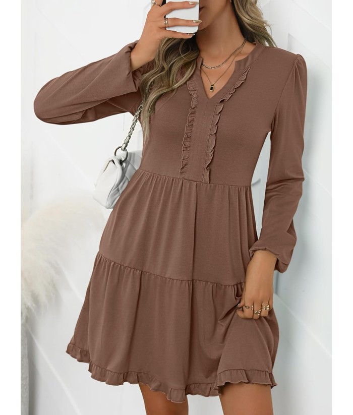 ANRABESS Womens Long Sleeve Dress 2025 Fall Casual V Neck Tiered Flowy Swing Short Mini Dresses Beach Travel Vacation Outfits