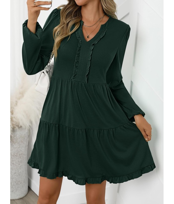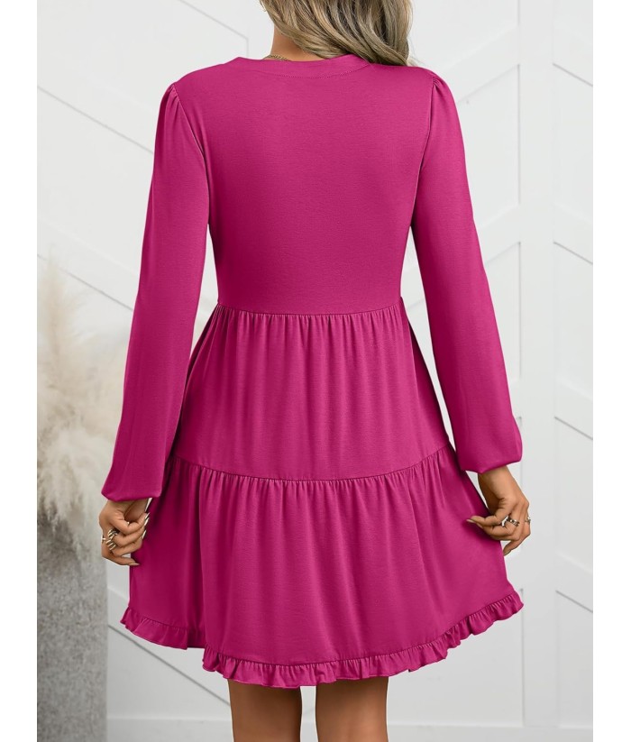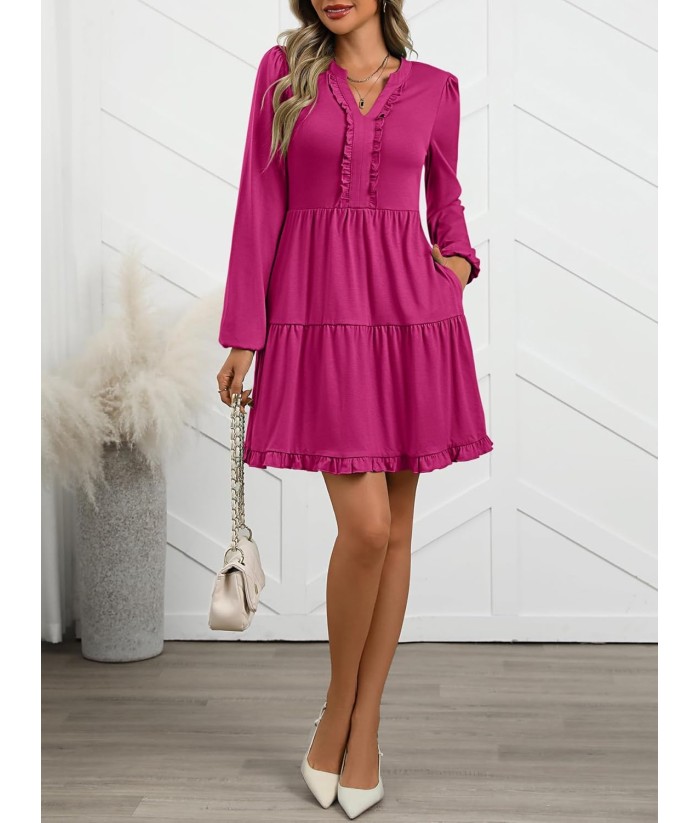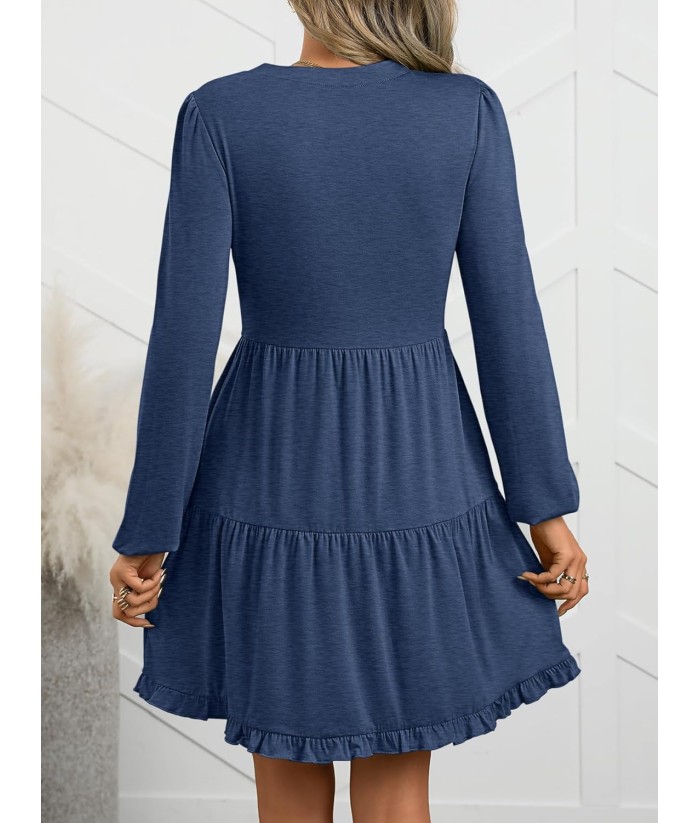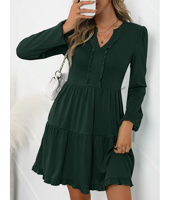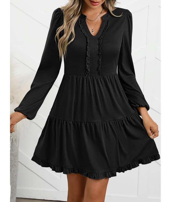 ANRABESS Womens Long Sleeve Dress 2025 Fall Casual V Neck Tiered Flowy Swing Short Mini Dresses Beach Travel Vacation Outfits