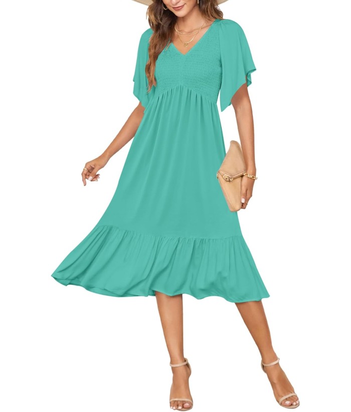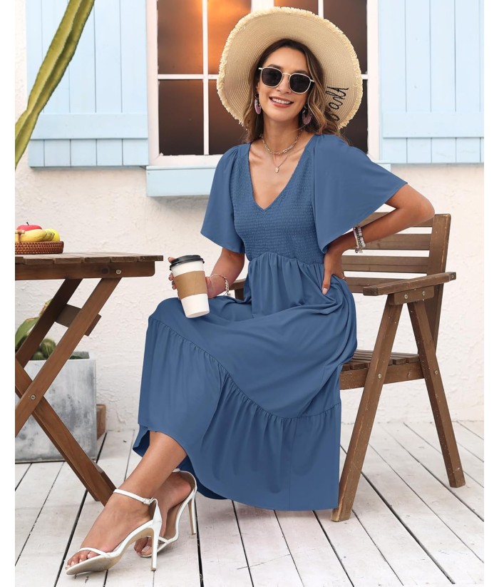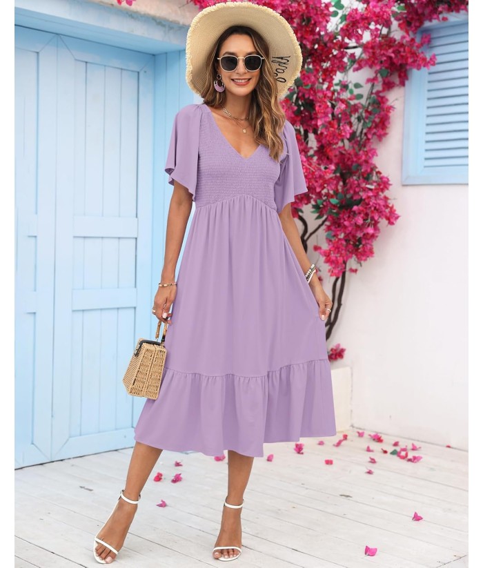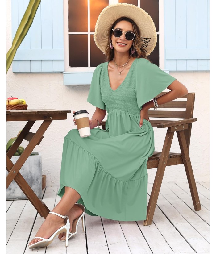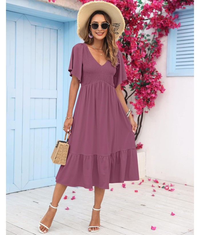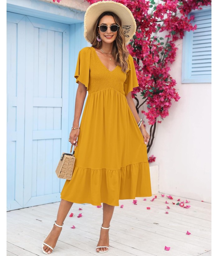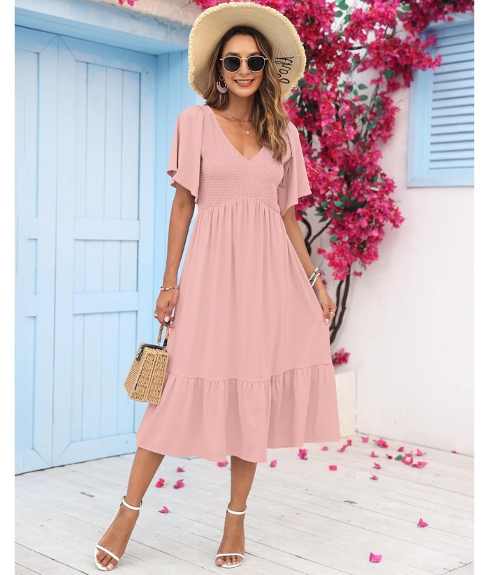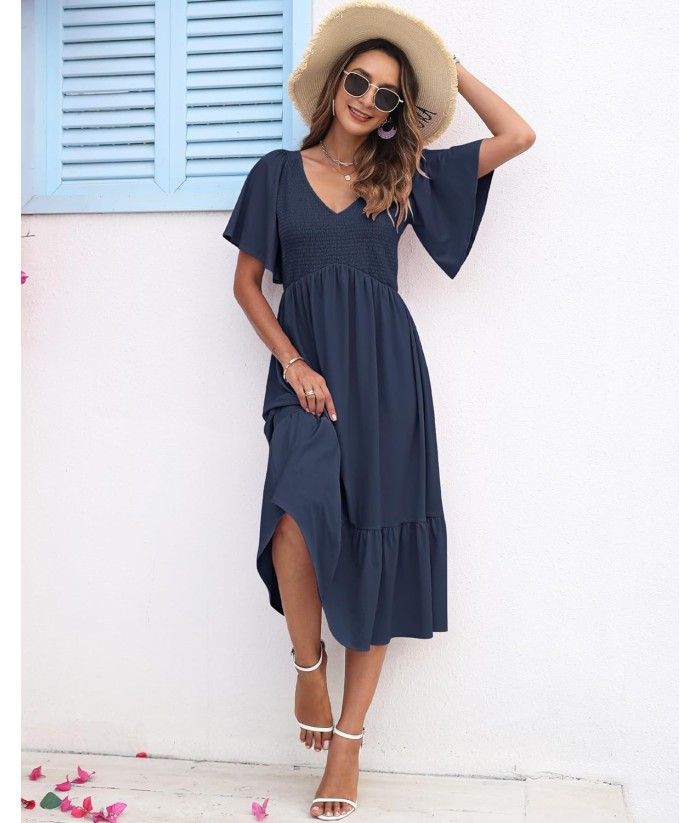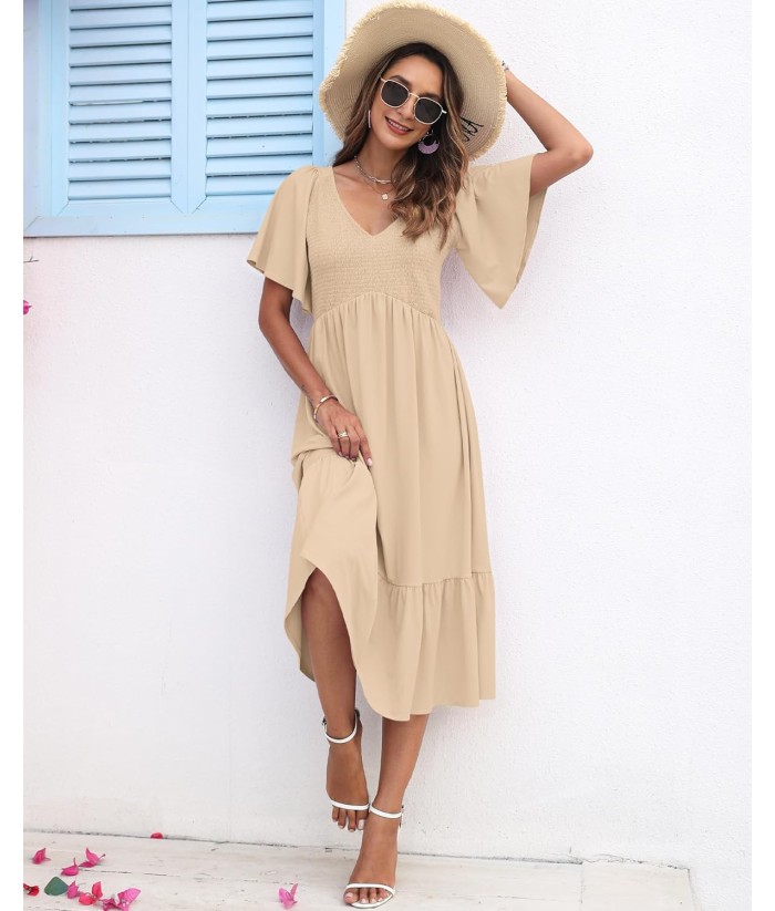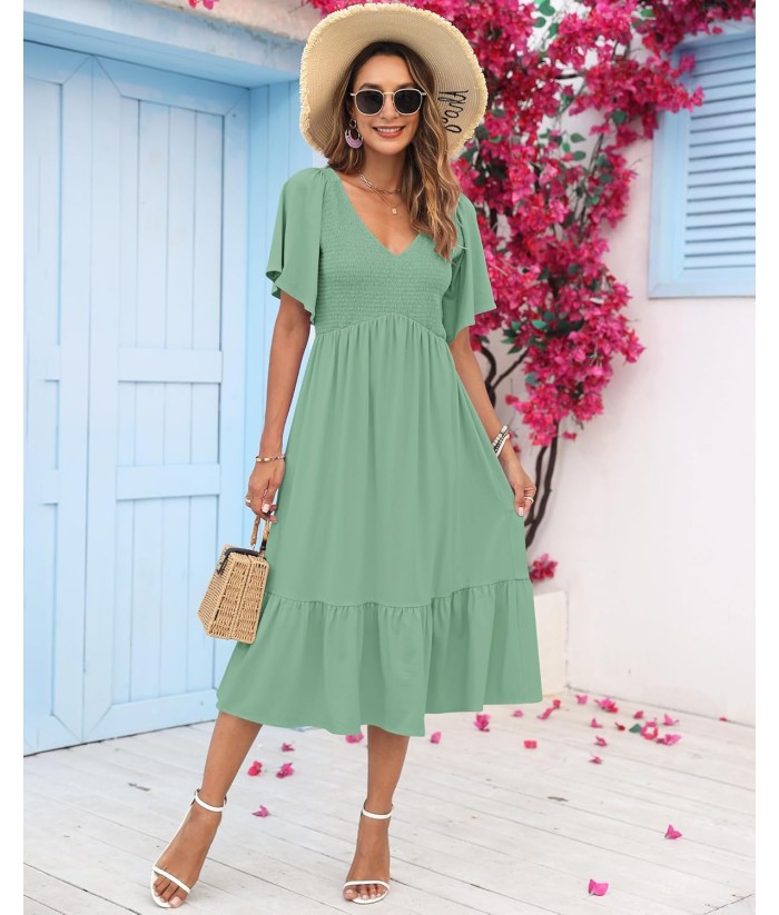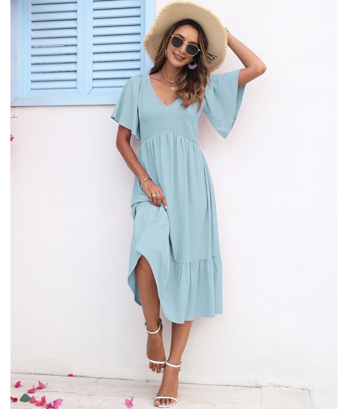 AUSELILY Women's Summer Empire Waist Dress Smocked Flutter Short Sleeve V Neck Midi Dresses 2025 New