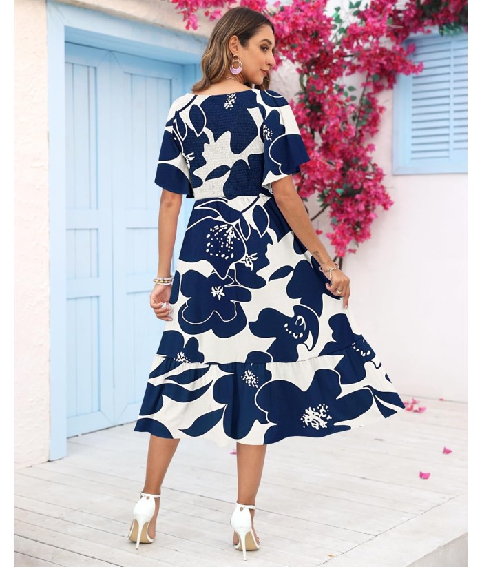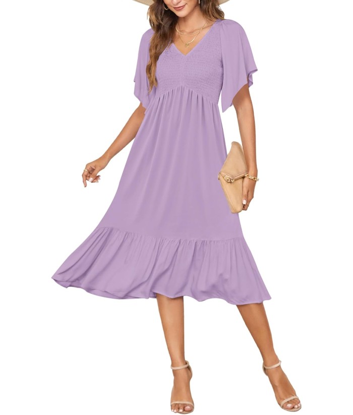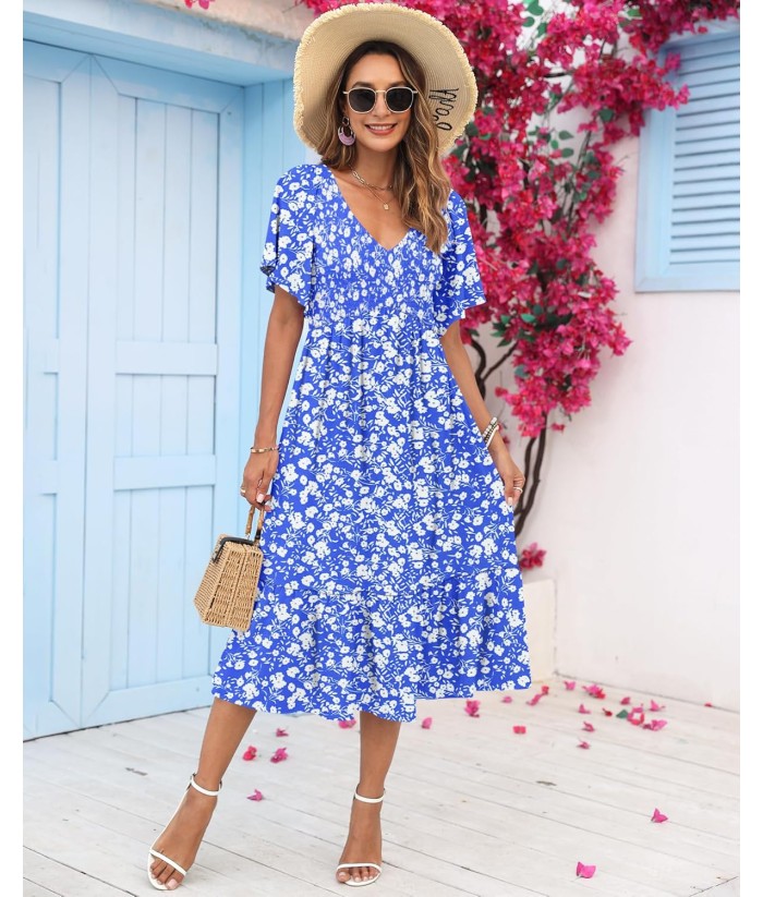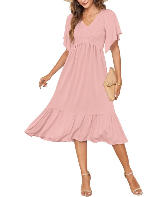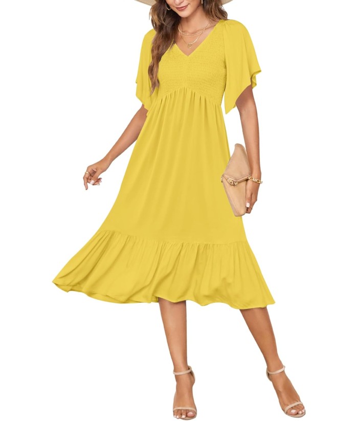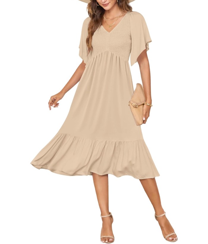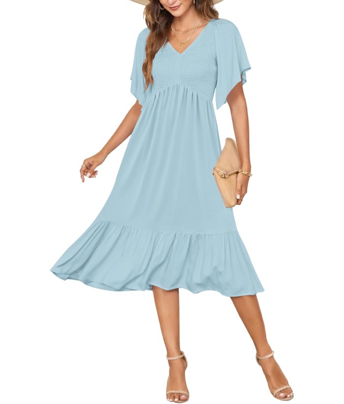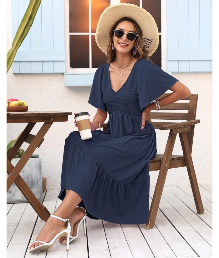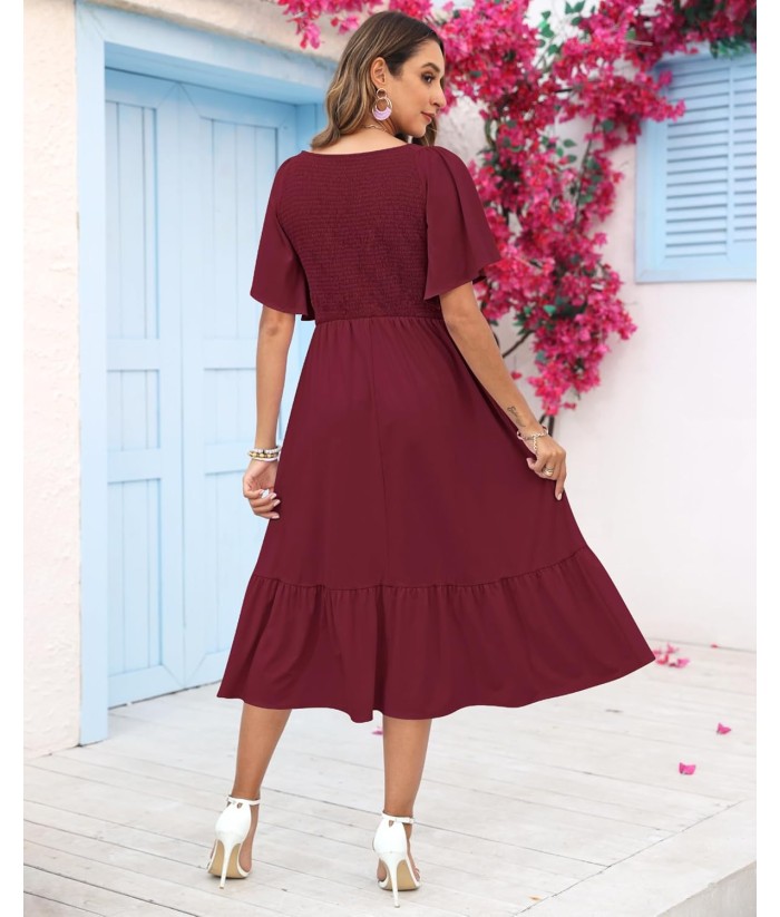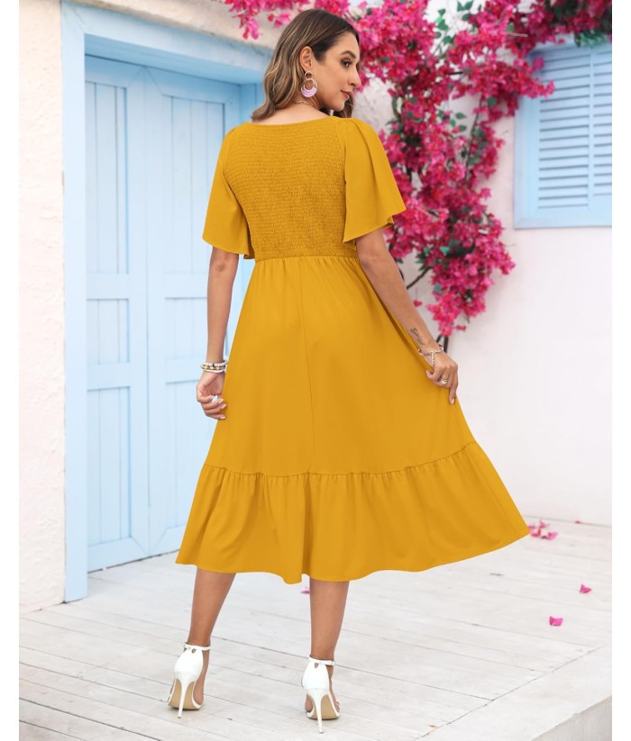 AUSELILY Women's Summer Empire Waist Dress Smocked Flutter Short Sleeve V Neck Midi Dresses 2025 New