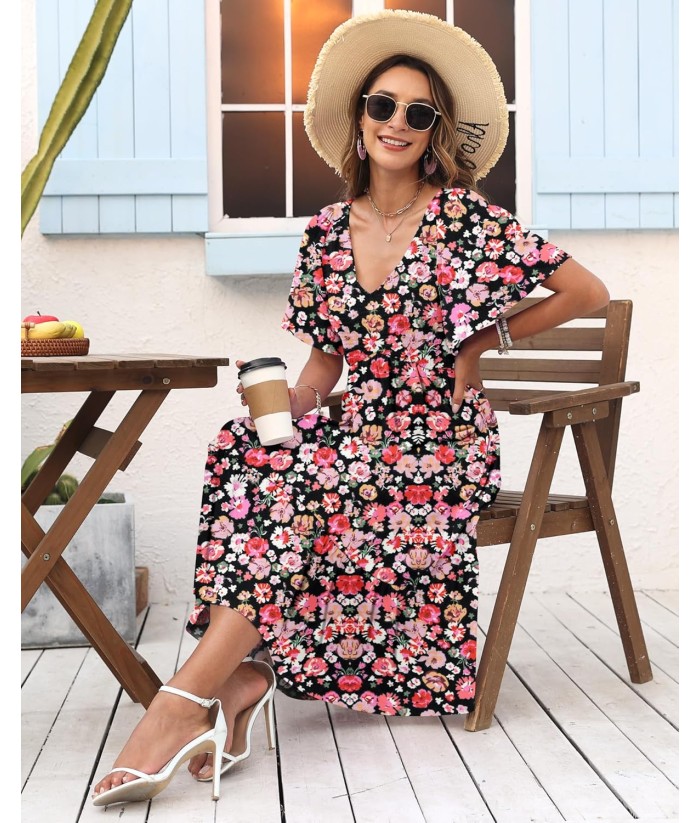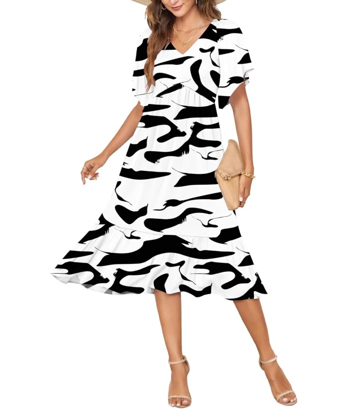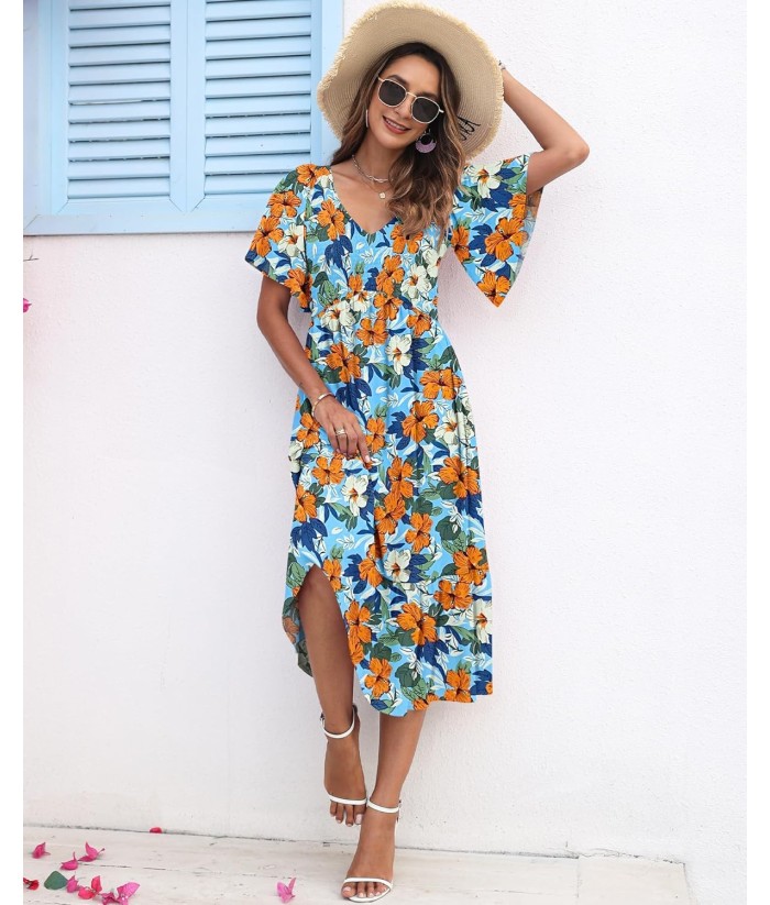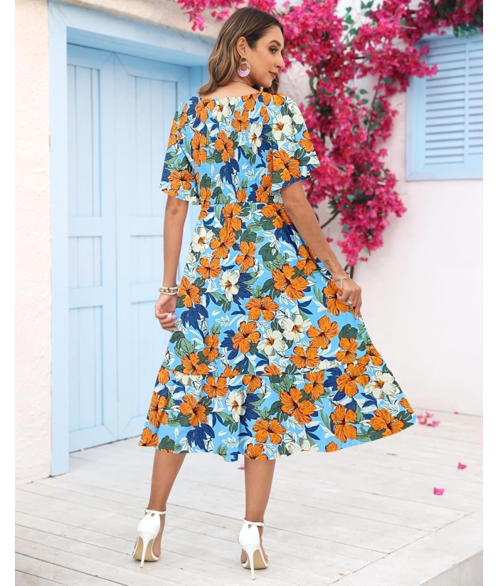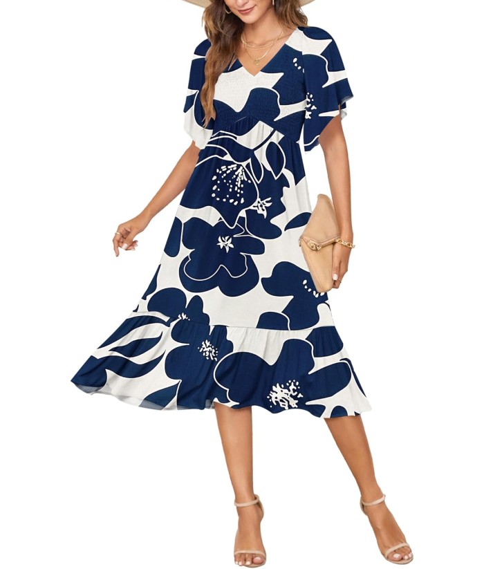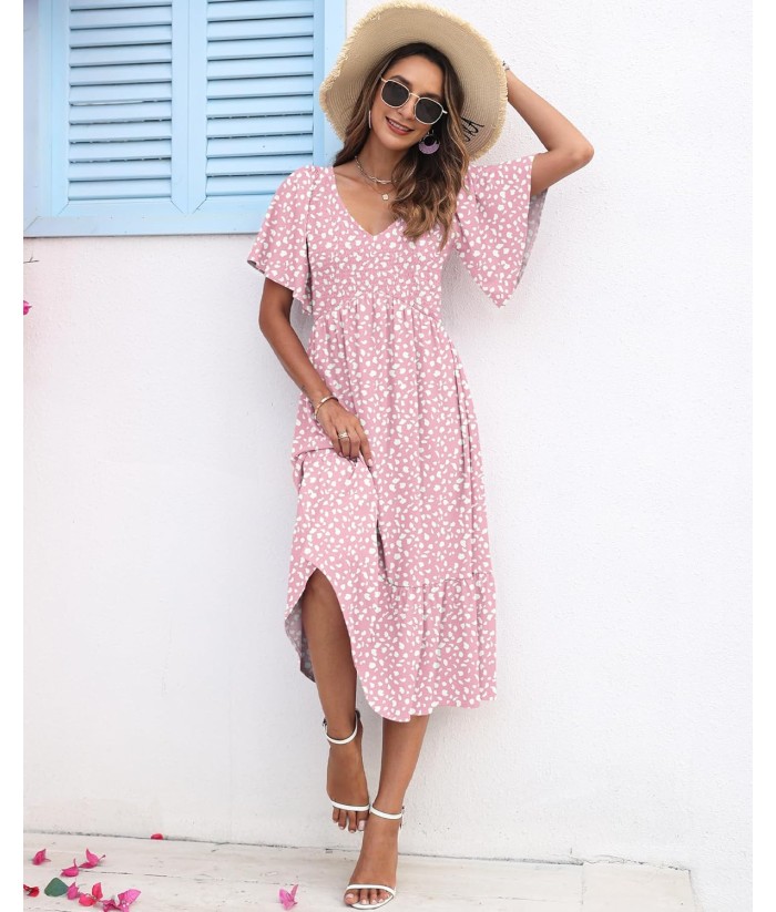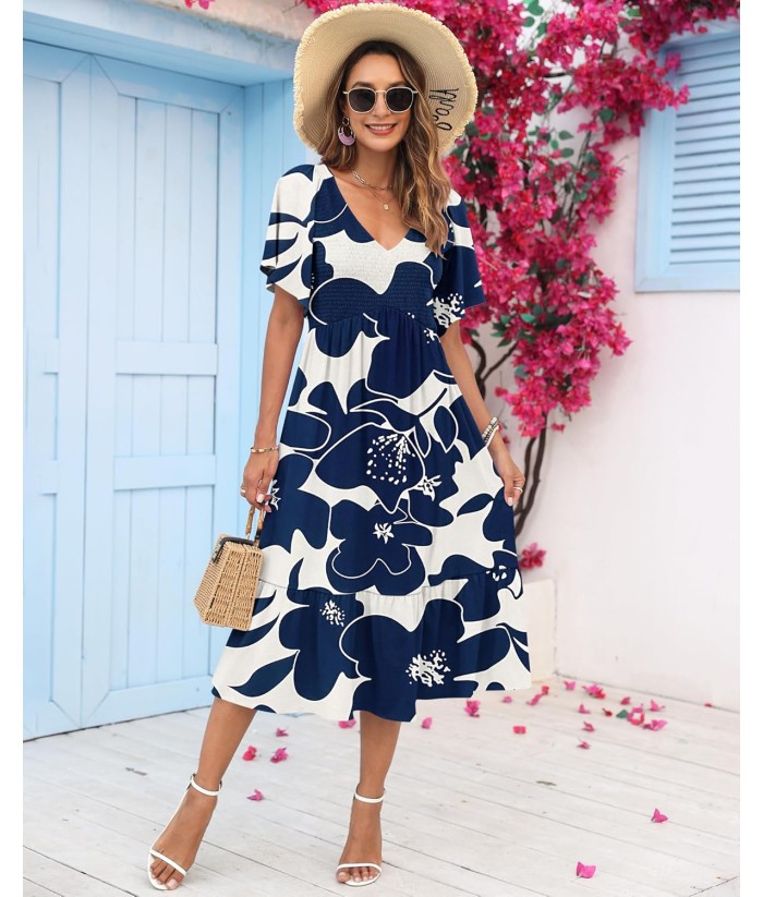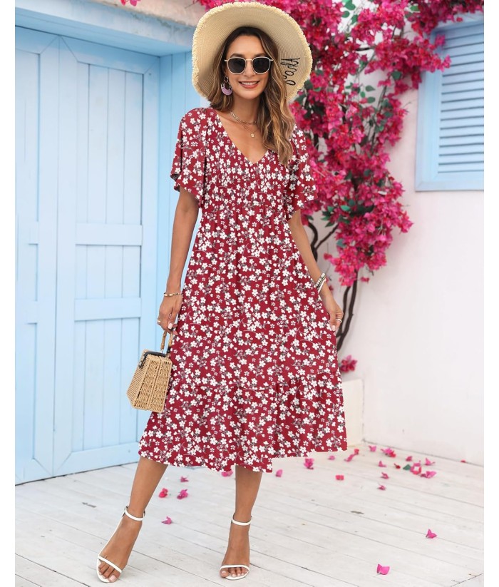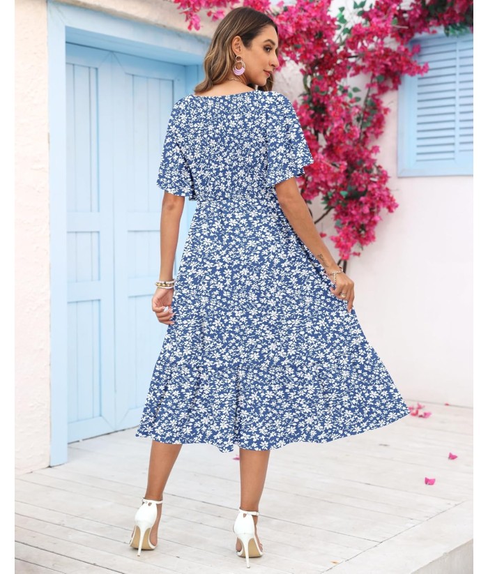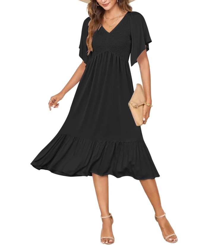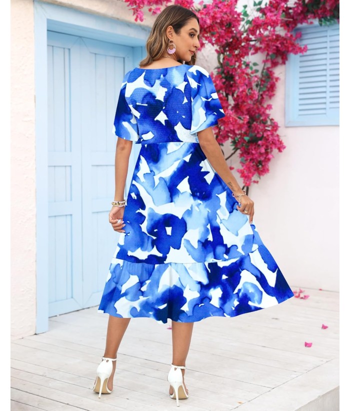 AUSELILY Women's Summer Empire Waist Dress Smocked Flutter Short Sleeve V Neck Midi Dresses 2025 New