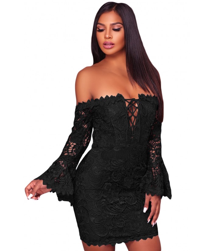 Feel speechless in front of this perfect Crochet Overlay Off The Shoulder Fitted Mini Dress The dress is charming with floral pattern lace overlay, cozy lining, the off shoulder is sexy and flirty as well, sheer bell sleeves, deep v cut and lace up front, lacy hemline and back zipper done.