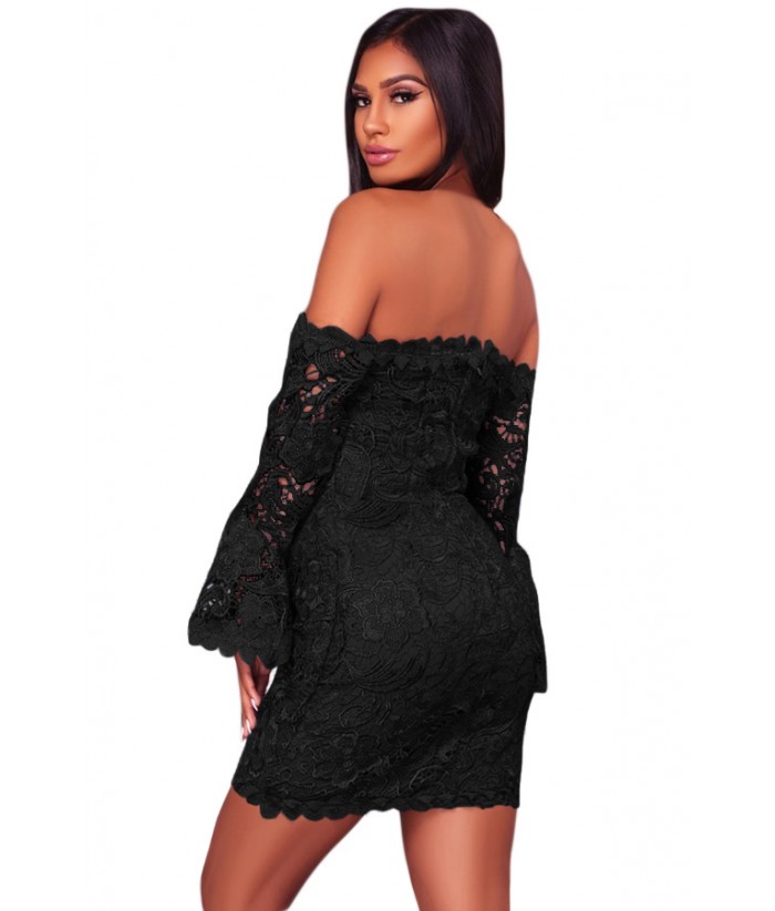 Black Crochet Overlay Off The Shoulder Fitted Mini Dress