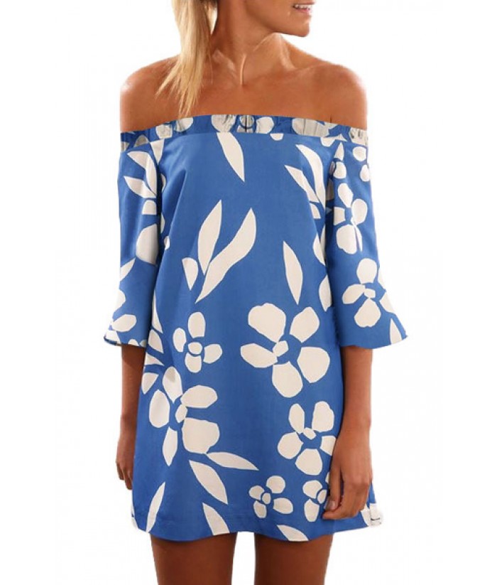 Product Name | Blue Off Shoulder Floral Print Boho Dress |