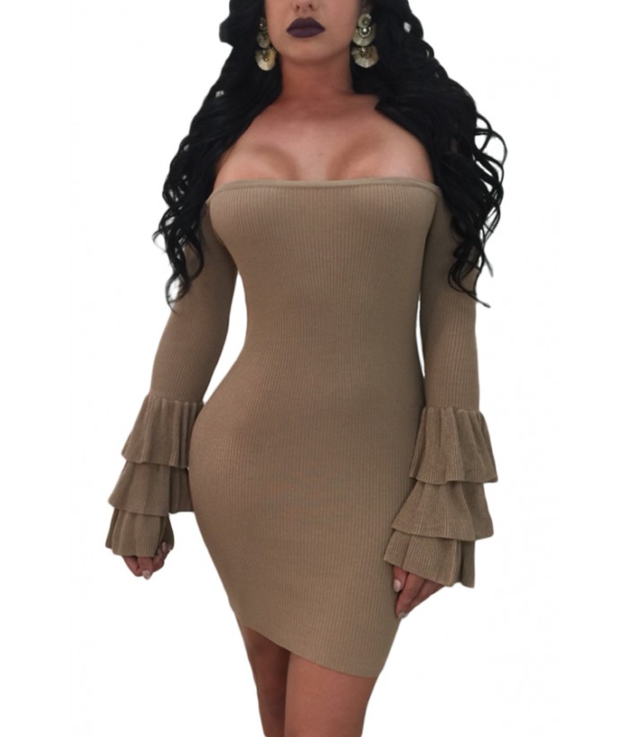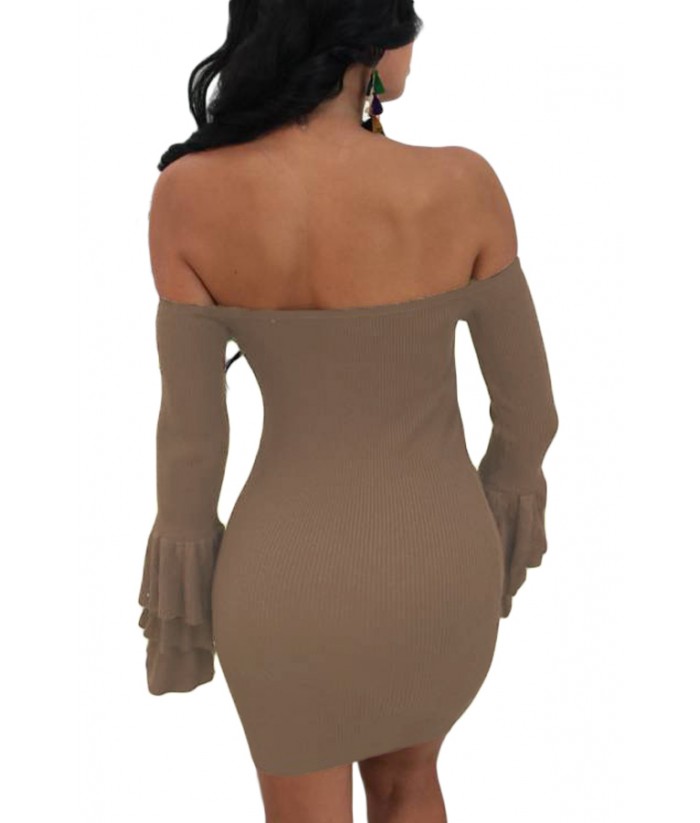 Product Name | Brown Off The Shoulder Ruffled Sleeve Ribbed Mini Dress |