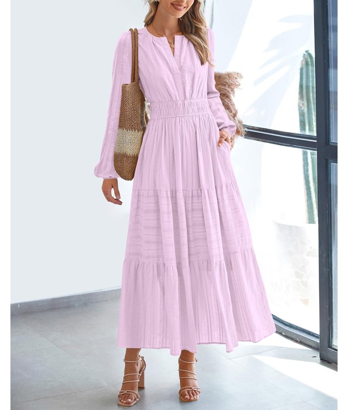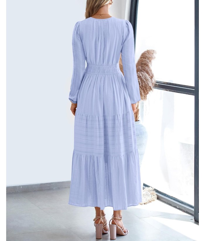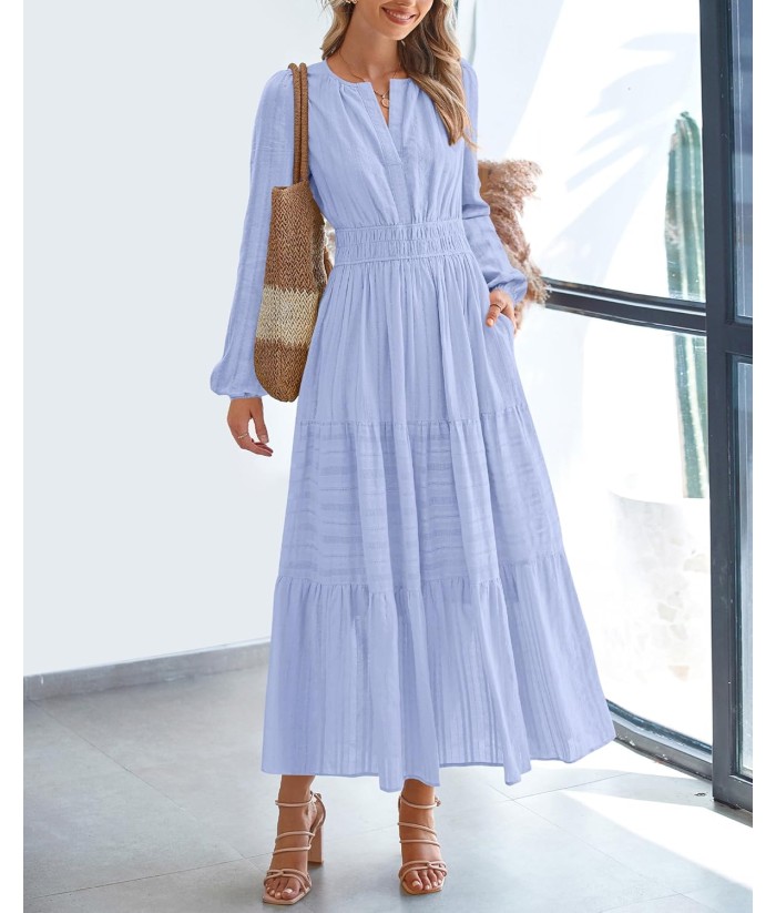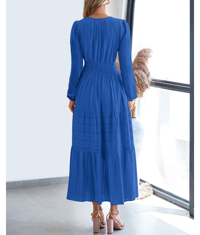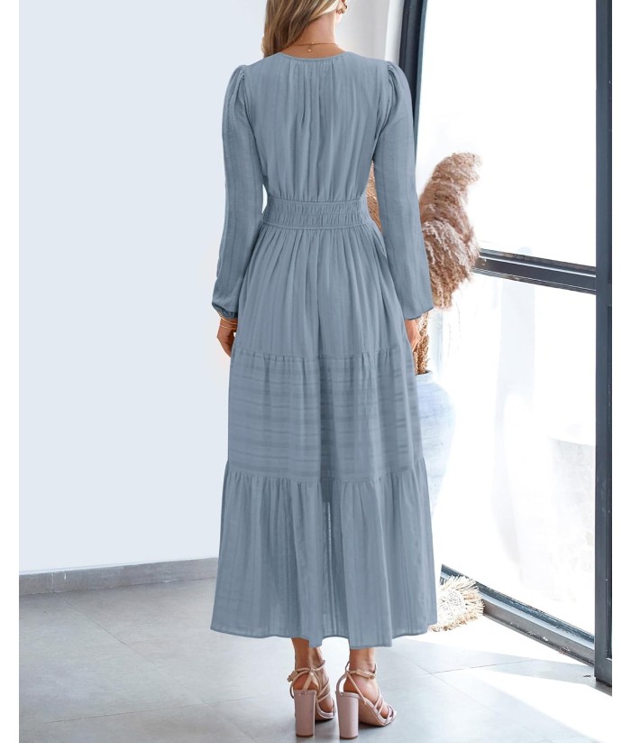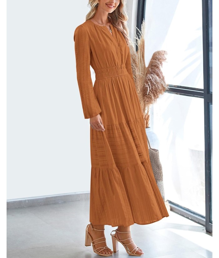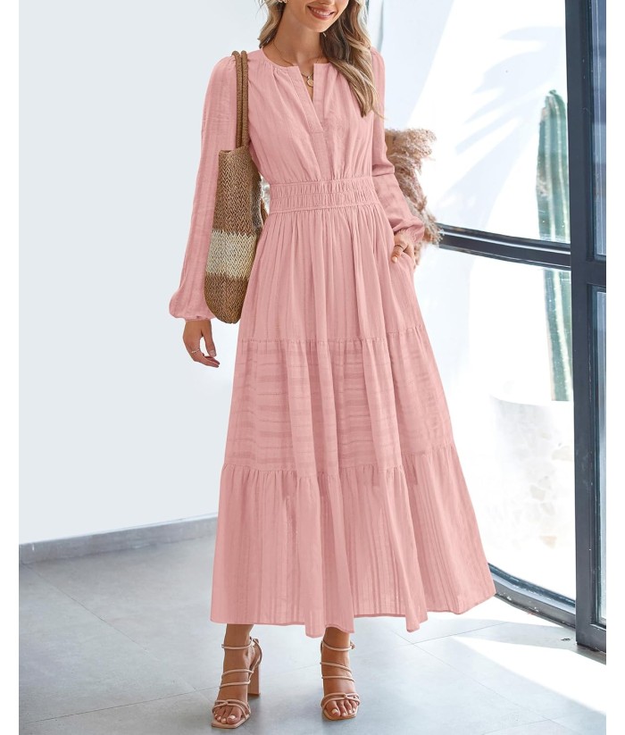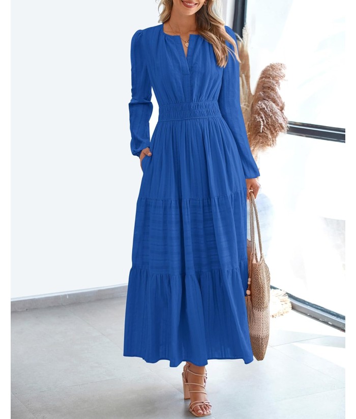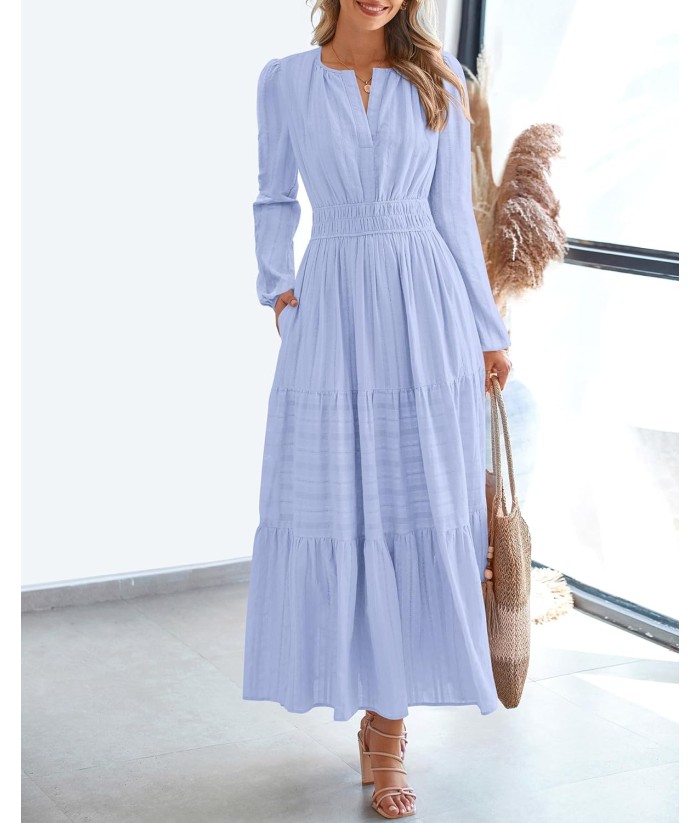 BTFBM Fall Dresses for Women 2025 Casual Long Sleeve V Neck Elastic Waist Lightweight Maxi Wedding Guest Dress Pockets