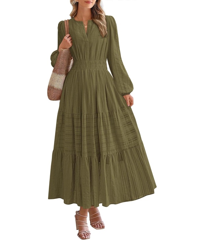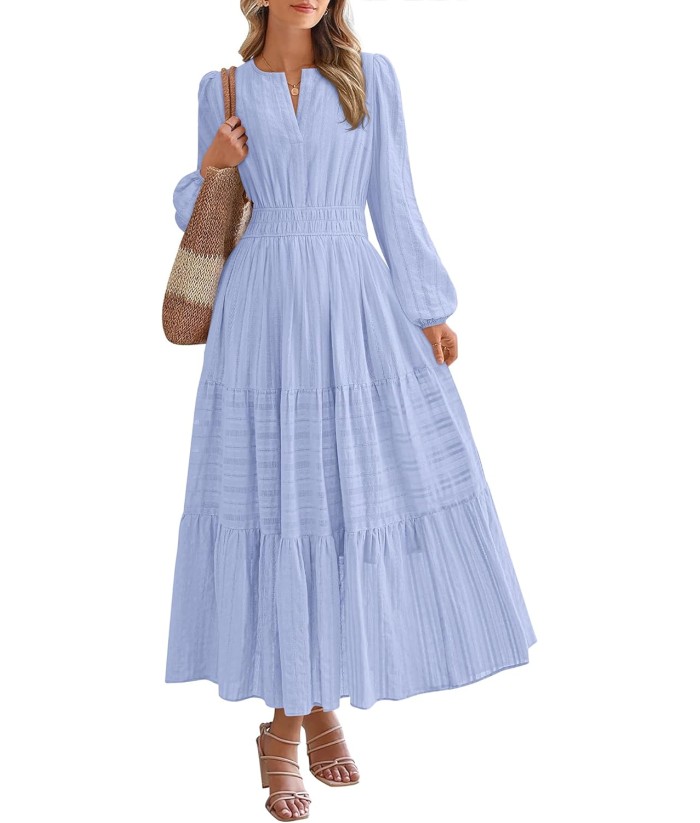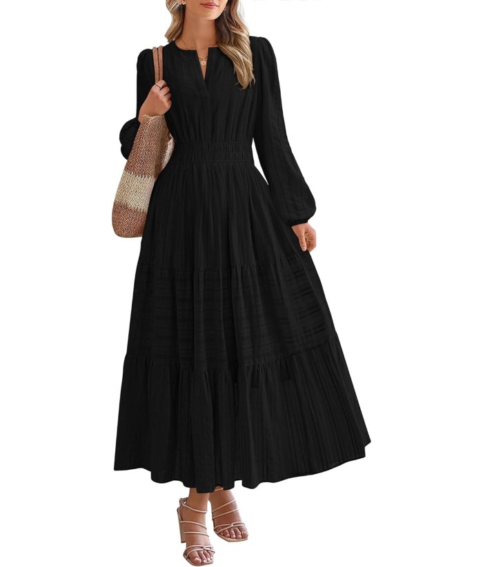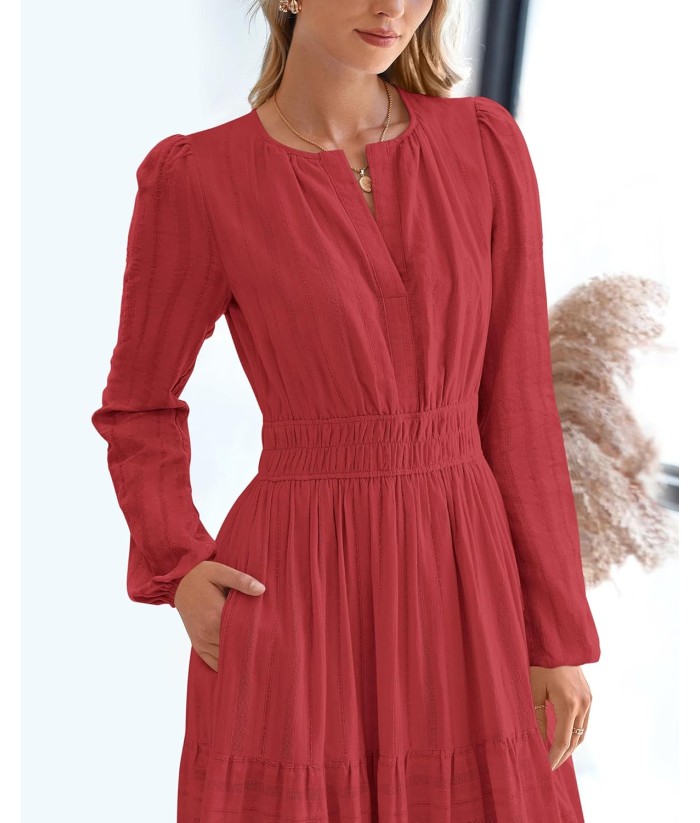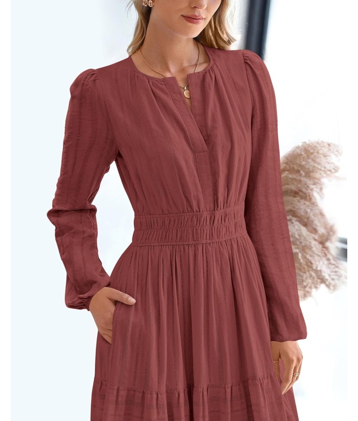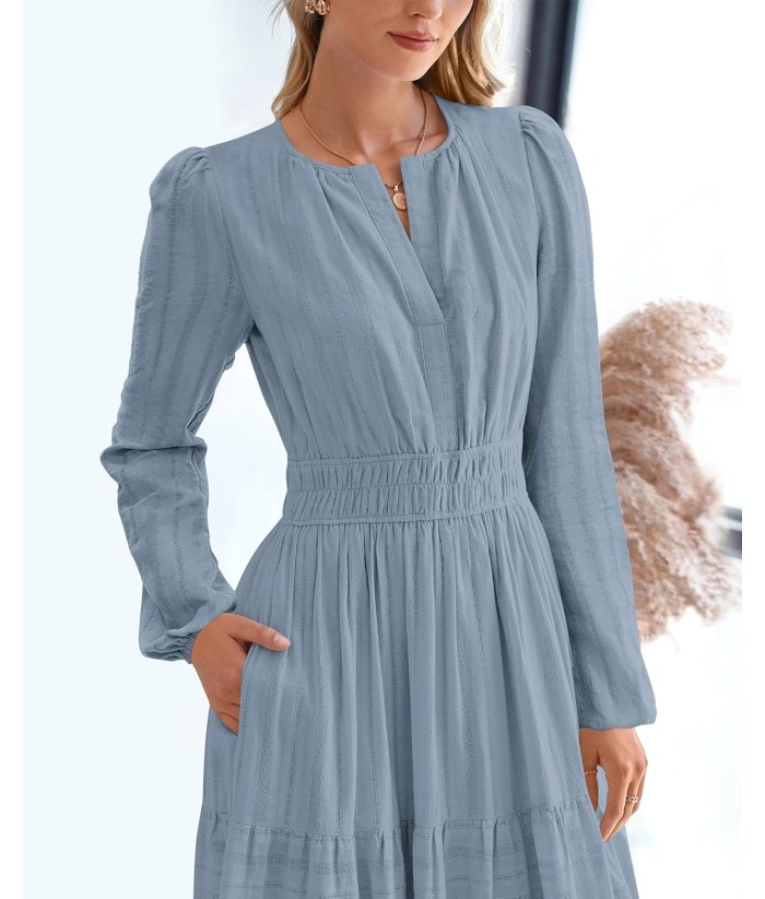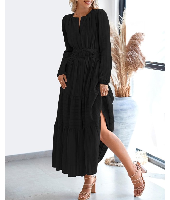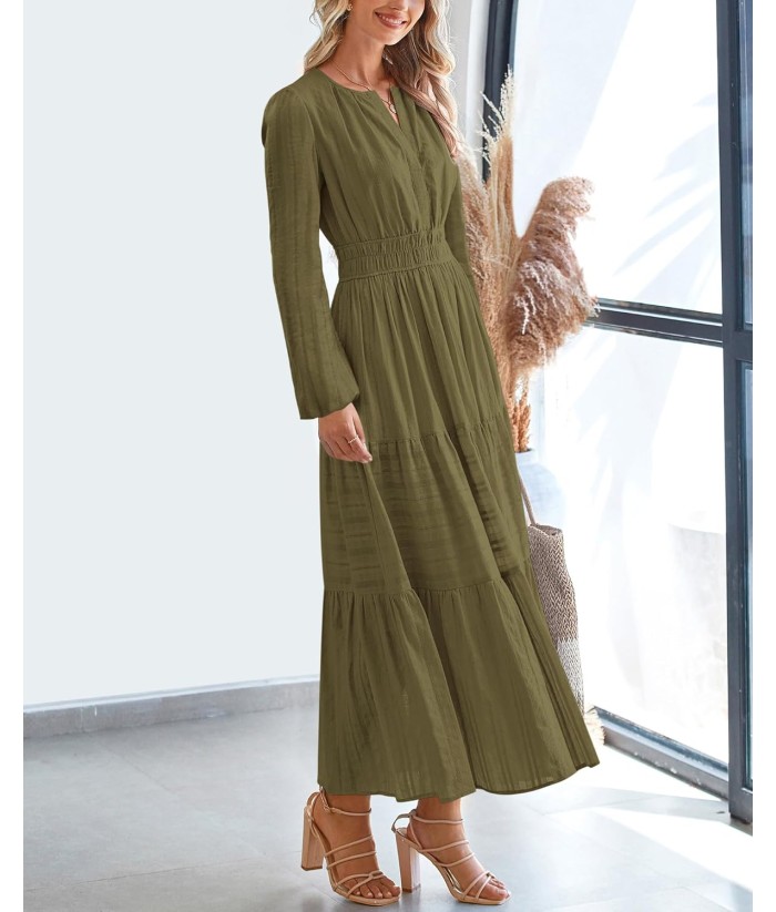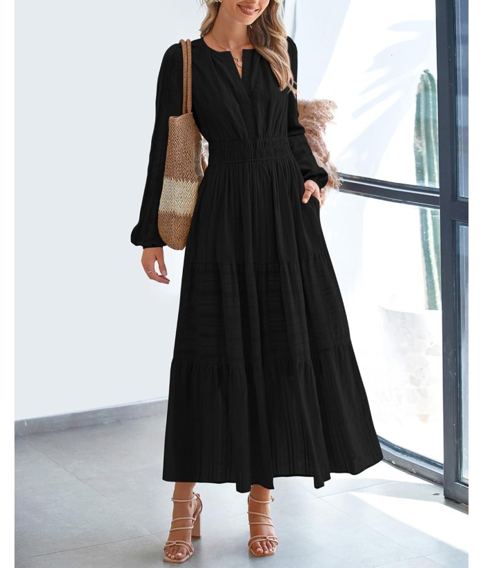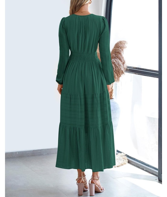 BTFBM Fall Dresses for Women 2025 Casual Long Sleeve V Neck Elastic Waist Lightweight Maxi Wedding Guest Dress Pockets