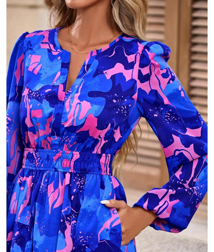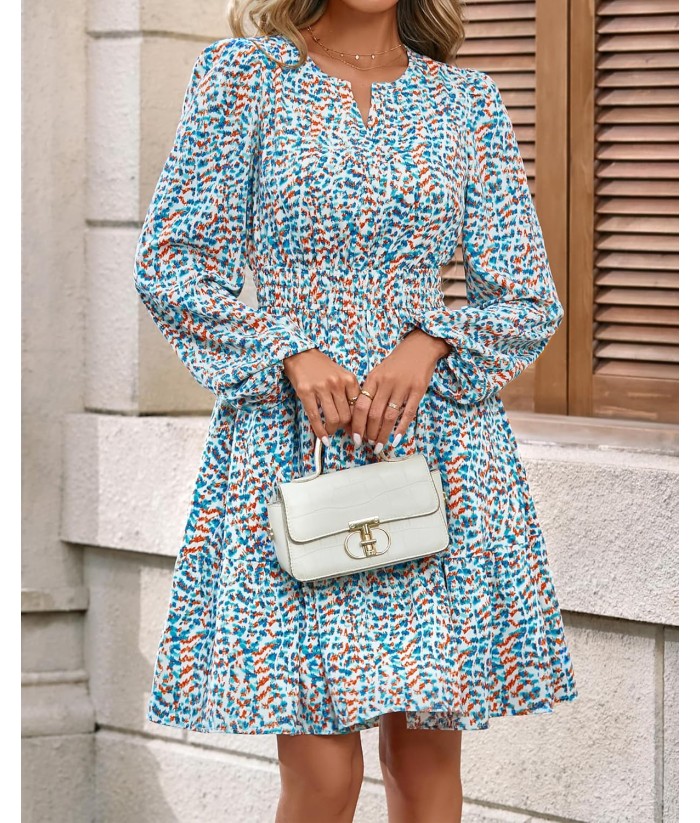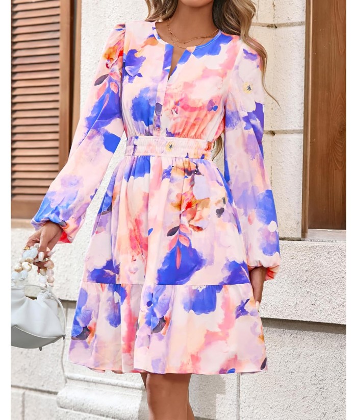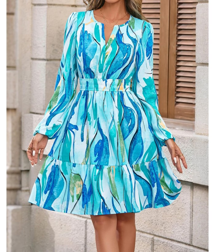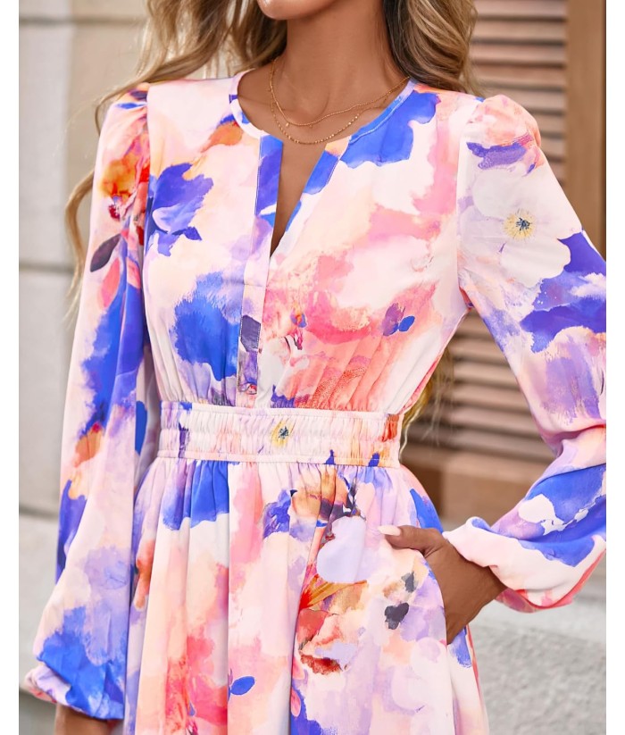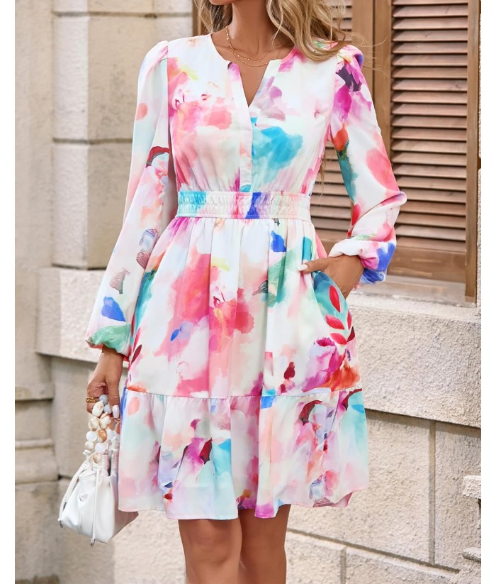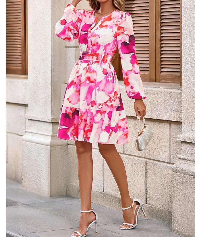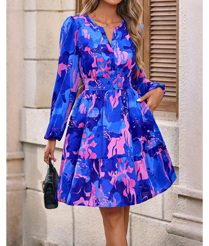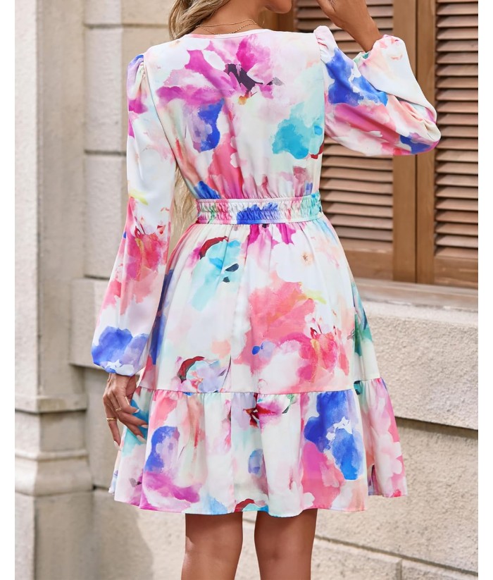 BTFBM Fall Dresses for Women 2025 V Neck Long Sleeve Elastic Waist Boho Beach Vacation Clothes Floral Mini Summer Dress