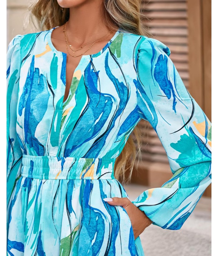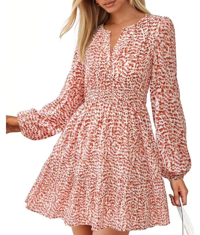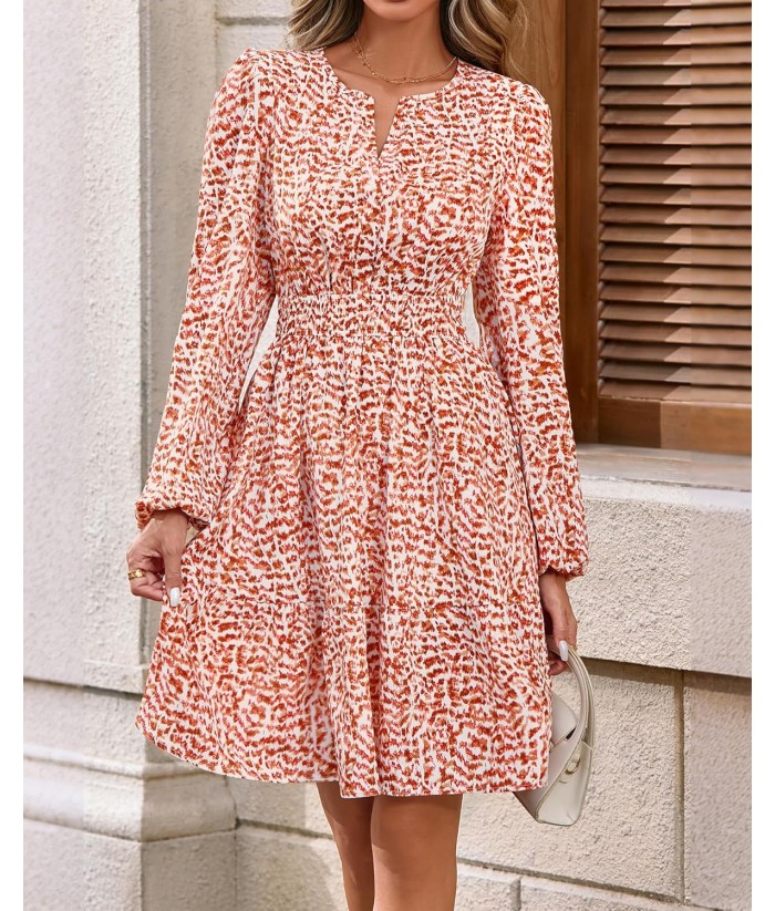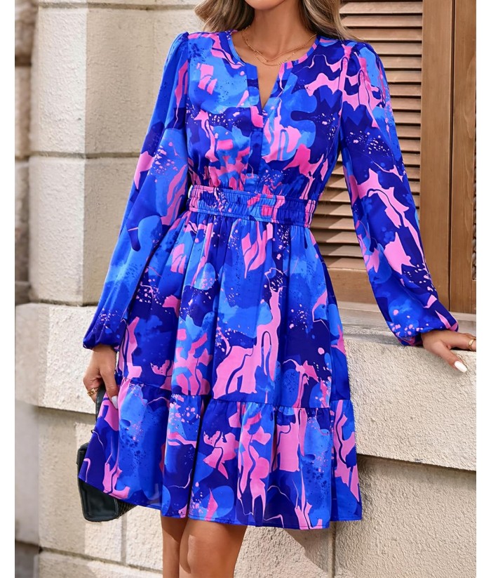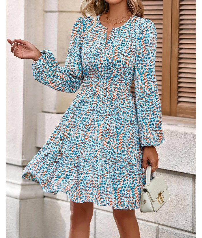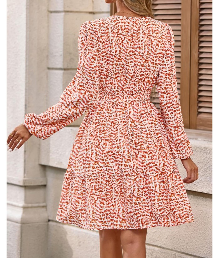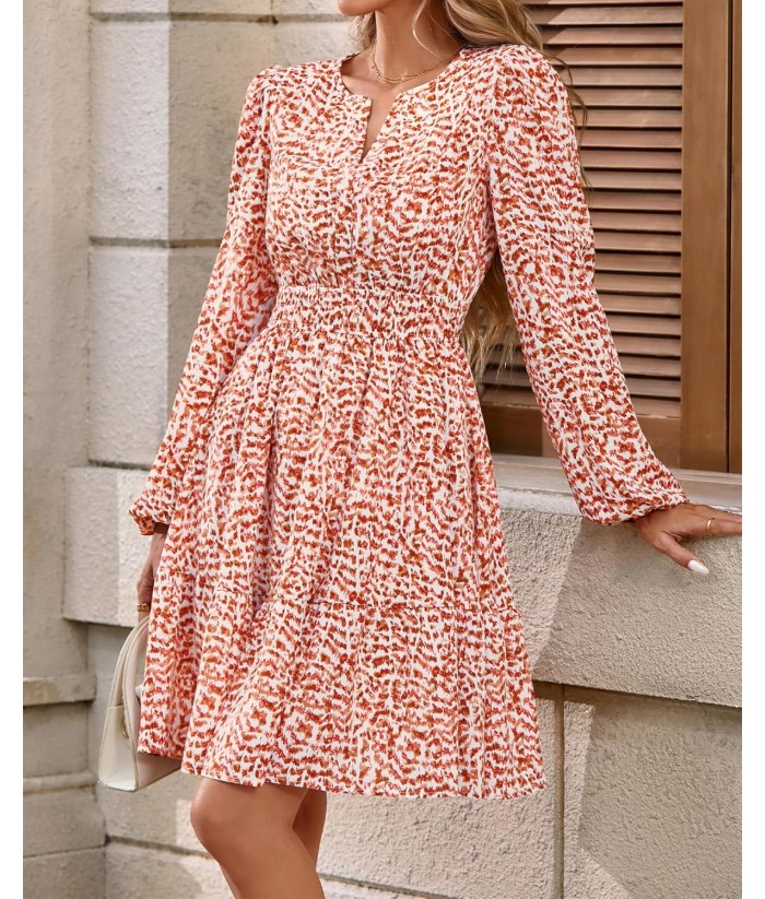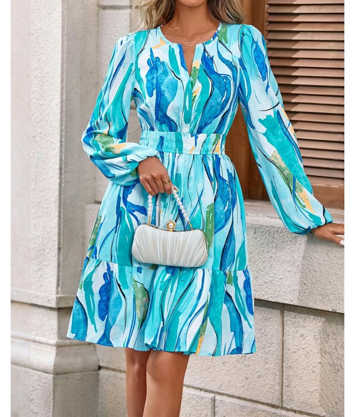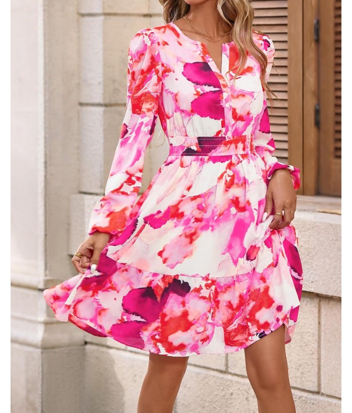 BTFBM Fall Dresses for Women 2025 V Neck Long Sleeve Elastic Waist Boho Beach Vacation Clothes Floral Mini Summer Dress