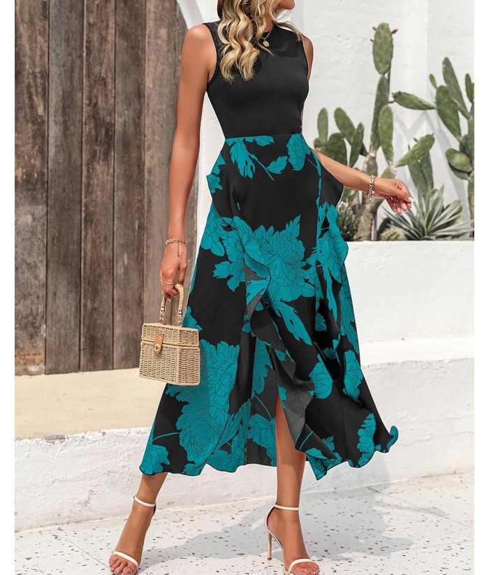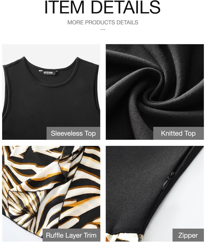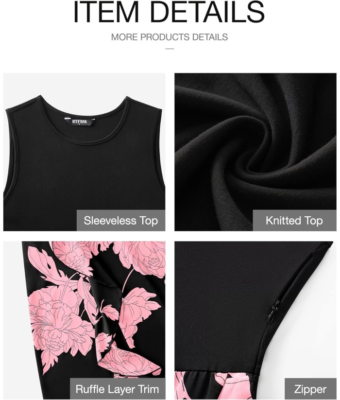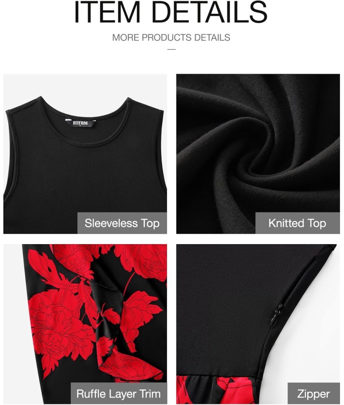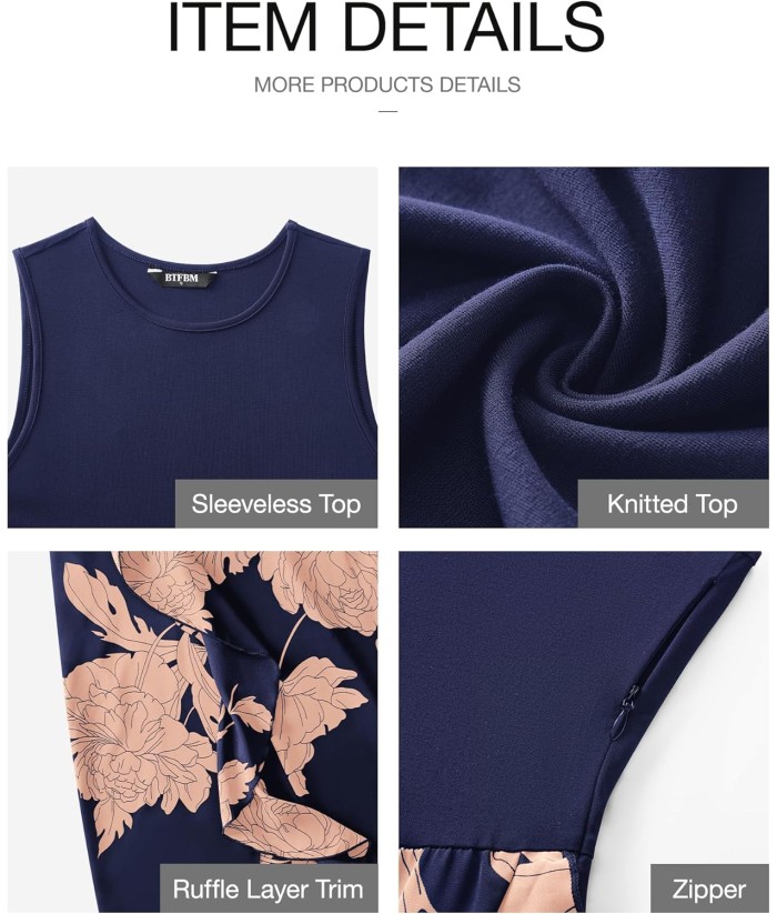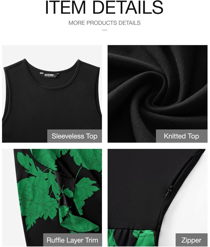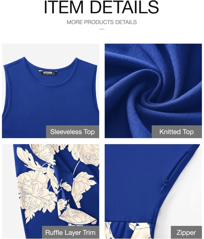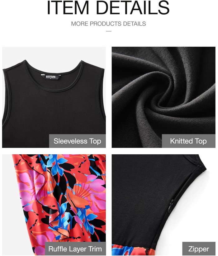 BTFBM Women Casual Sleeveless Summer Dresses 2025 Spring Crewneck Patchwork Boho Floral Ruffle Cocktail Party Midi Dress