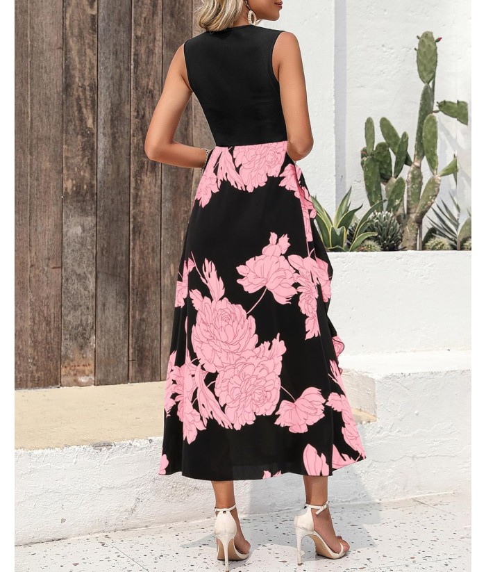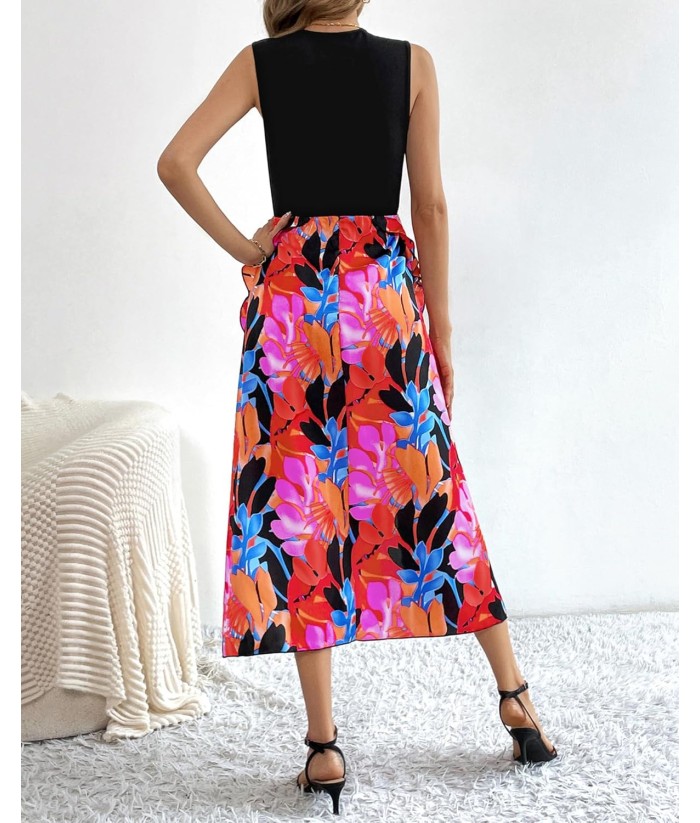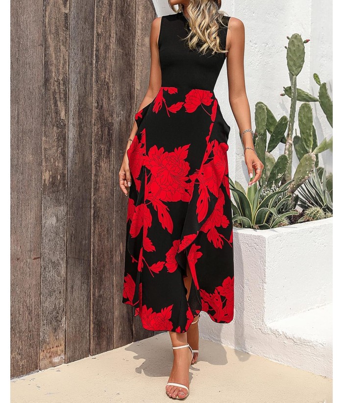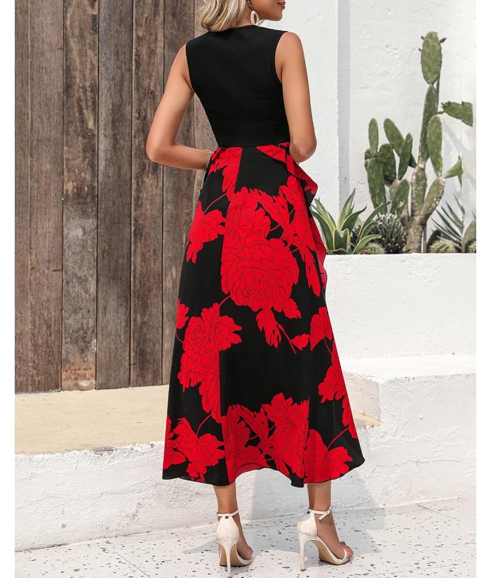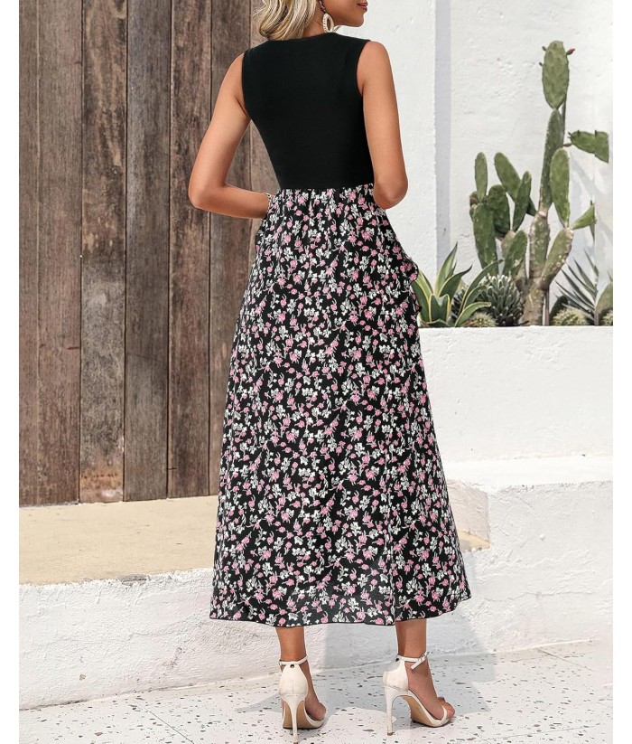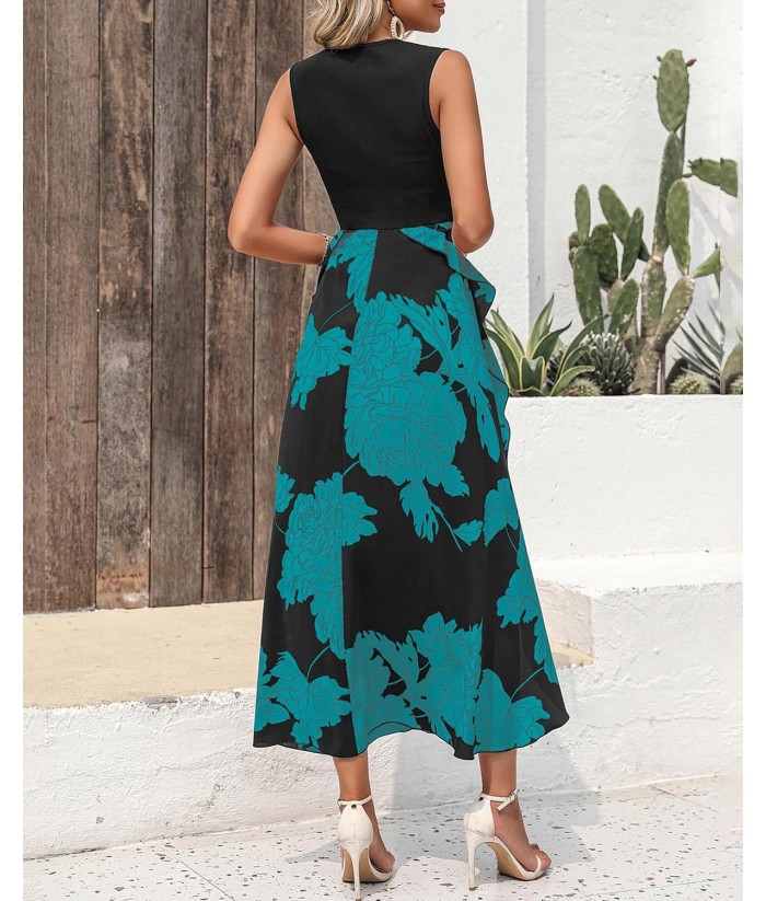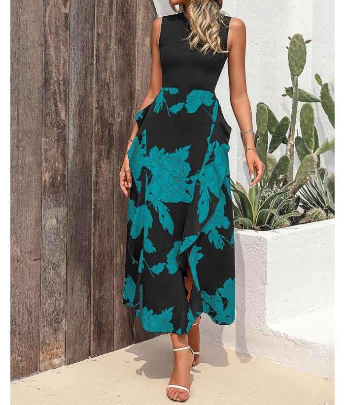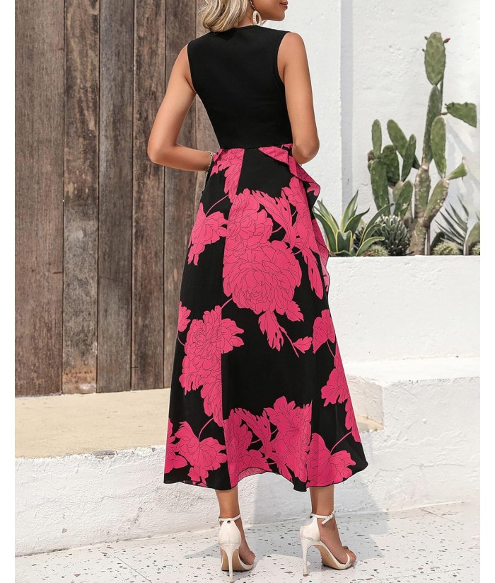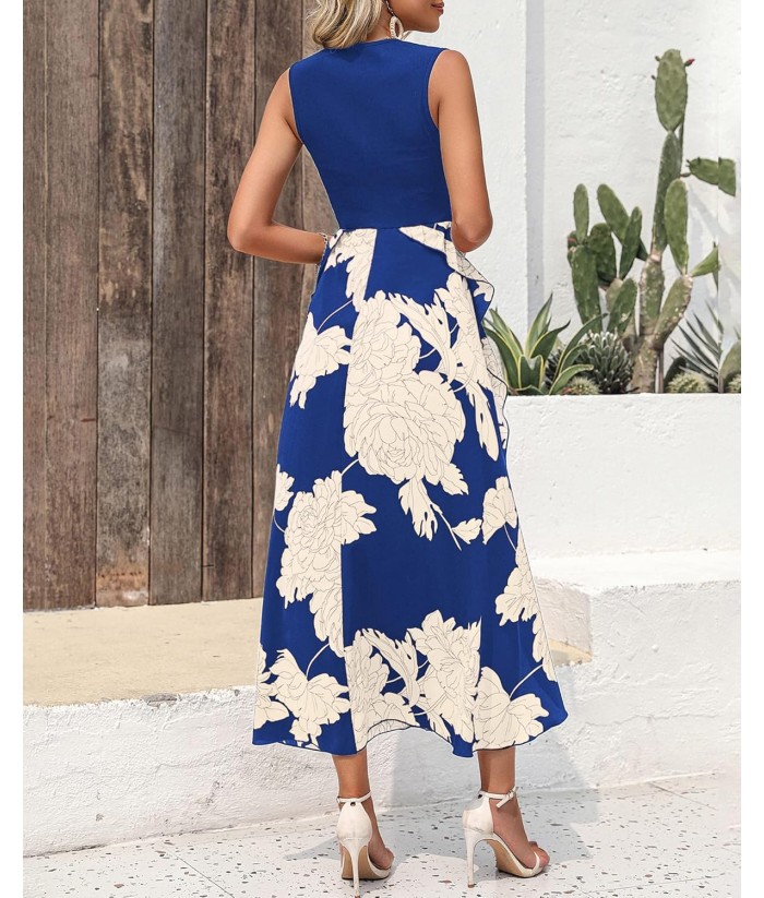 BTFBM Women Casual Sleeveless Summer Dresses 2025 Spring Crewneck Patchwork Boho Floral Ruffle Cocktail Party Midi Dress