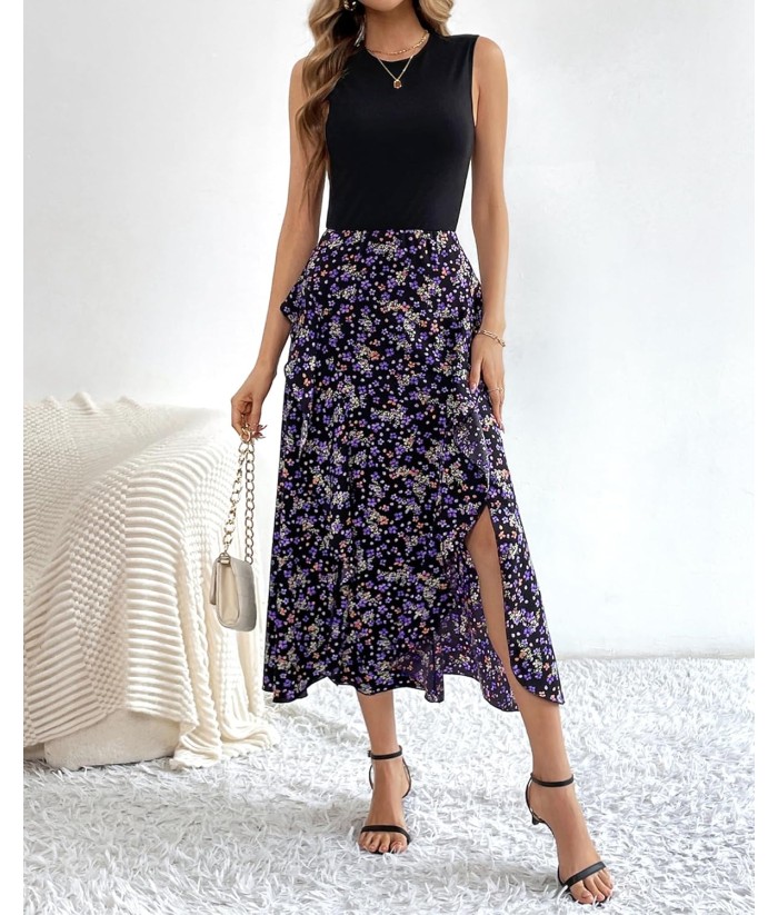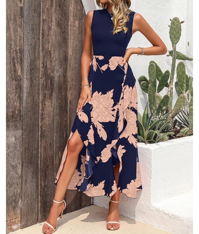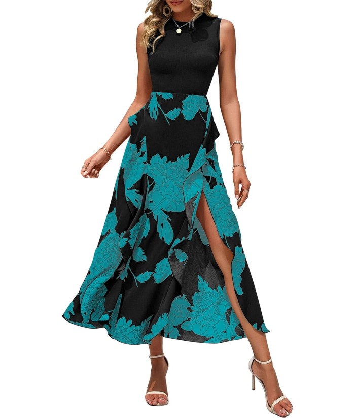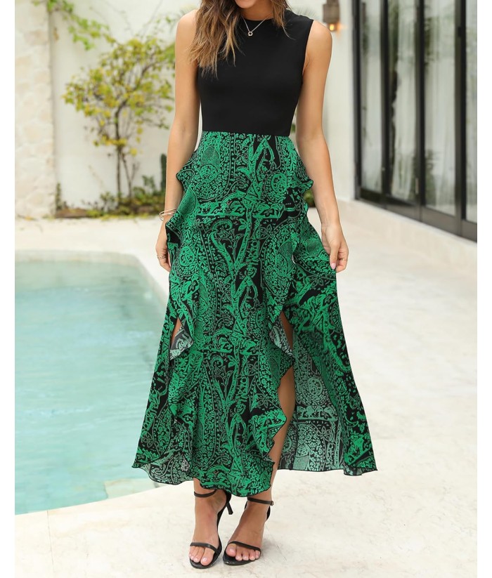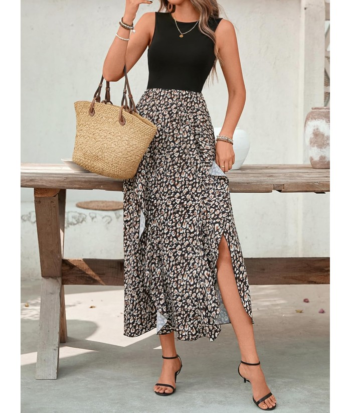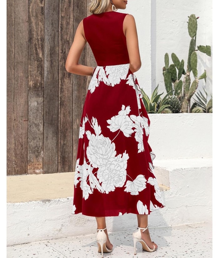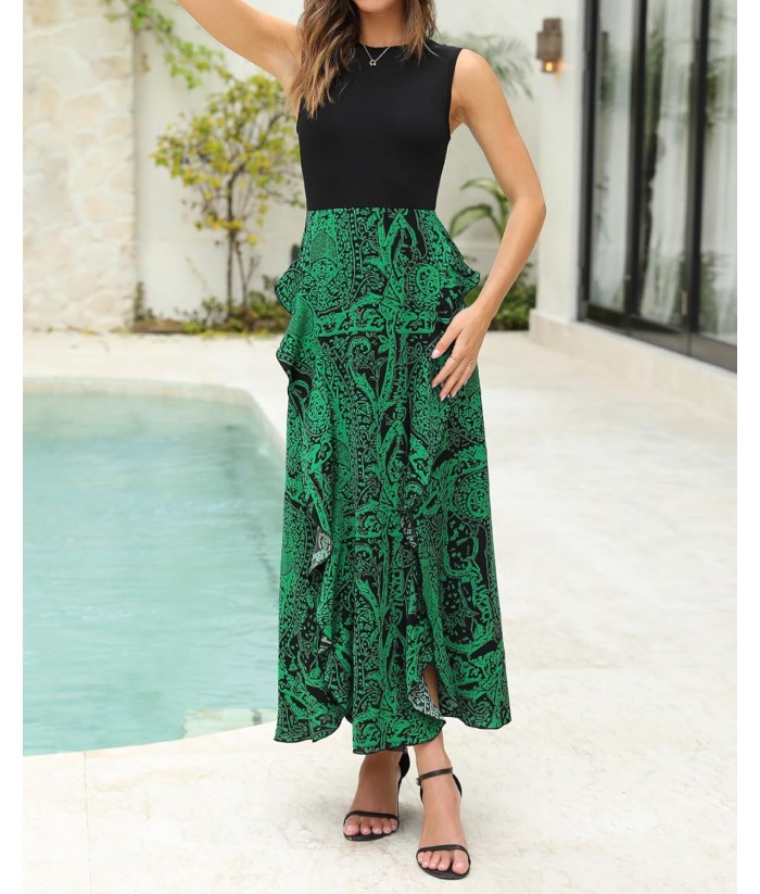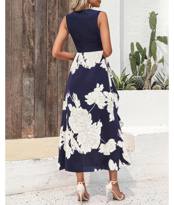 BTFBM Women Casual Sleeveless Summer Dresses 2025 Spring Crewneck Patchwork Boho Floral Ruffle Cocktail Party Midi Dress