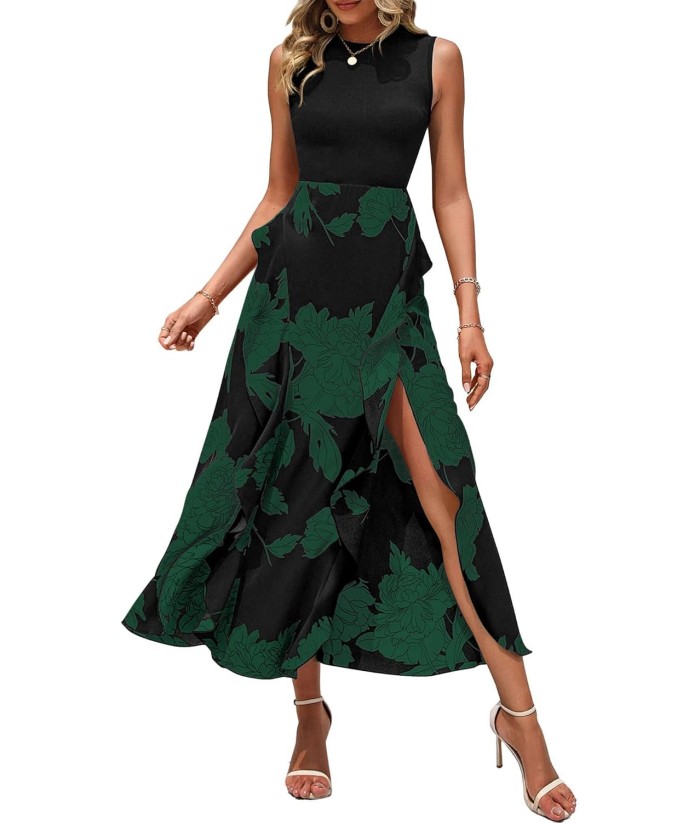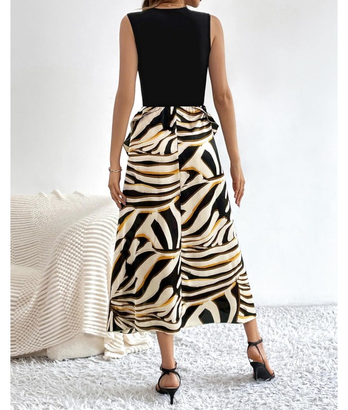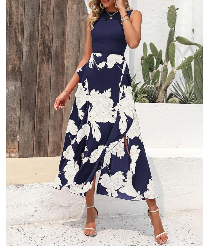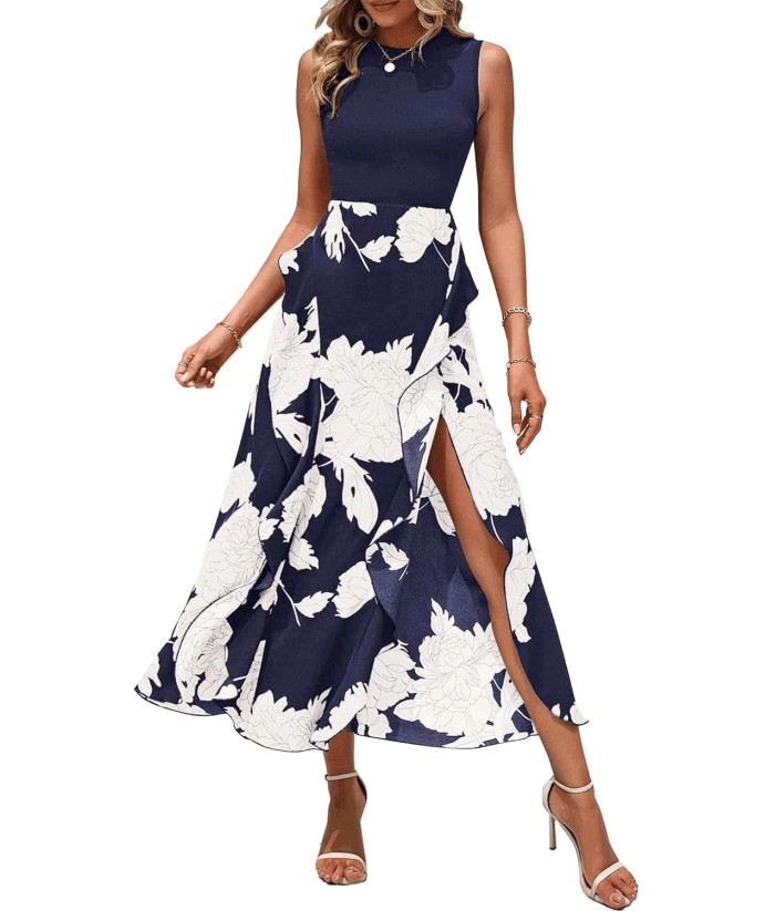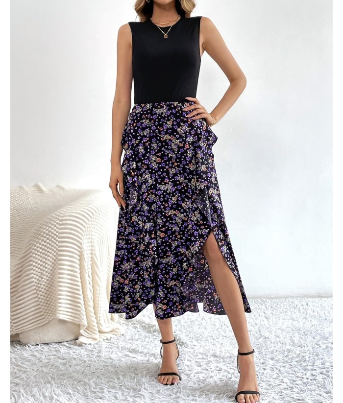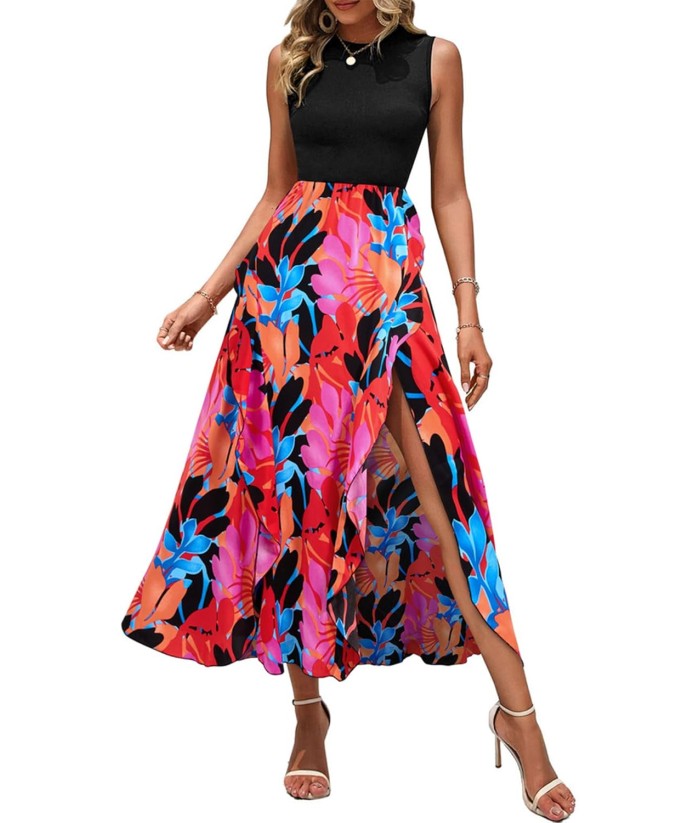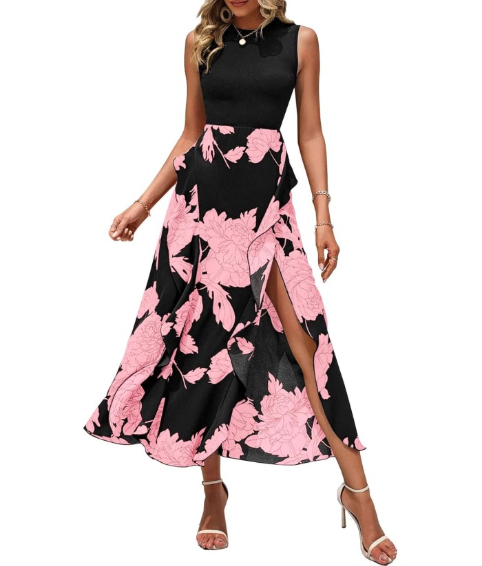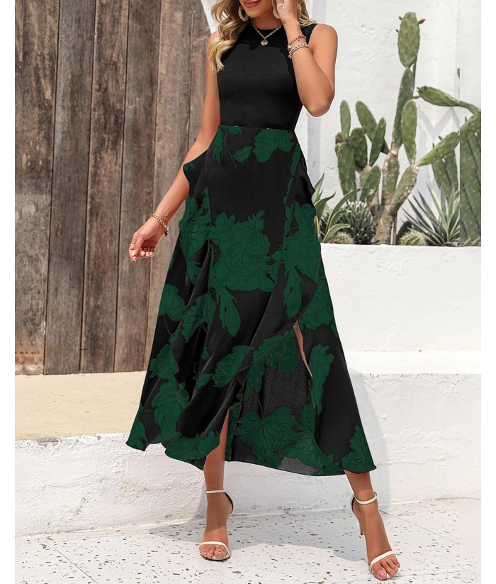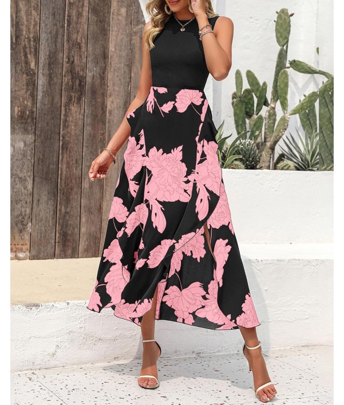 BTFBM Women Casual Sleeveless Summer Dresses 2025 Spring Crewneck Patchwork Boho Floral Ruffle Cocktail Party Midi Dress