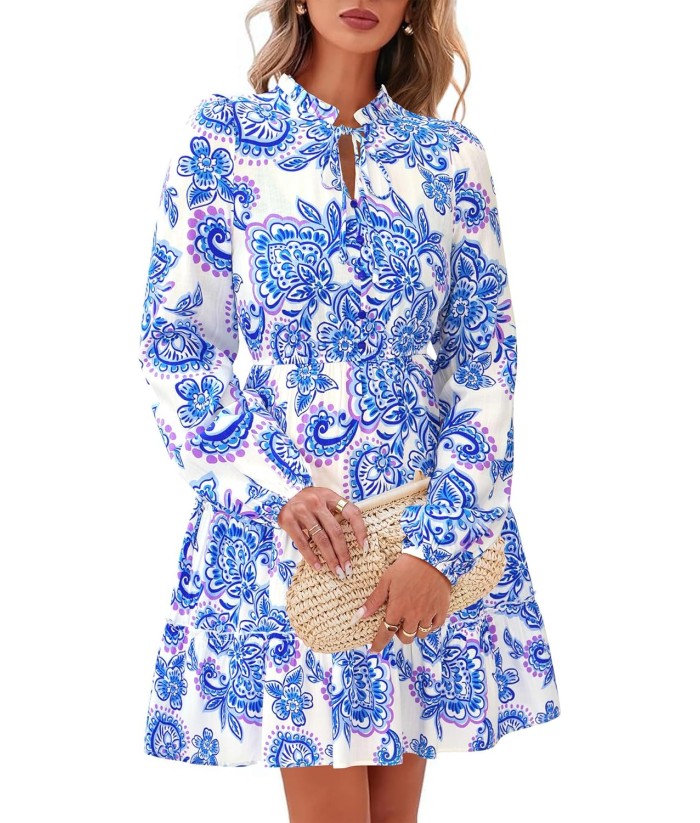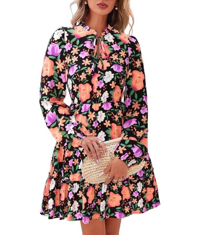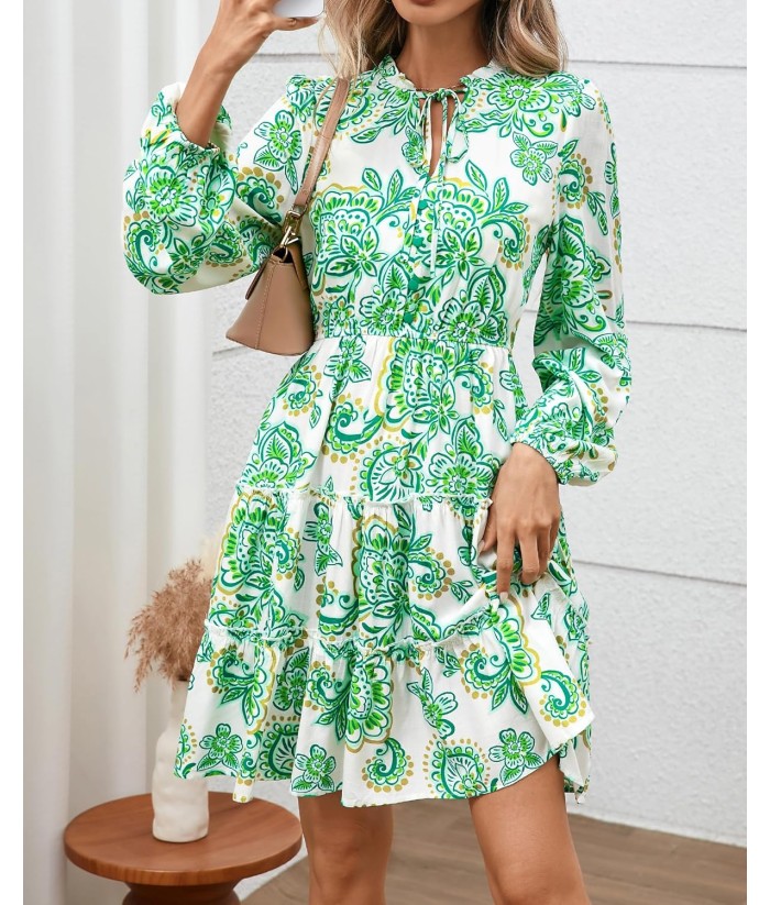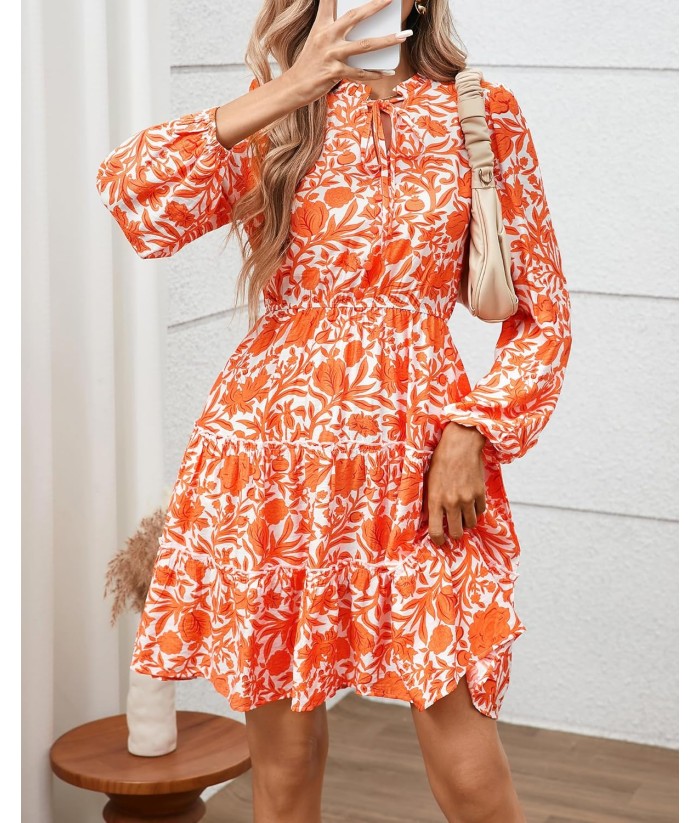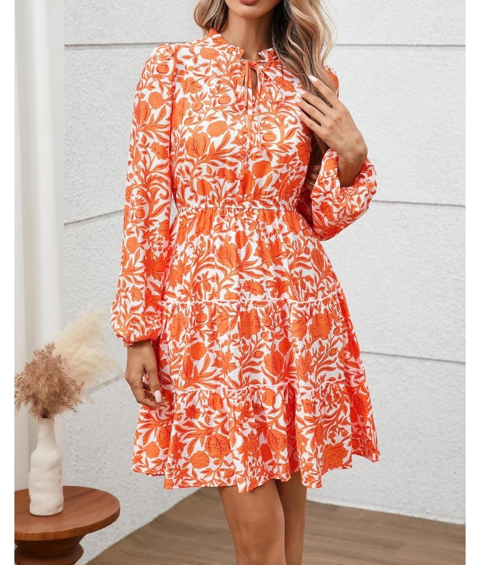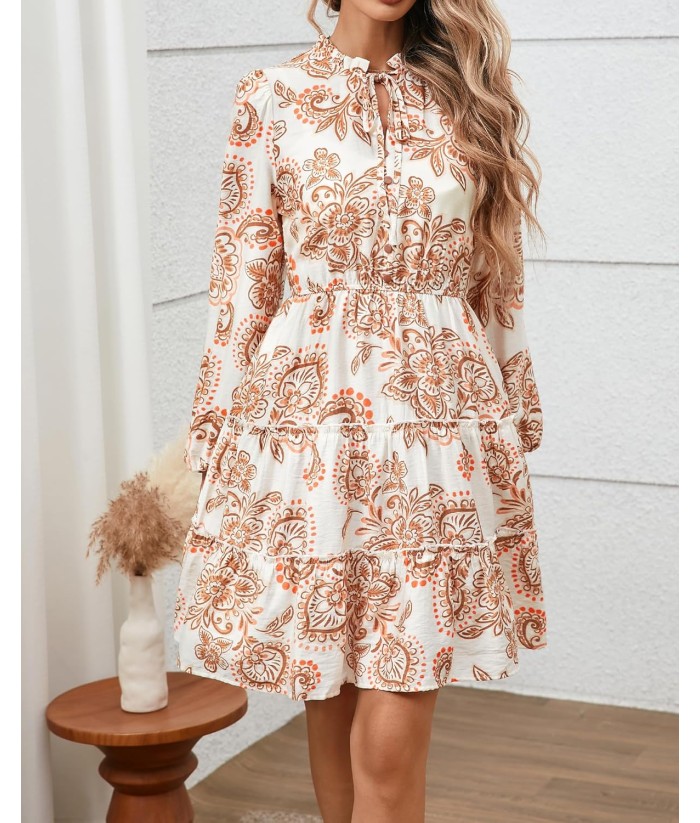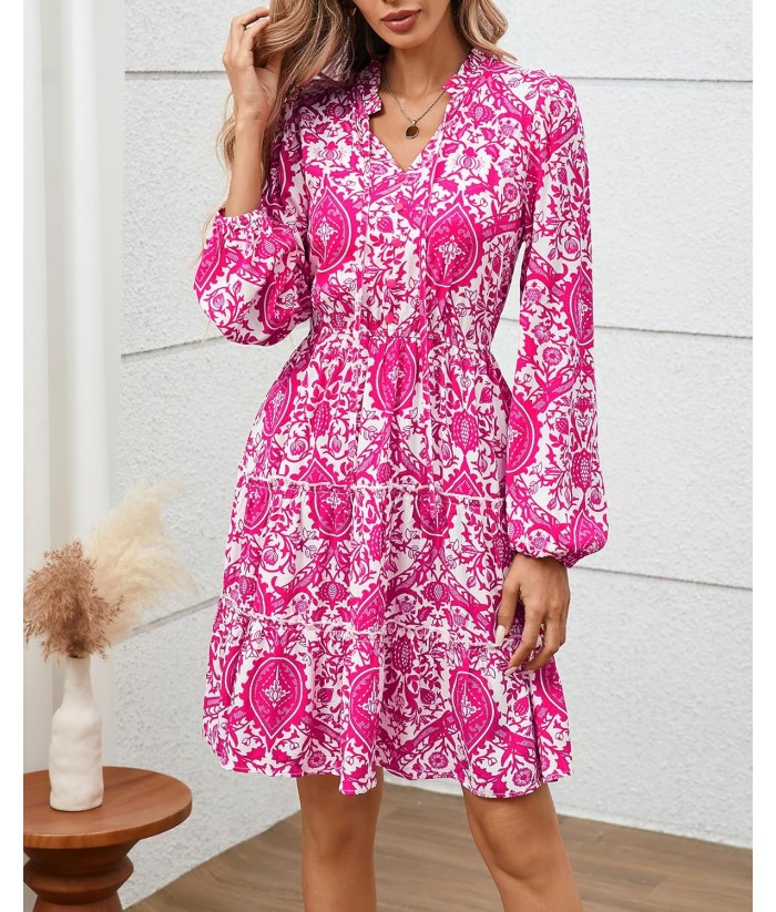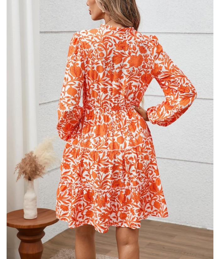 BTFBM Women Fall Dresses 2025 Floral V Neck Long Sleeve Tiered Ruffle Boho Swing Flowy A-Line Mini Dresses Vacation