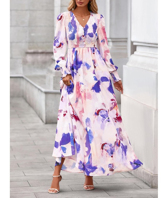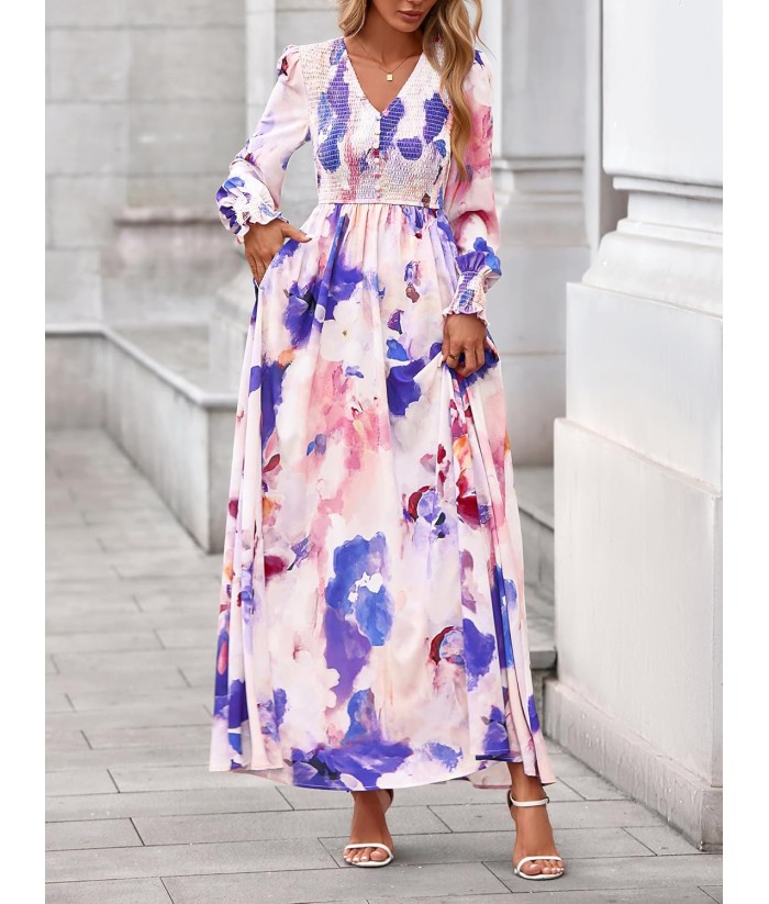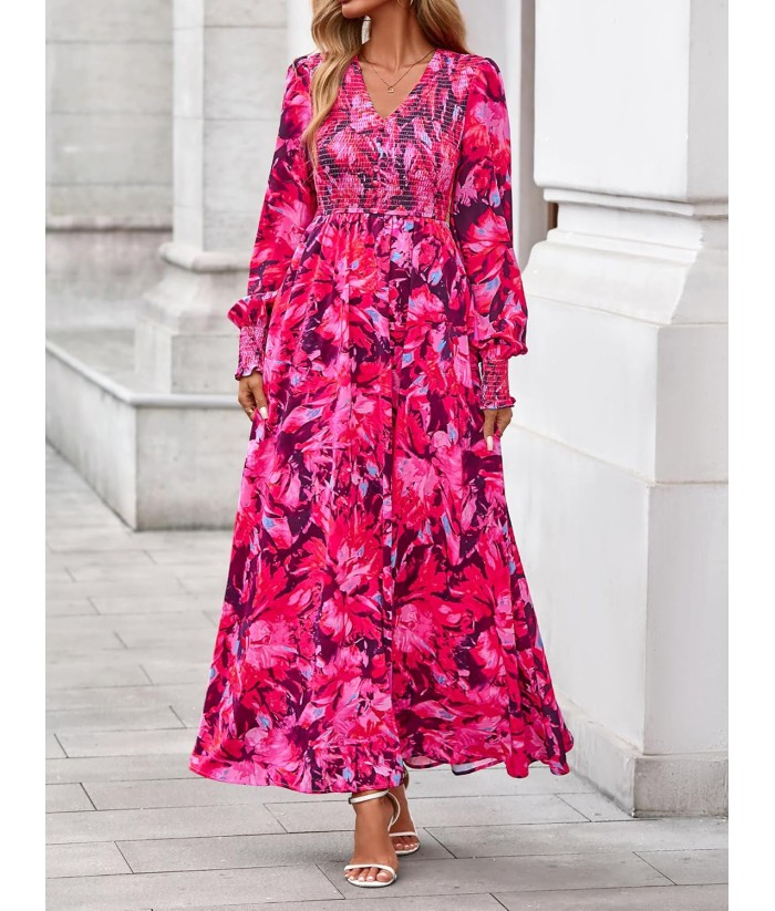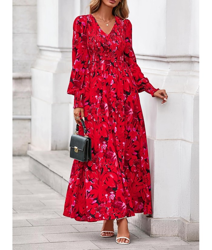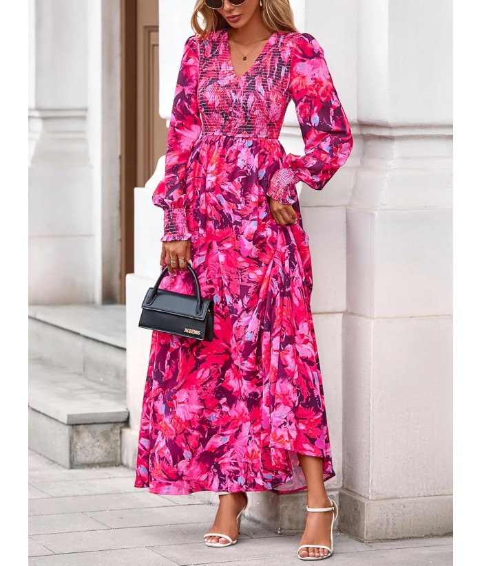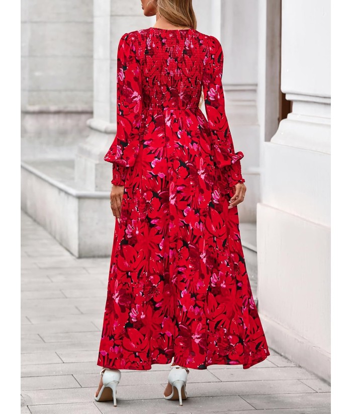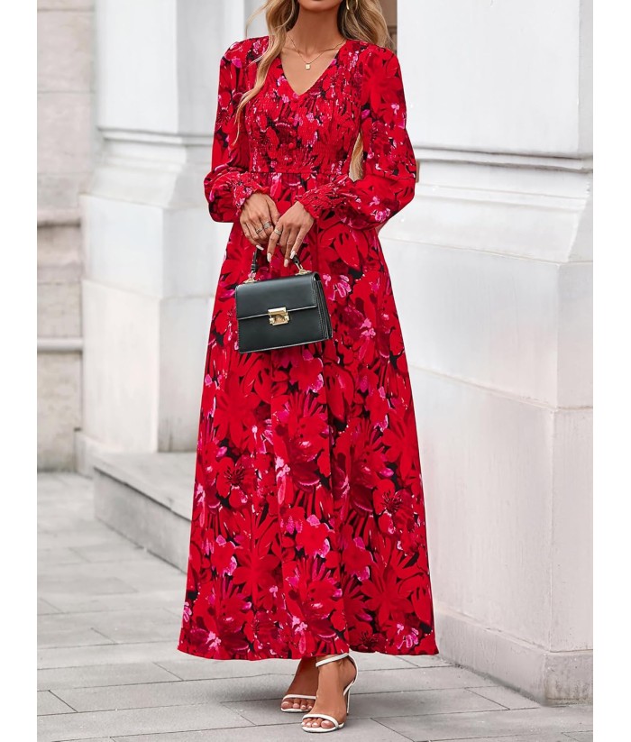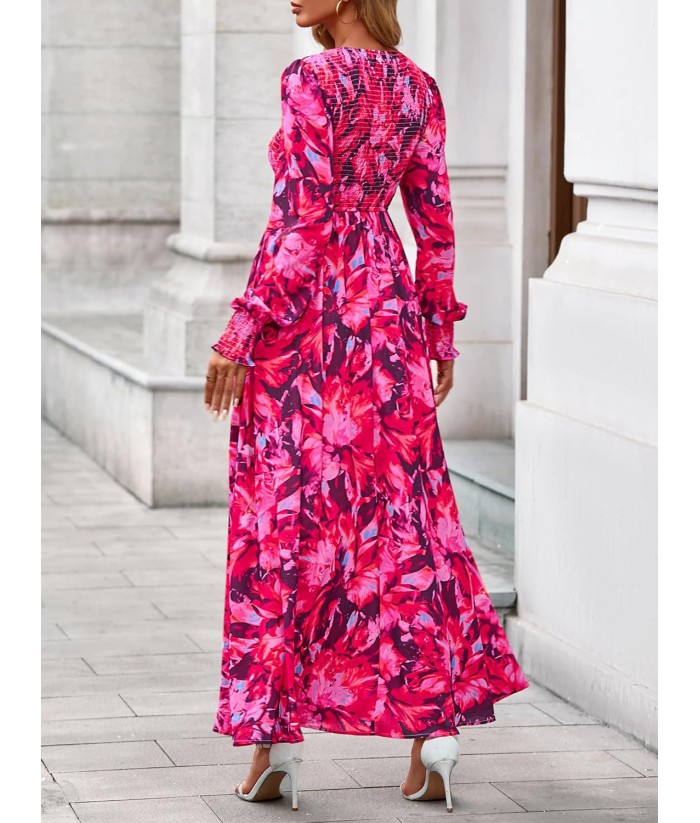 BTFBM Women Fall Wedding Guest Maxi Dresses 2025 Floral V Neck Long Sleeve Boho Long Dress Vacation
