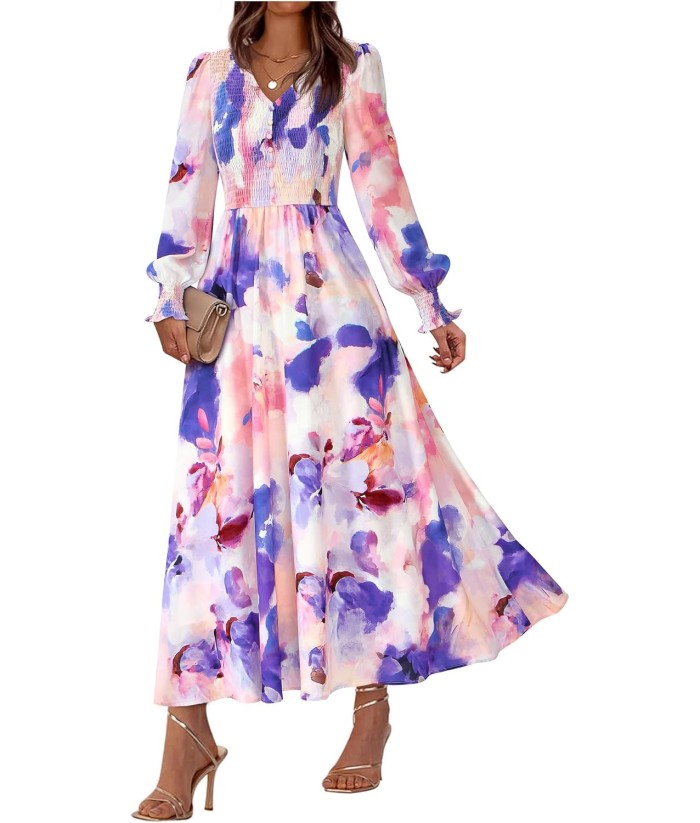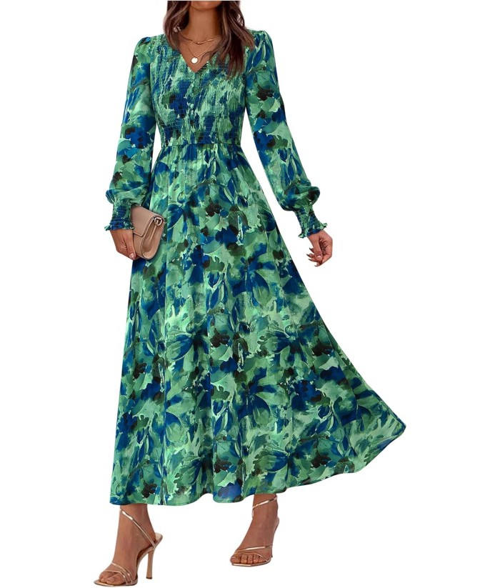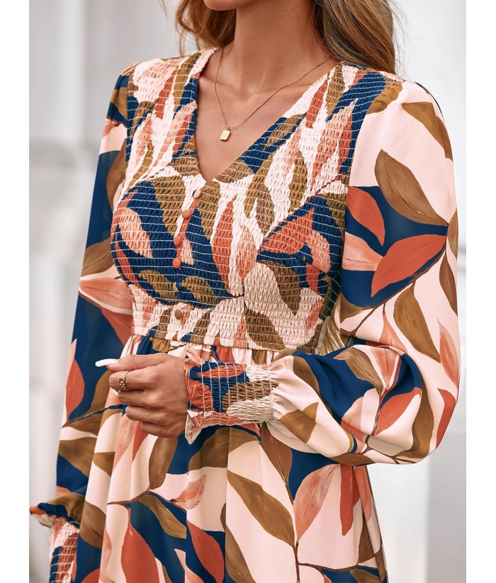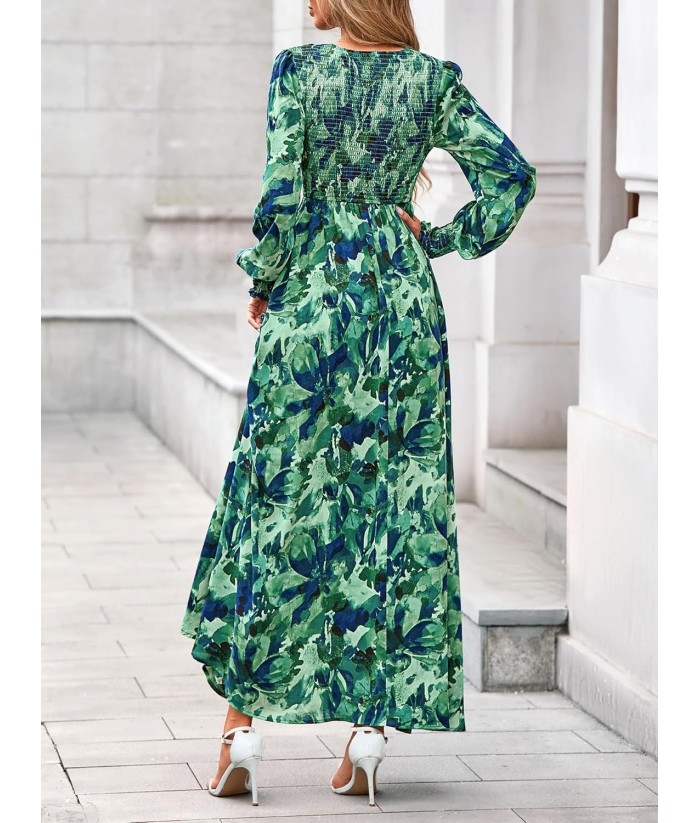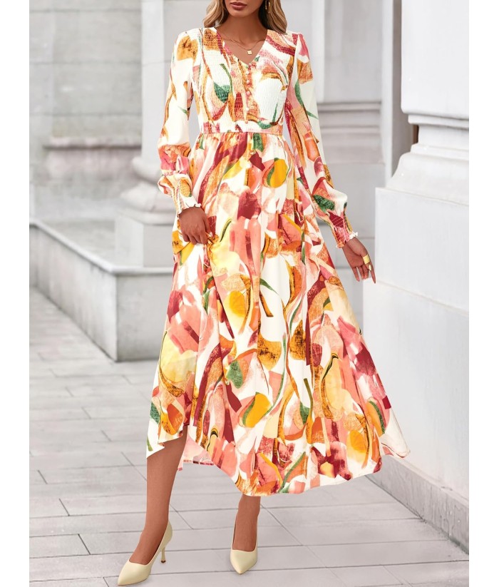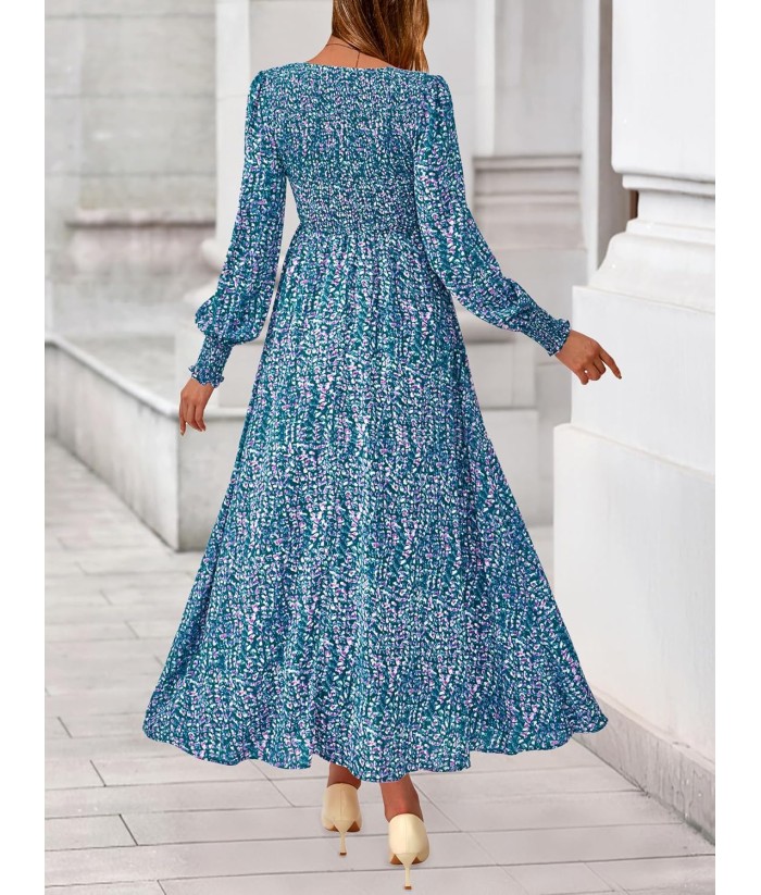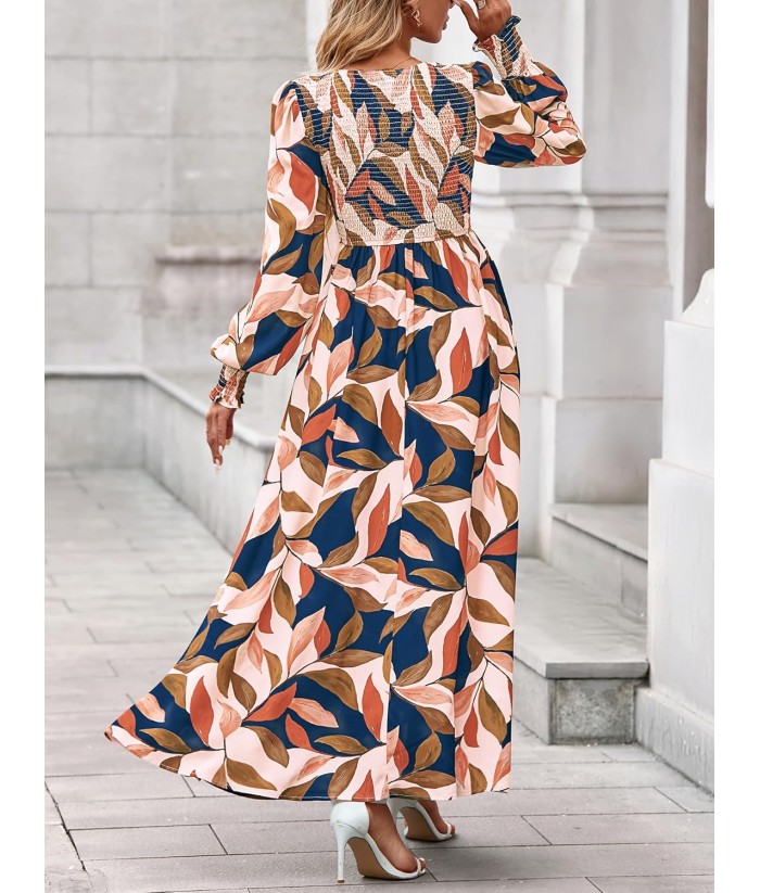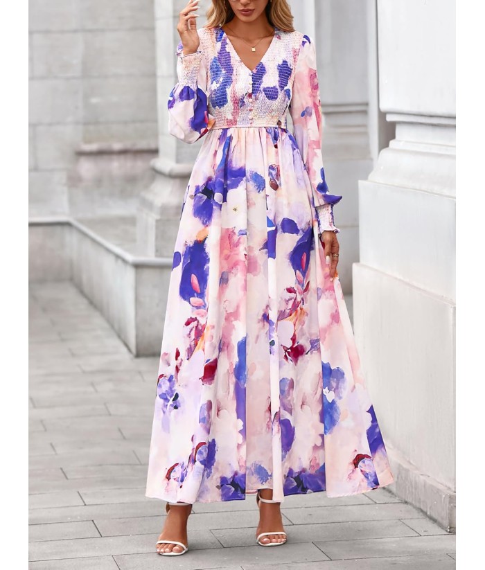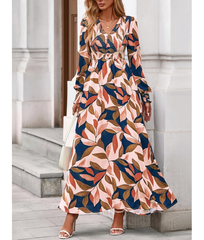 BTFBM Women Fall Wedding Guest Maxi Dresses 2025 Floral V Neck Long Sleeve Boho Long Dress Vacation