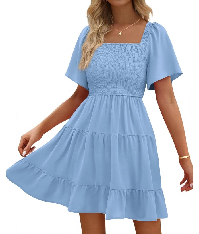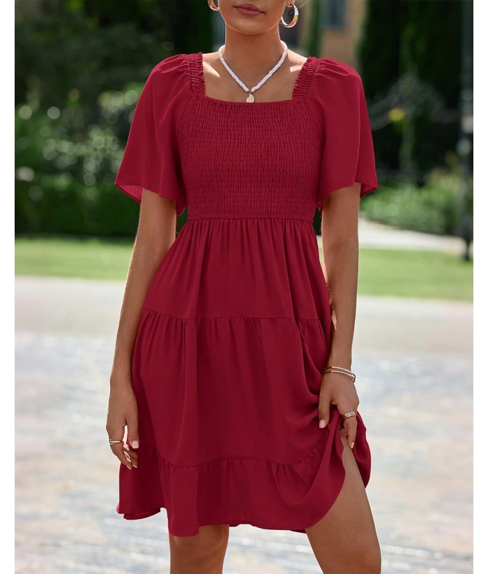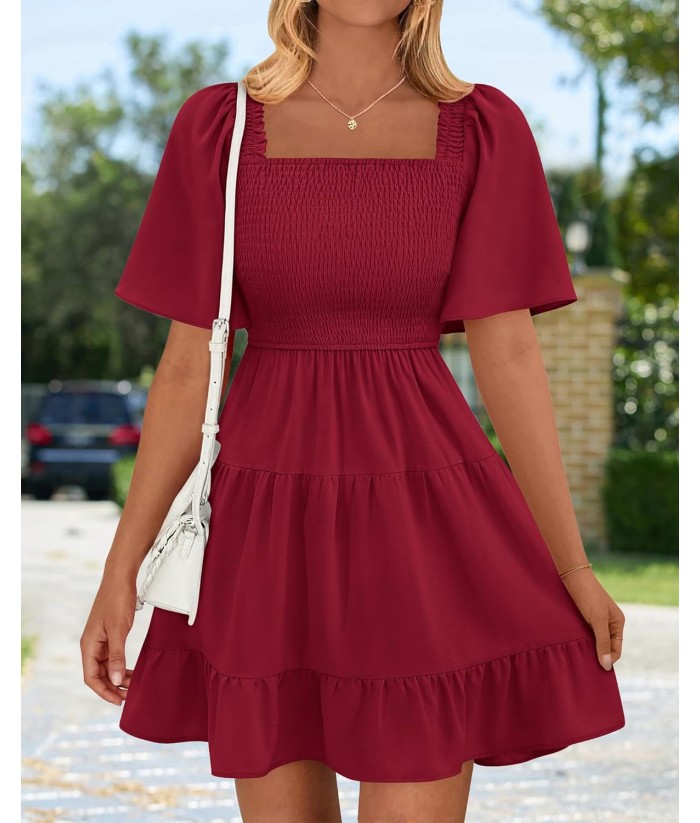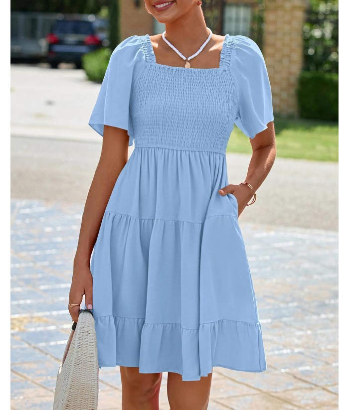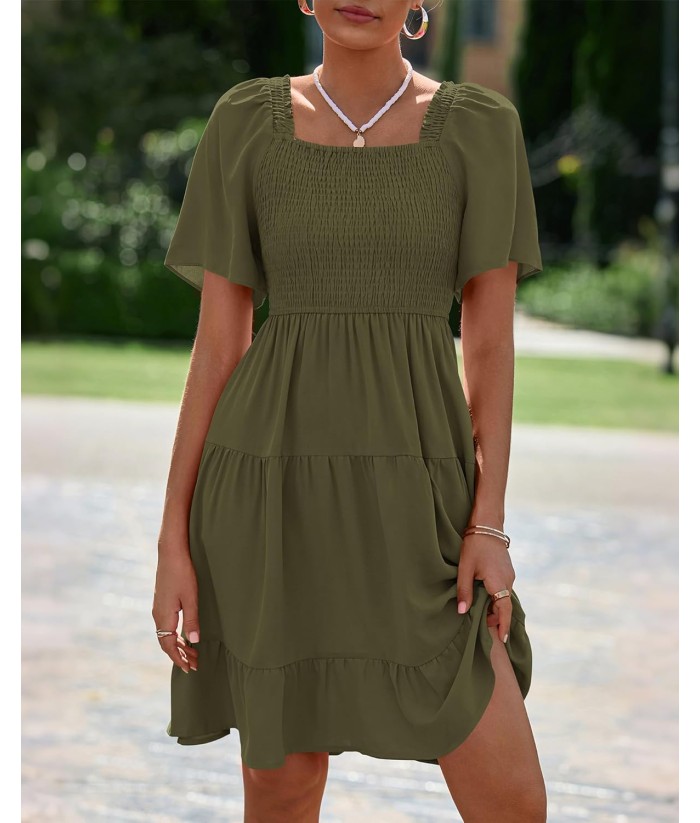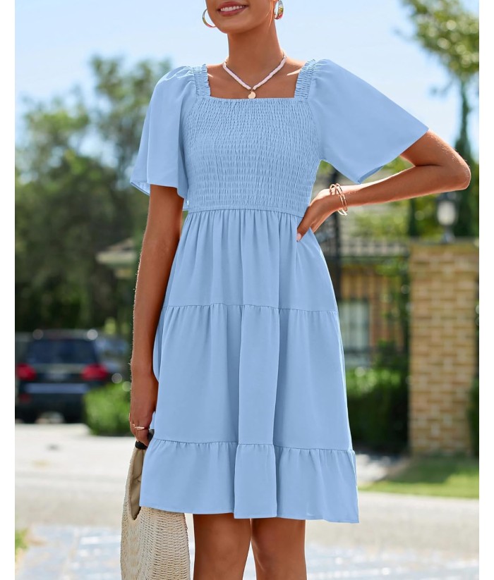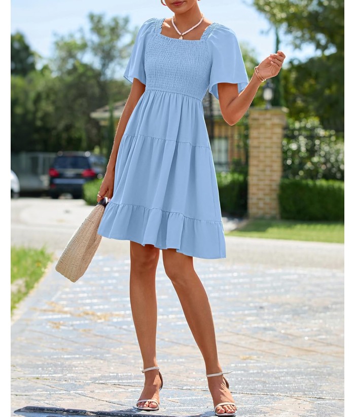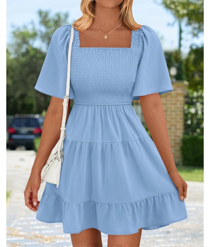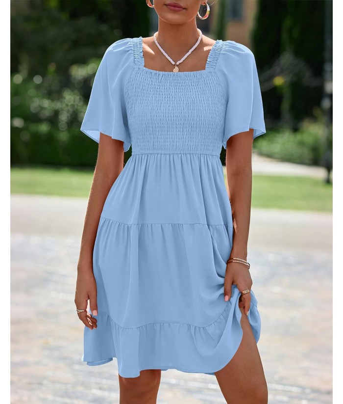 BTFBM Women's Summer Smocked Mini Dress Square Neck Flutter Sleeve Casual Ruffle Flared Swing Boho Beach Dresses Pockets