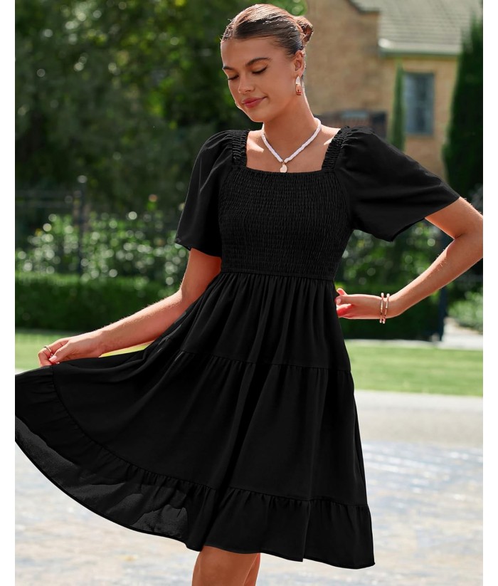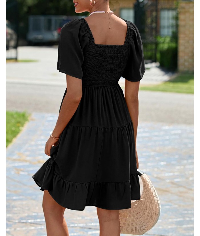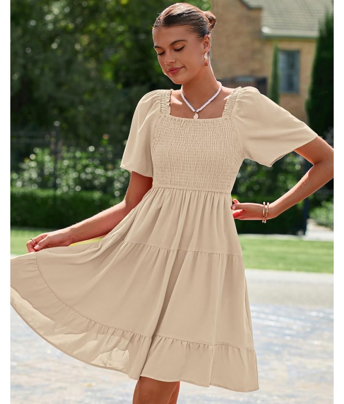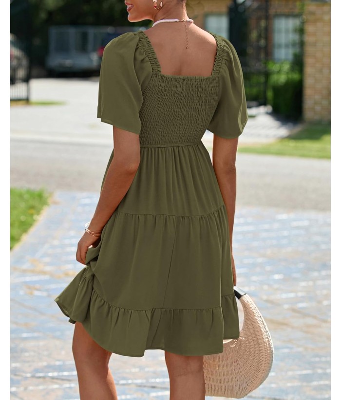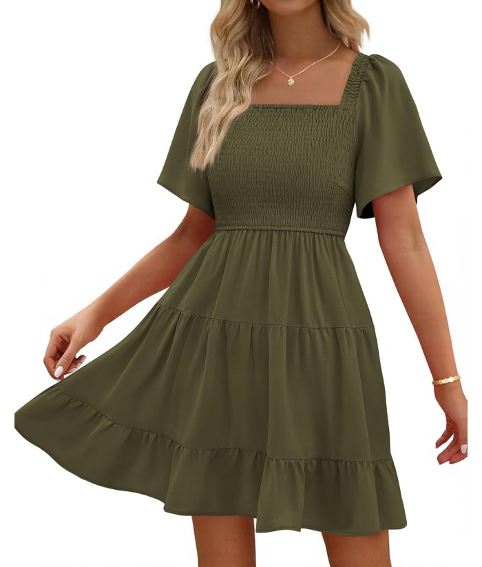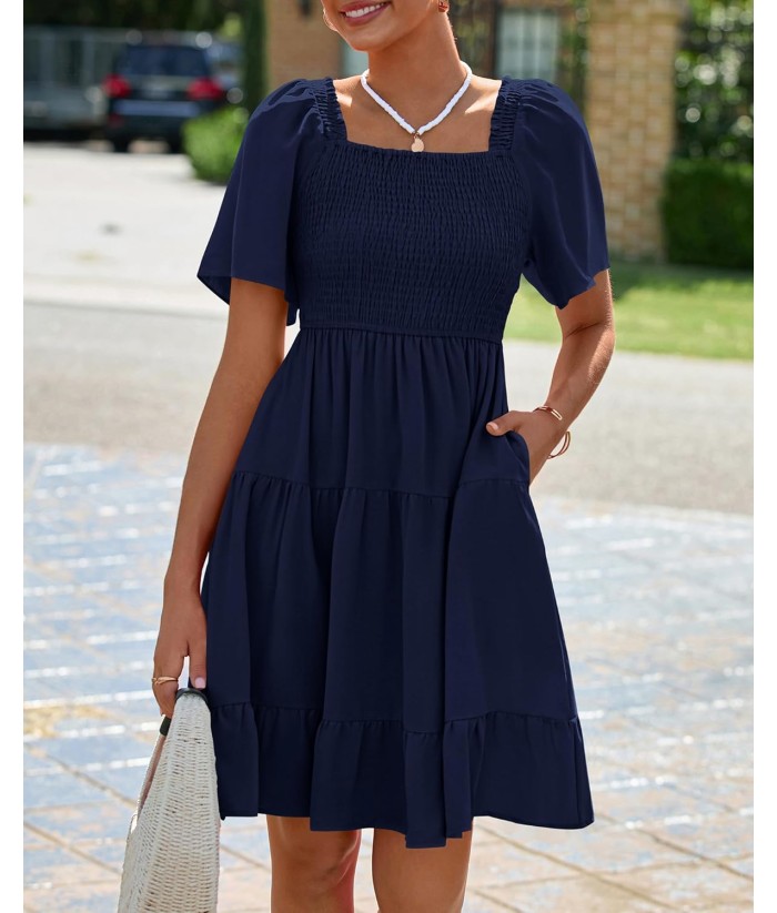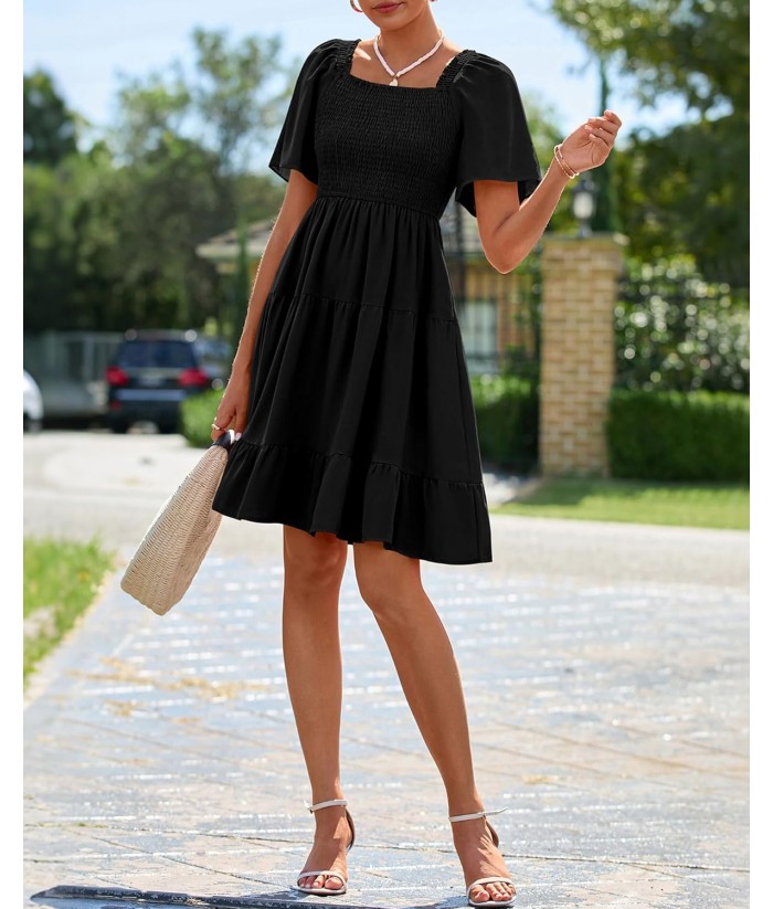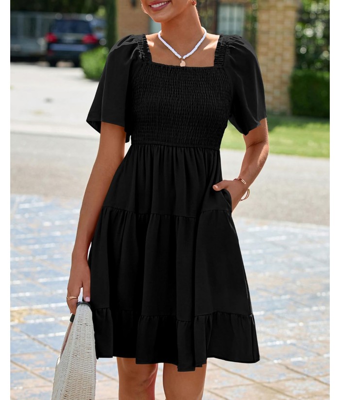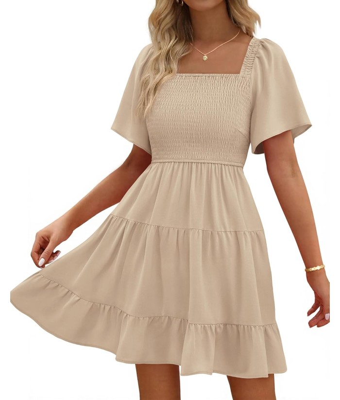 BTFBM Women's Summer Smocked Mini Dress Square Neck Flutter Sleeve Casual Ruffle Flared Swing Boho Beach Dresses Pockets