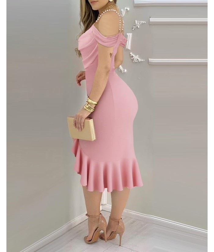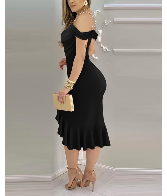 CHICME Womens Sexy Bodycon Party Dress Off The Shoulder Pearls Strap Midi Dress Ruffle Hem Cocktail Dresses