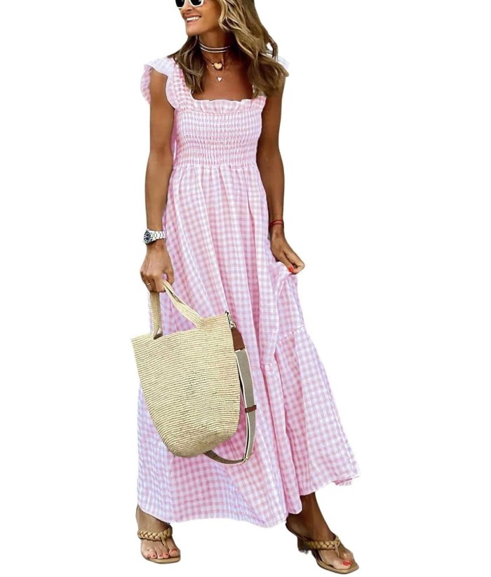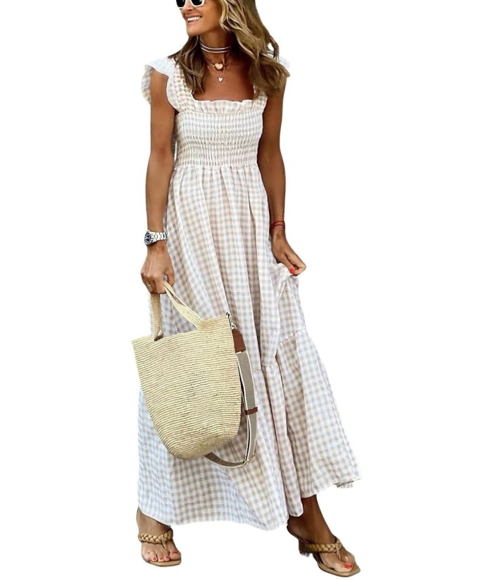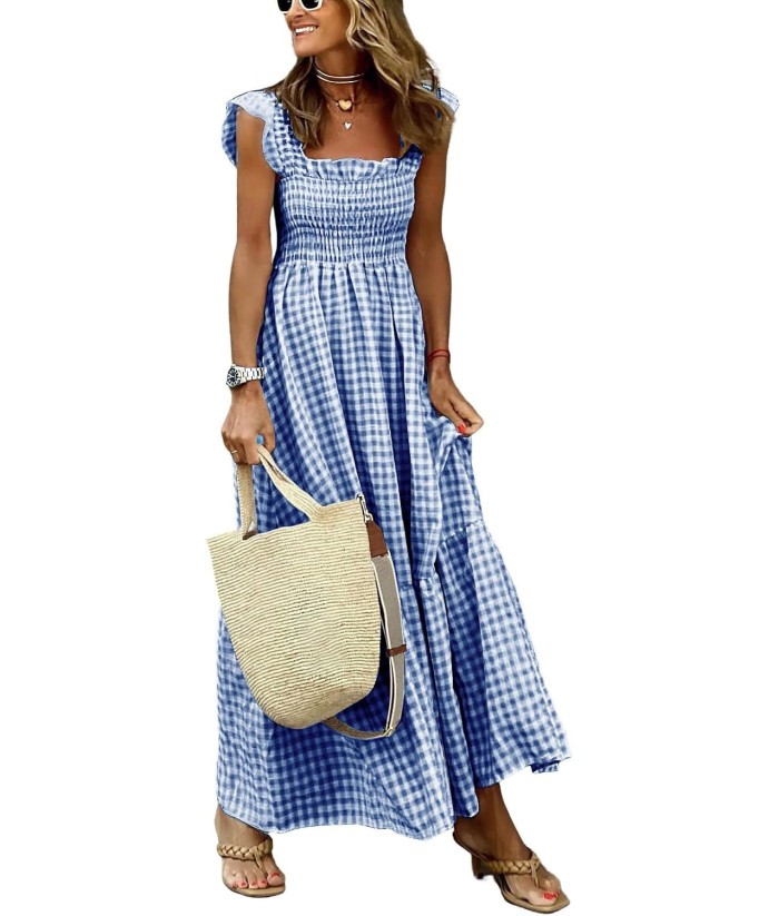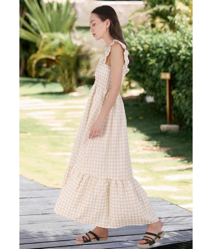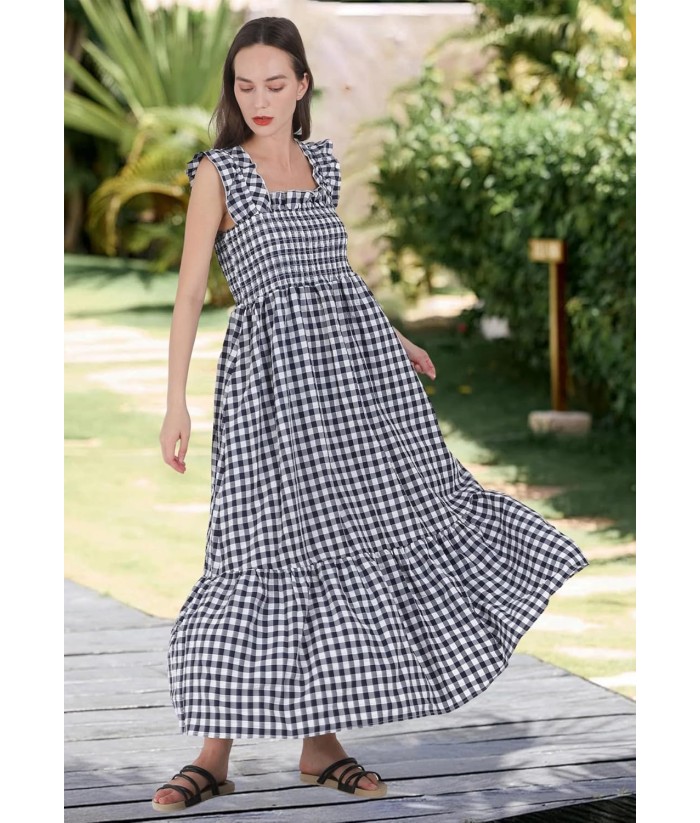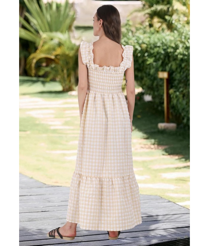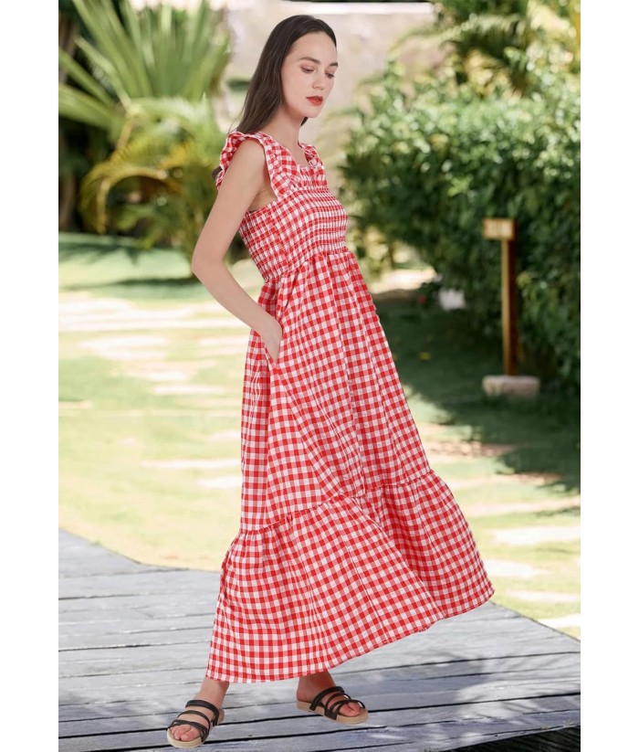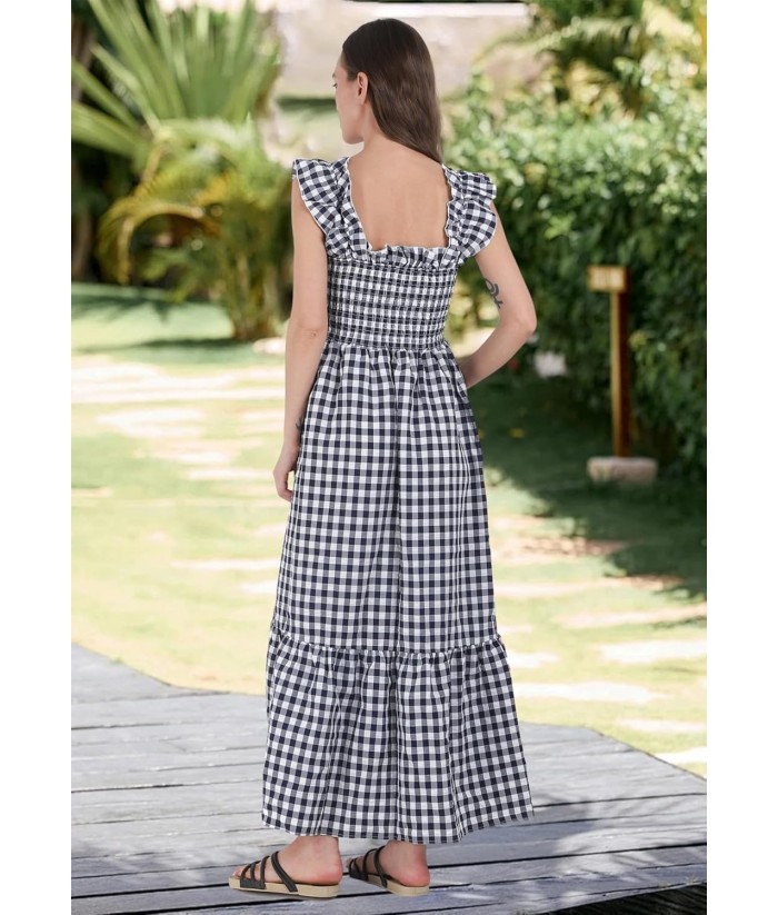 chouyatou Women's Retro Plaid Smocked Dress Spaghetti Strap Flounce Long Dress