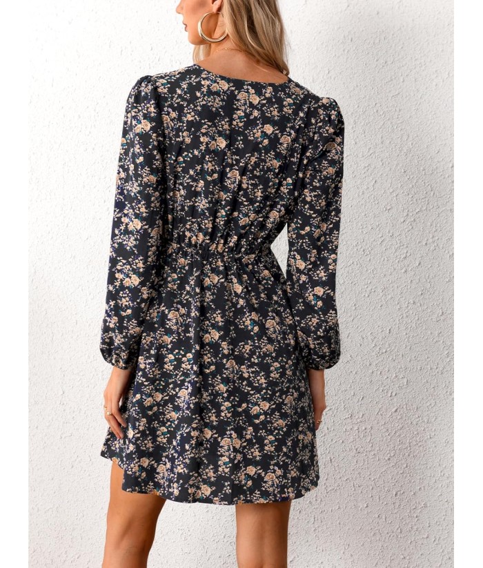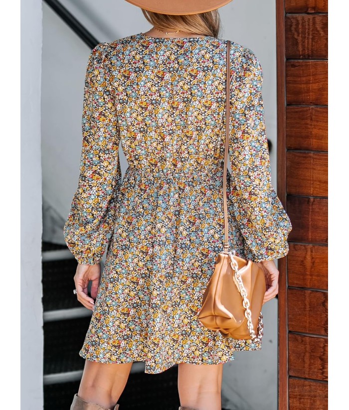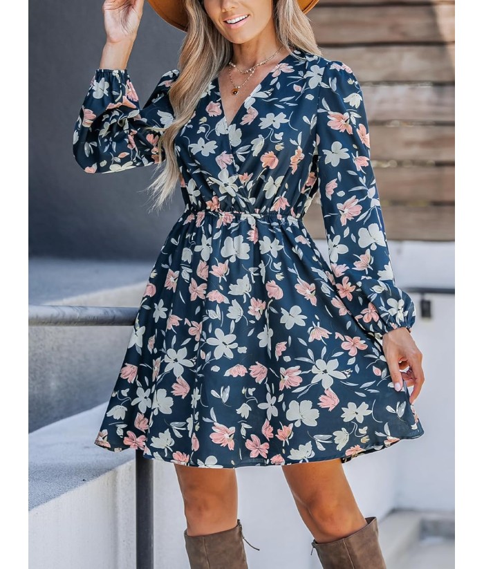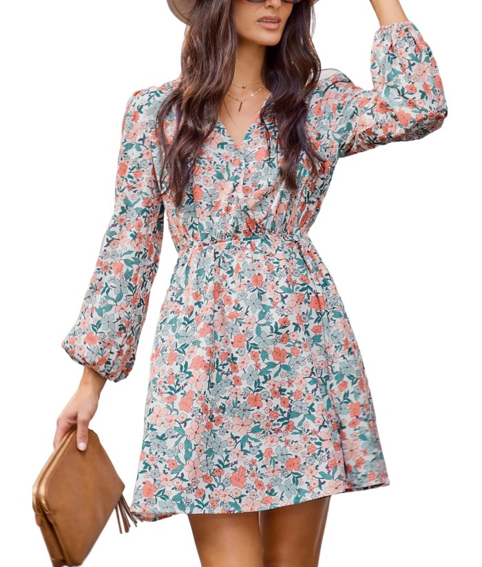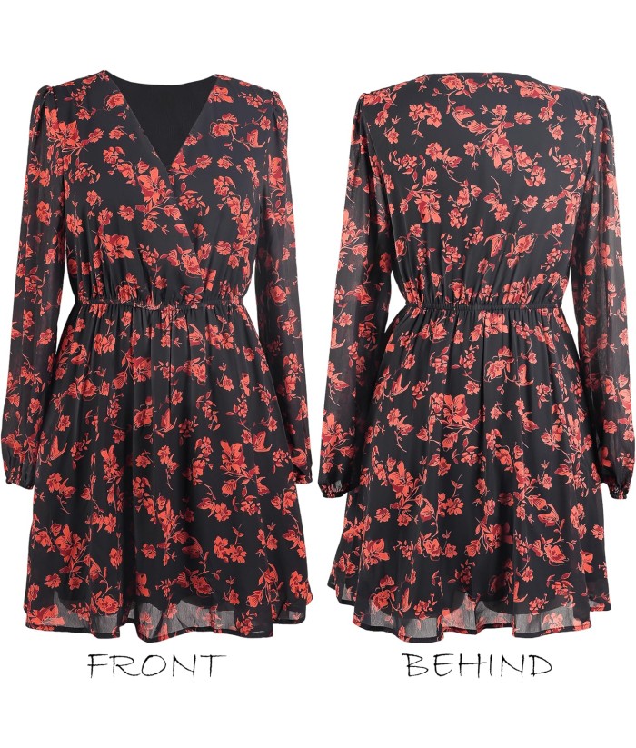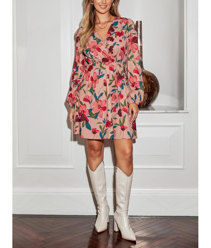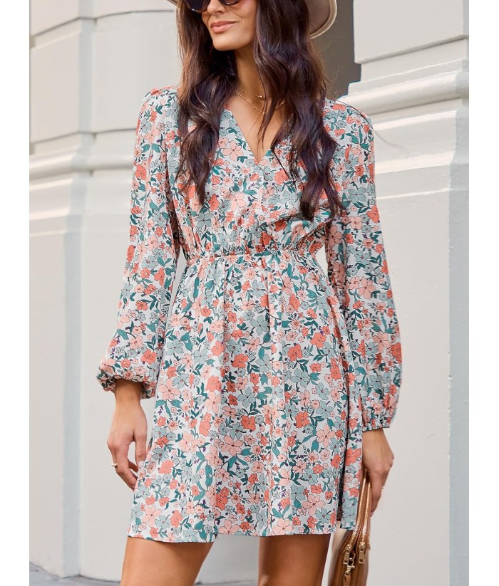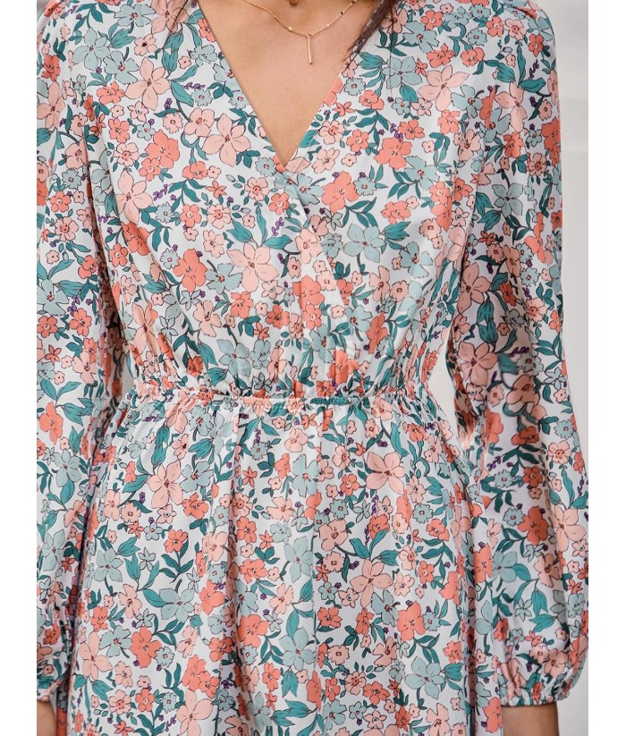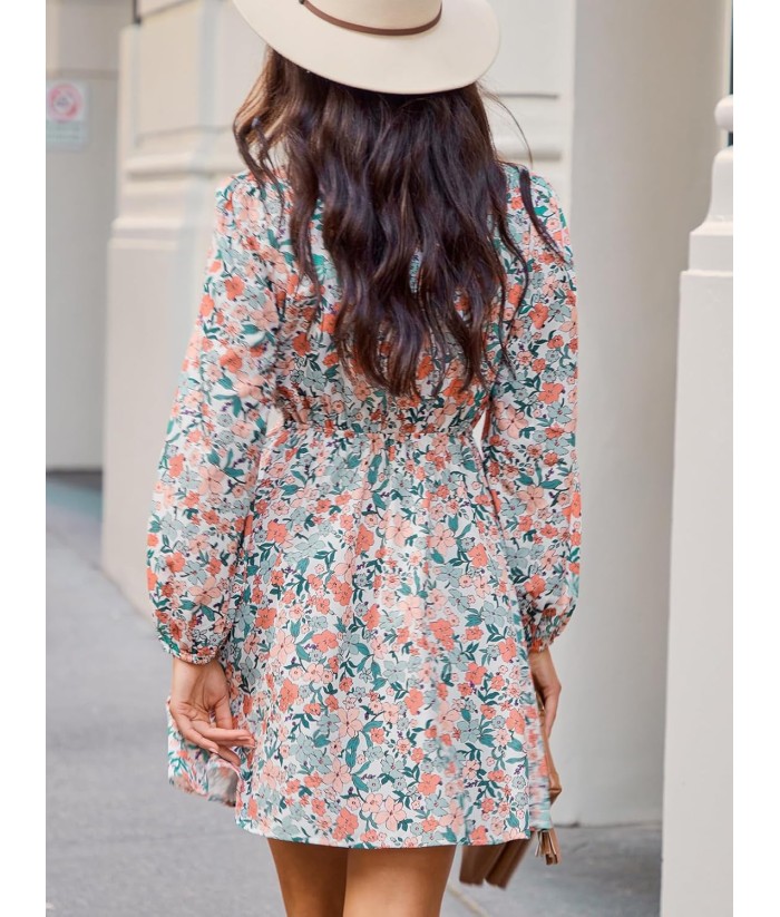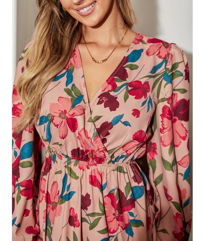 CUPSHE Women Floral Ruffle Summer Dress Surplice V Neck Long Peasant Sleeve Elastic Waist Flowy Casual Holiday Mini Dress