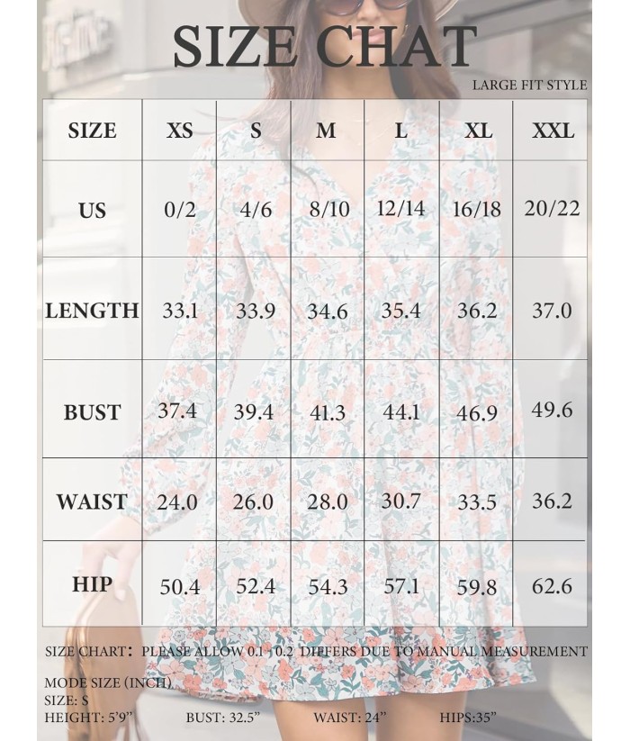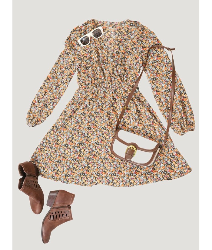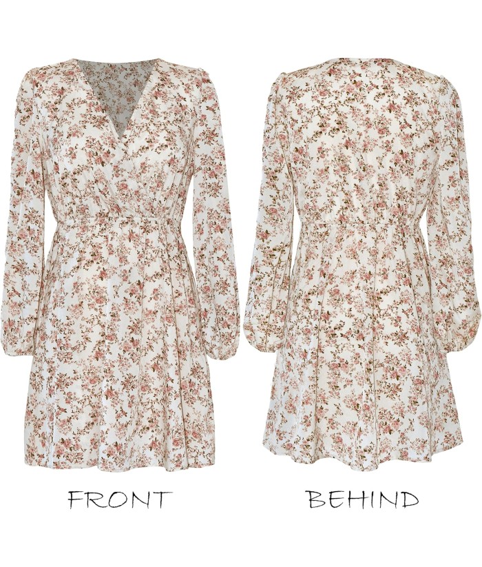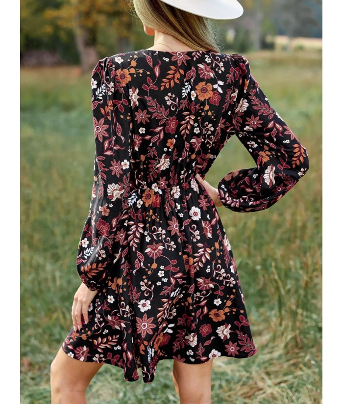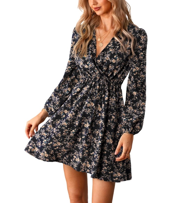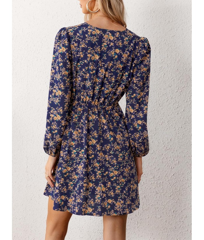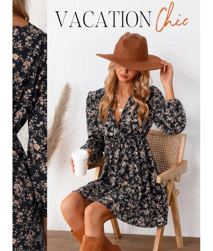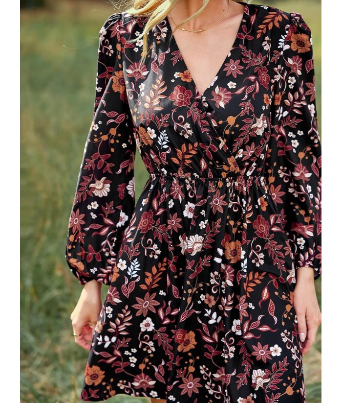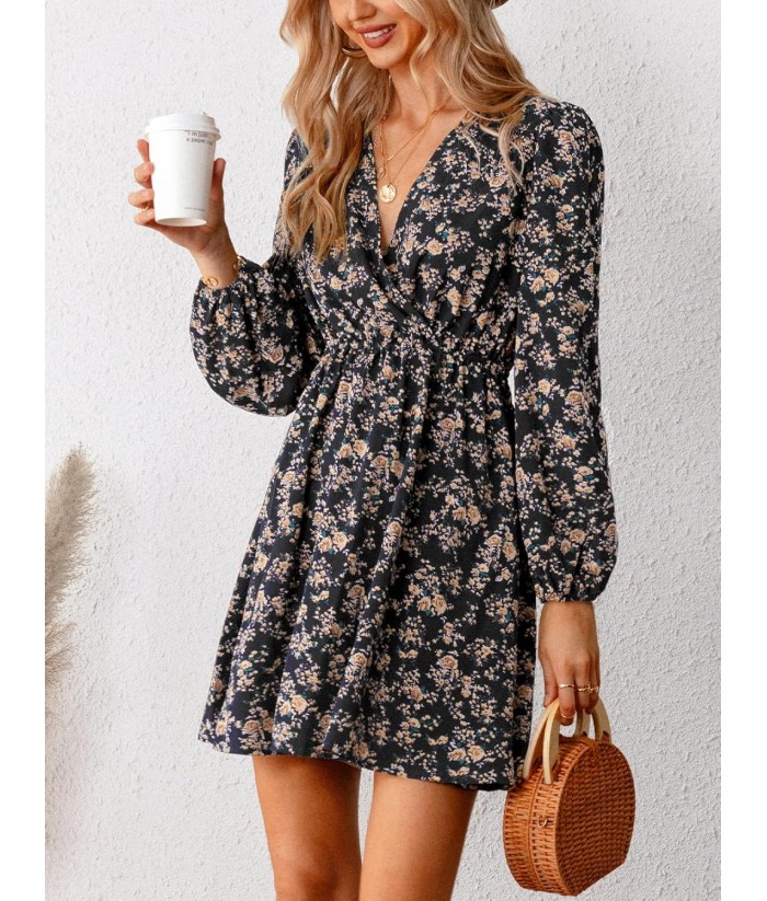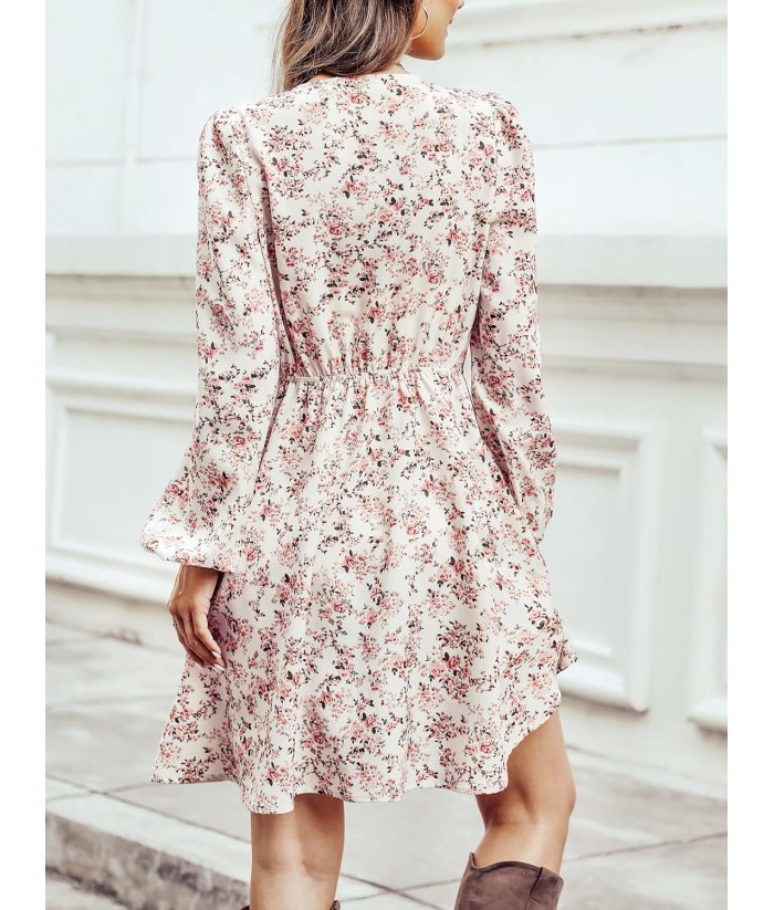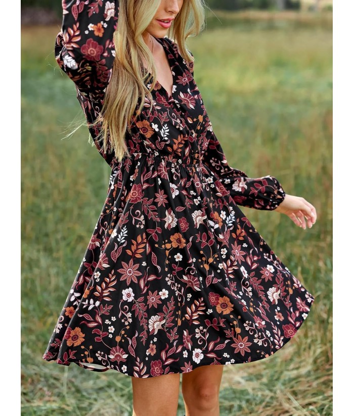 CUPSHE Women Floral Ruffle Summer Dress Surplice V Neck Long Peasant Sleeve Elastic Waist Flowy Casual Holiday Mini Dress