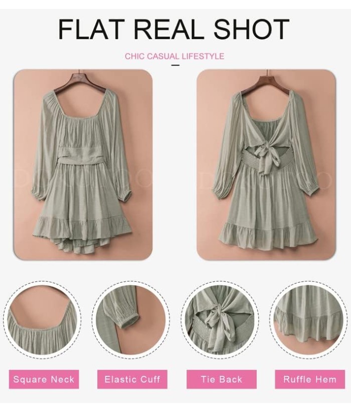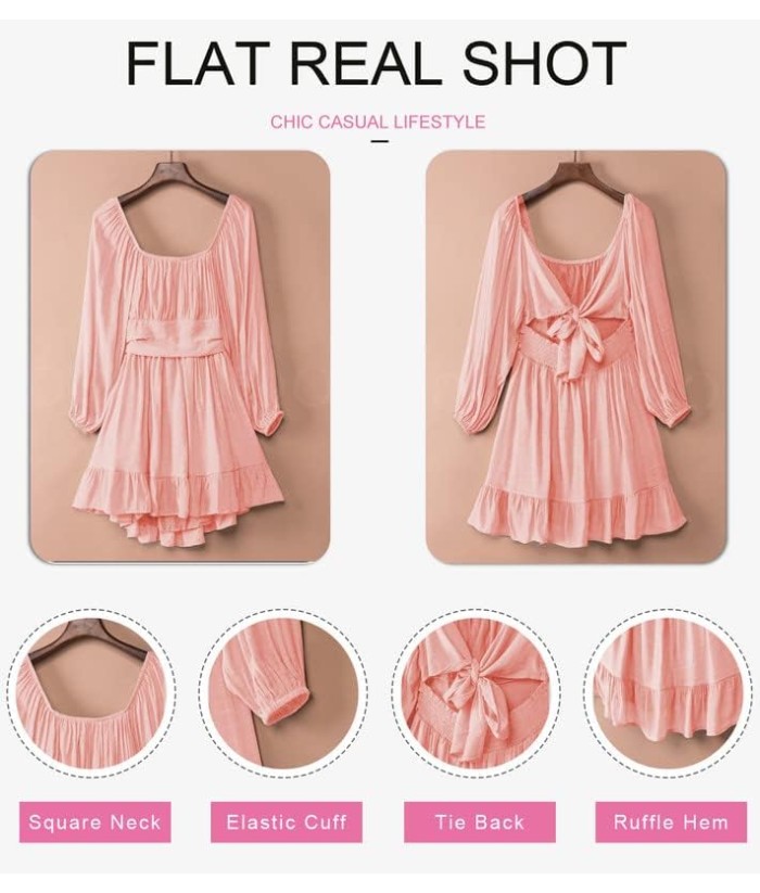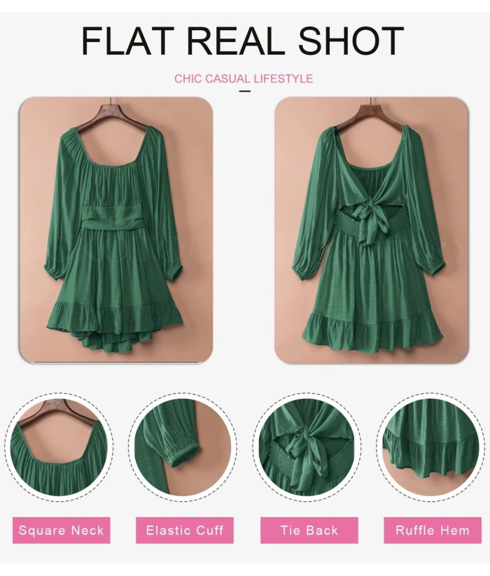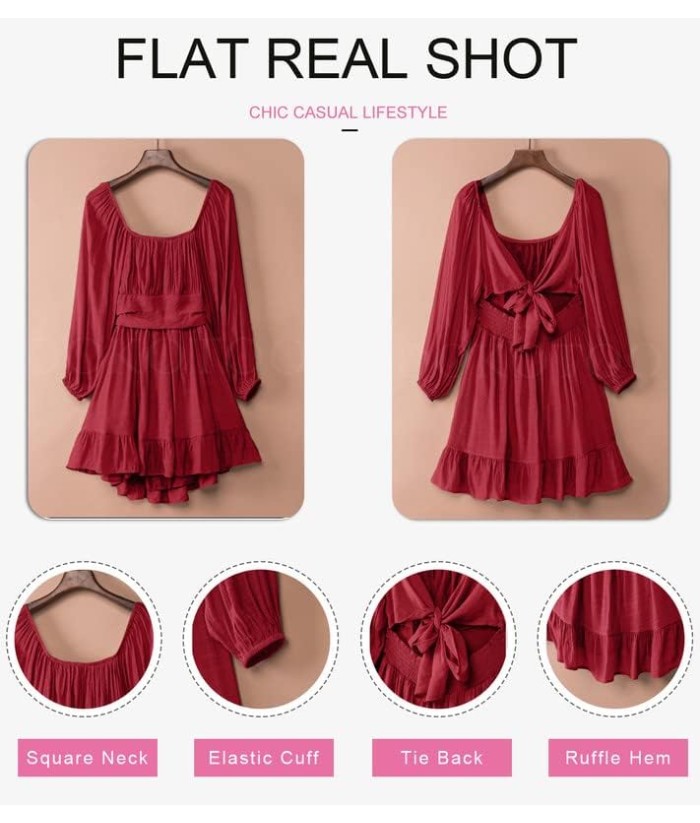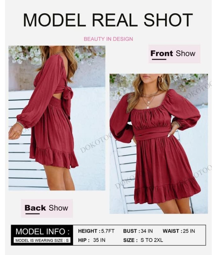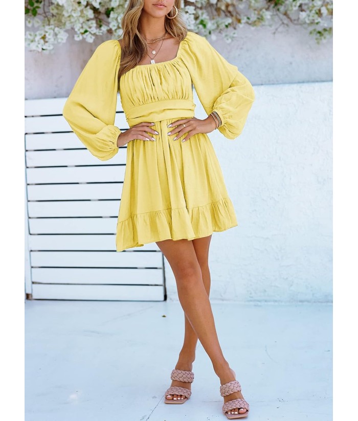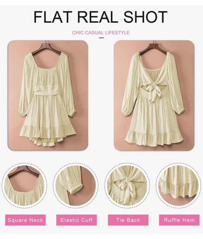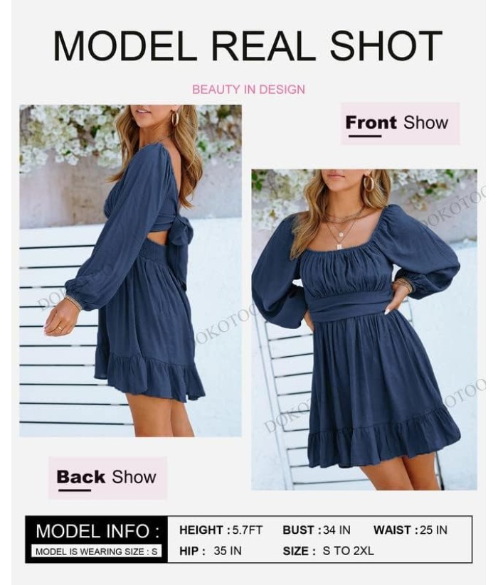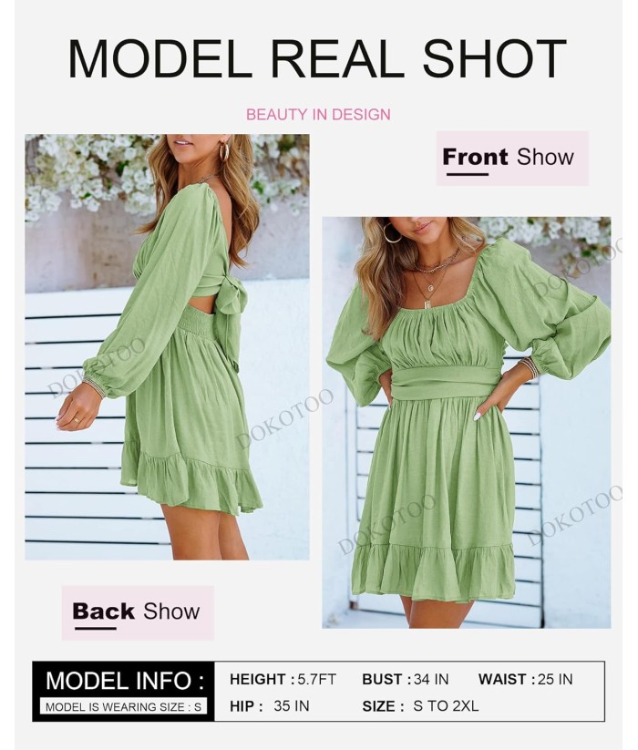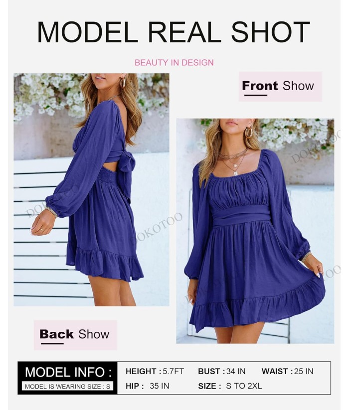 Dokotoo Womens Dress Long Lantern Sleeve Square Neck Tie Backless Sexy Dress Ruffle Elastic Waist A-Line Mini Dress