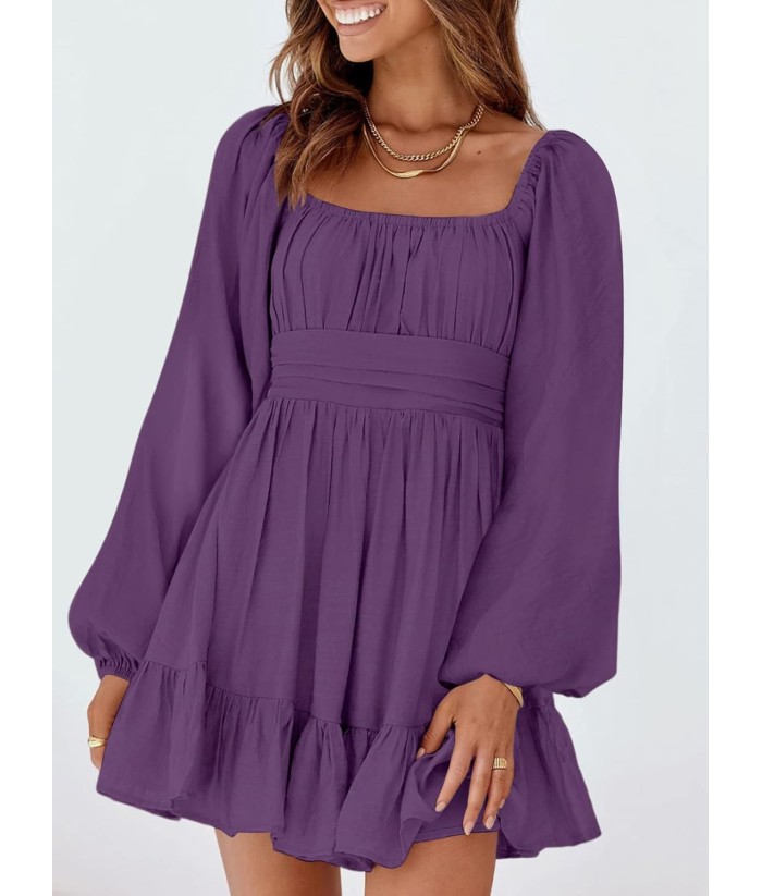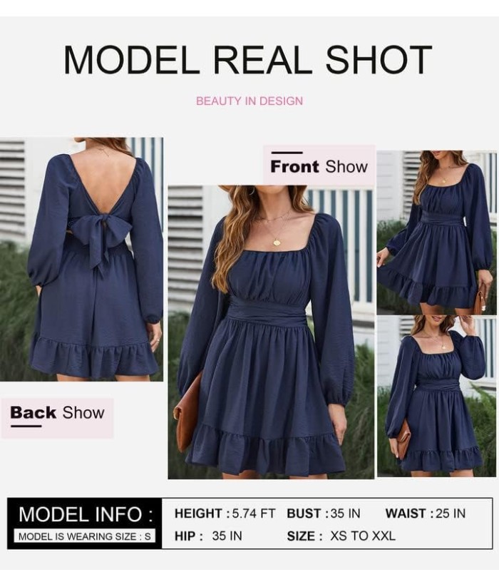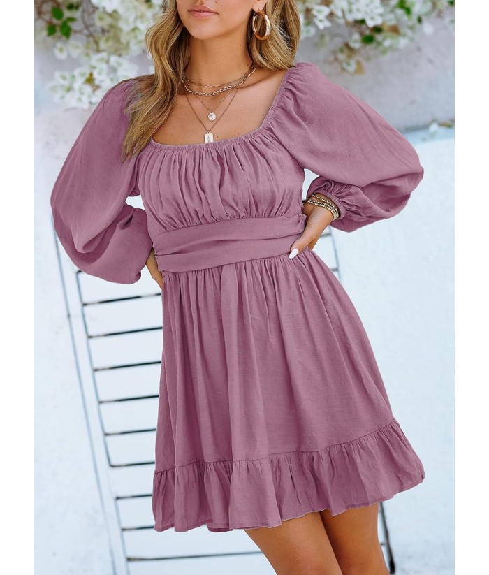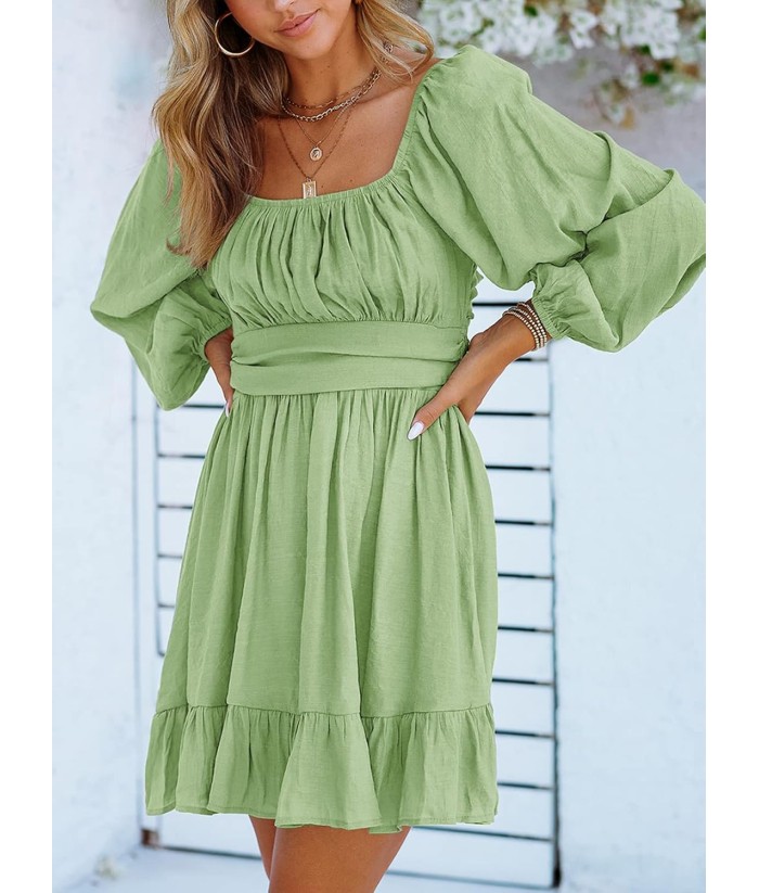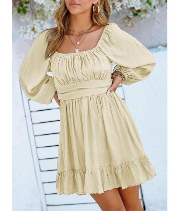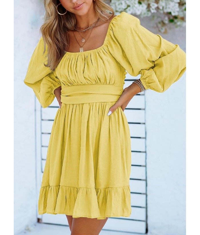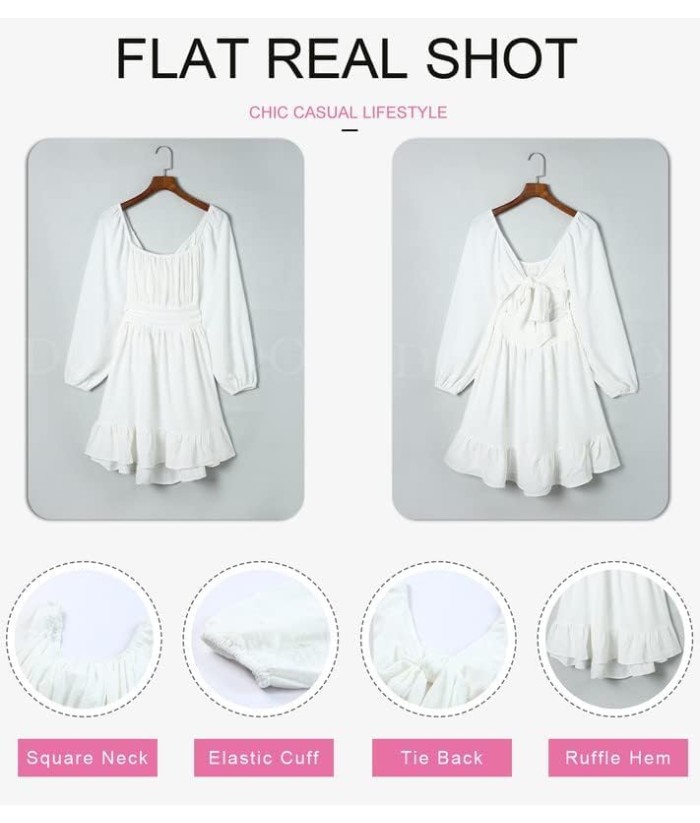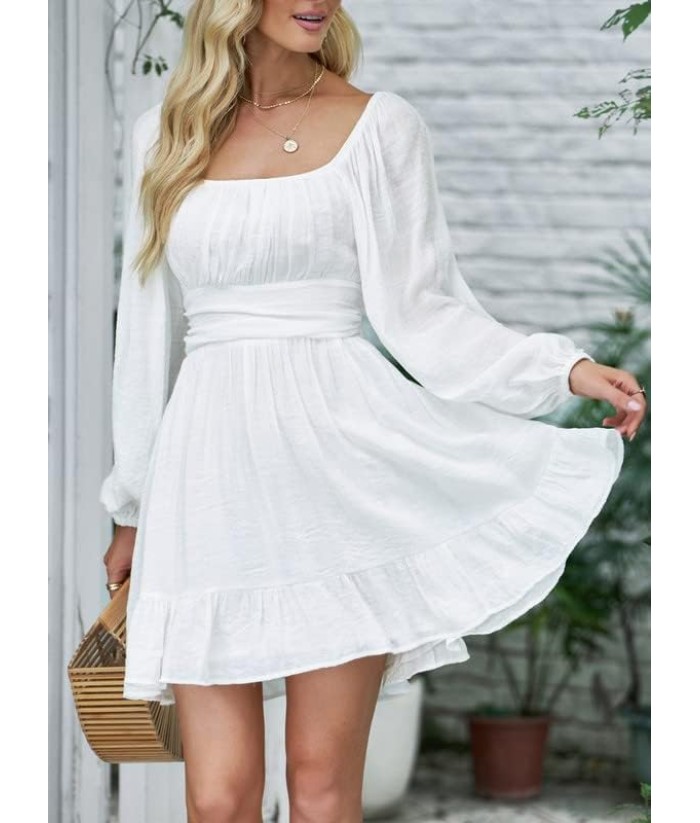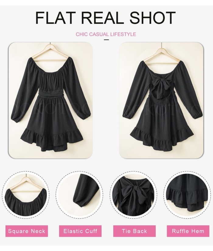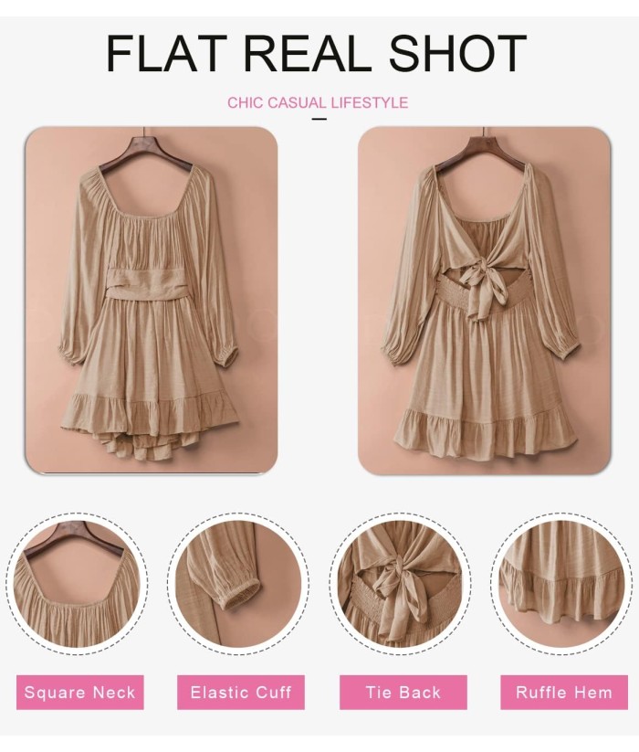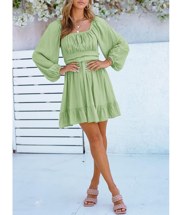 Dokotoo Womens Dress Long Lantern Sleeve Square Neck Tie Backless Sexy Dress Ruffle Elastic Waist A-Line Mini Dress