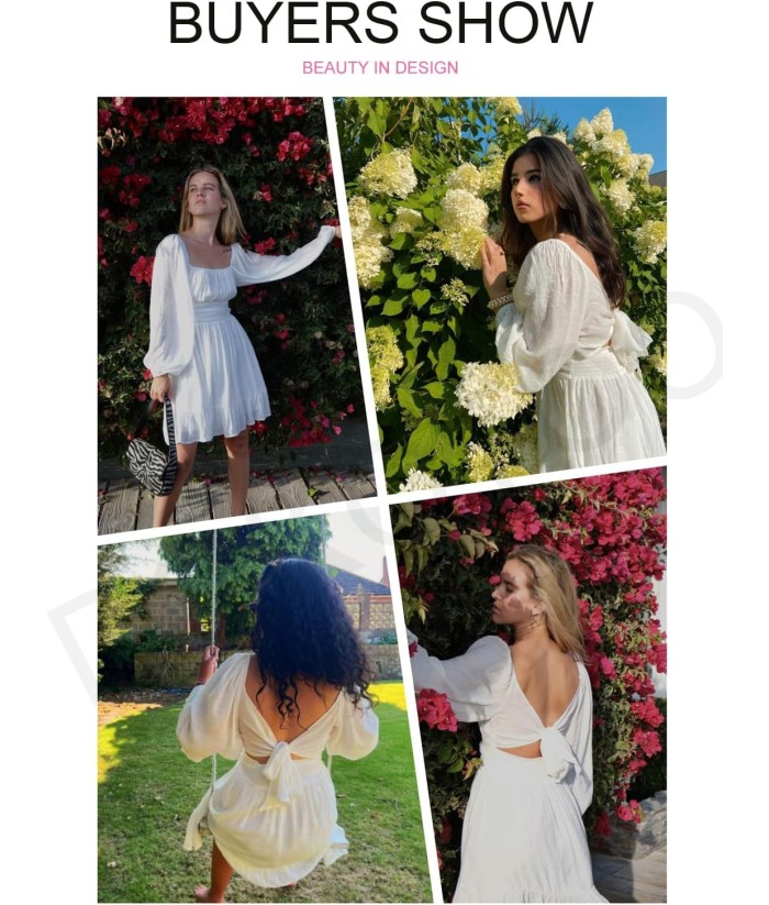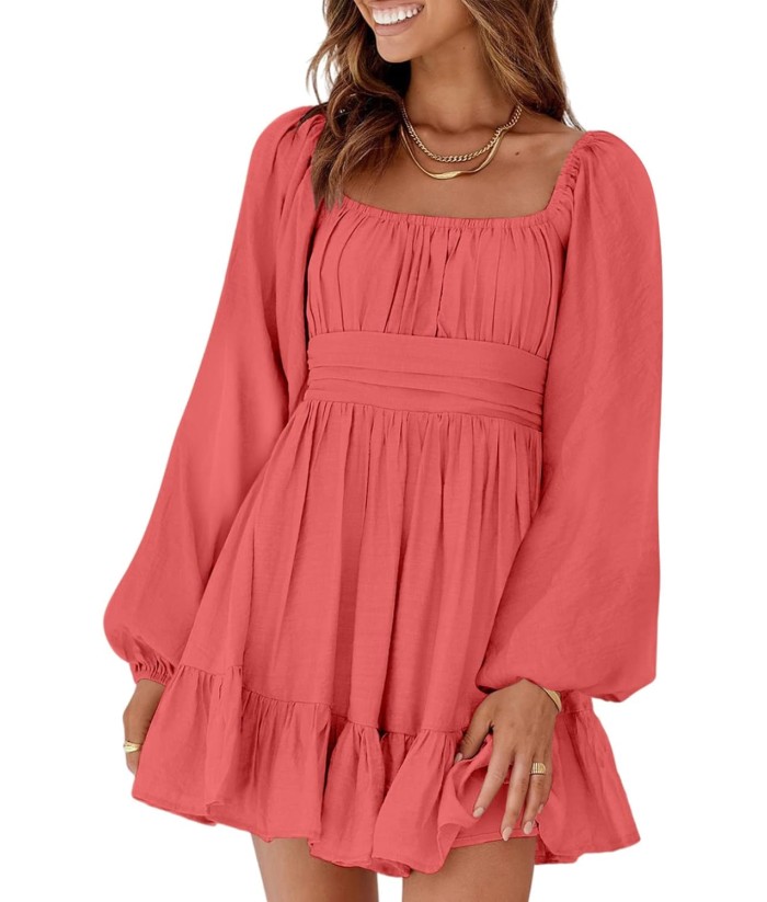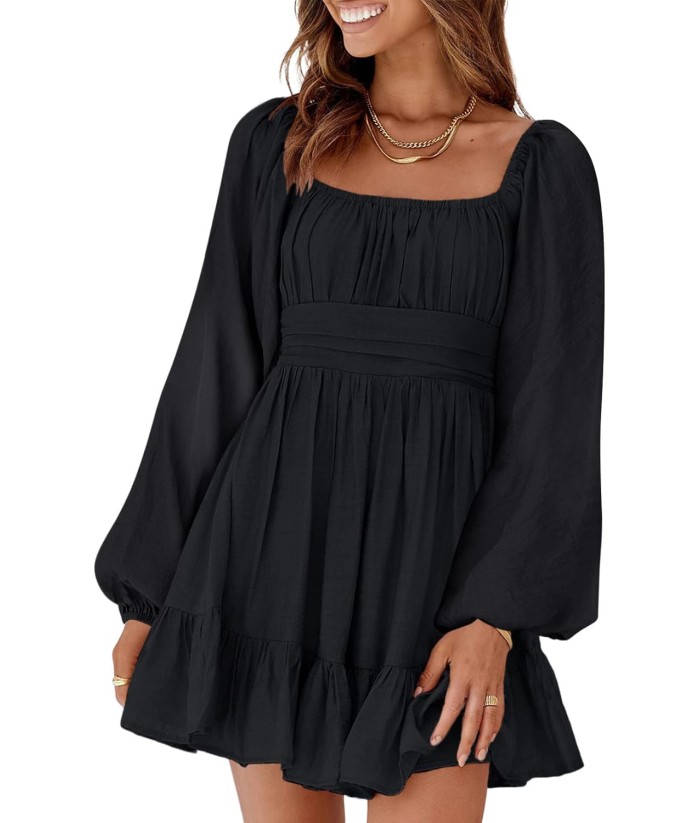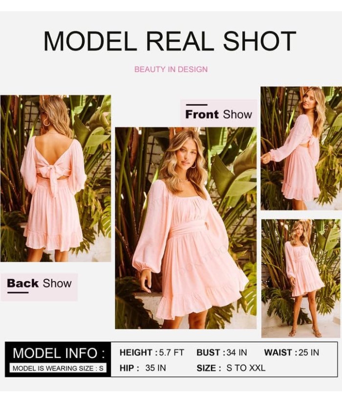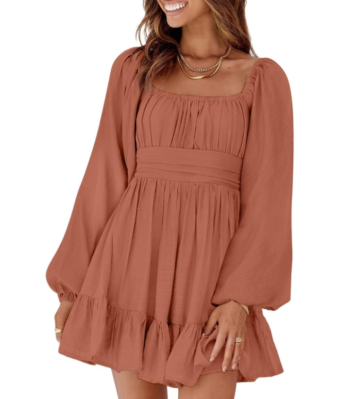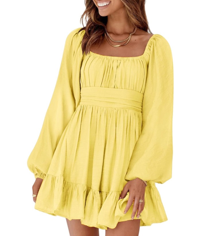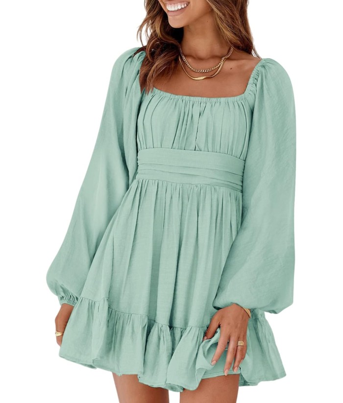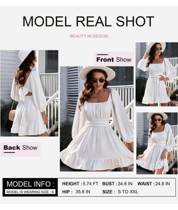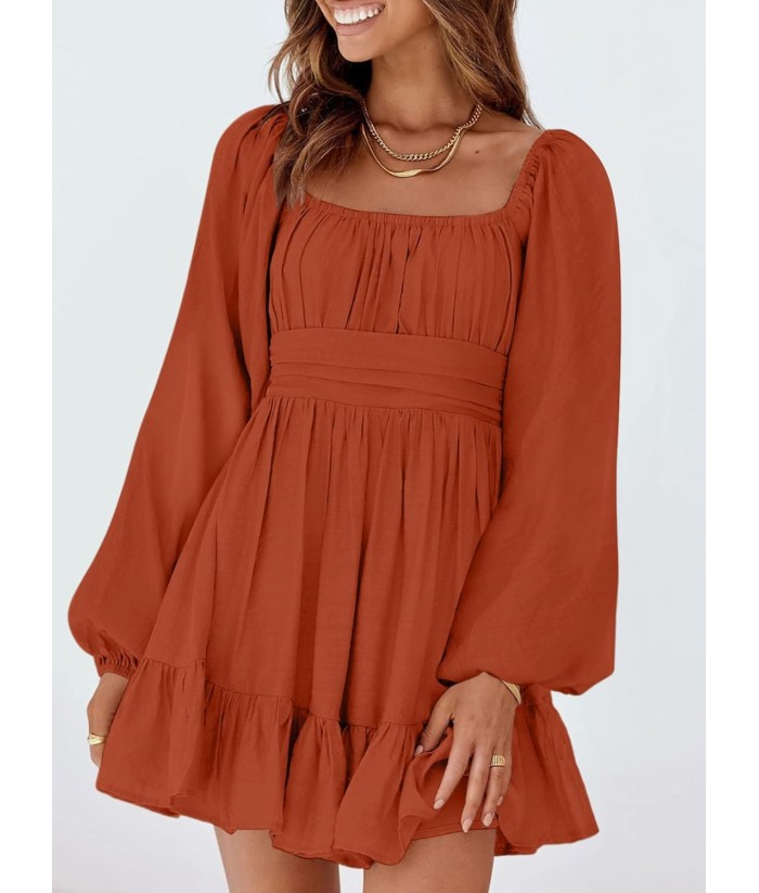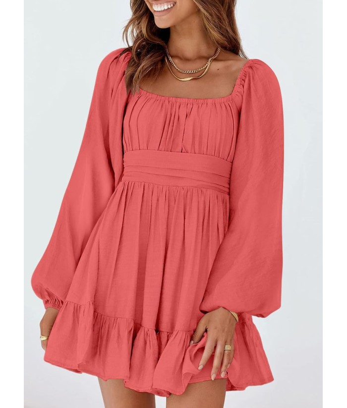 Dokotoo Womens Dress Long Lantern Sleeve Square Neck Tie Backless Sexy Dress Ruffle Elastic Waist A-Line Mini Dress