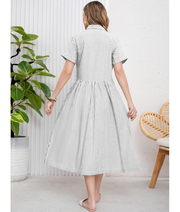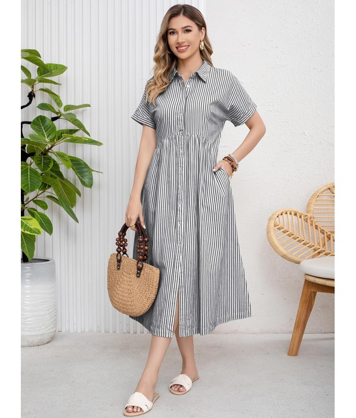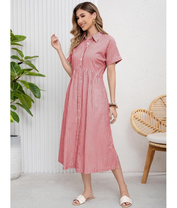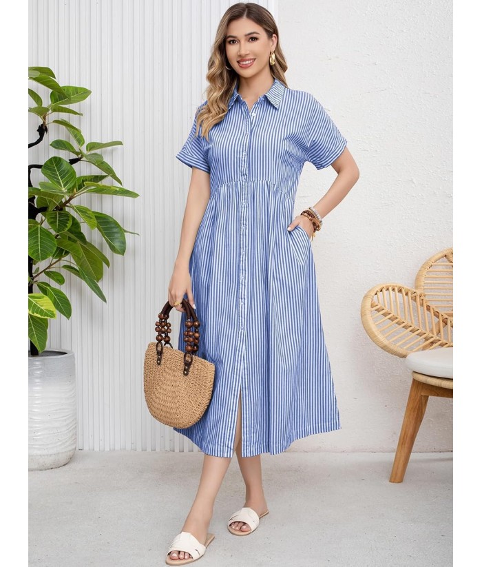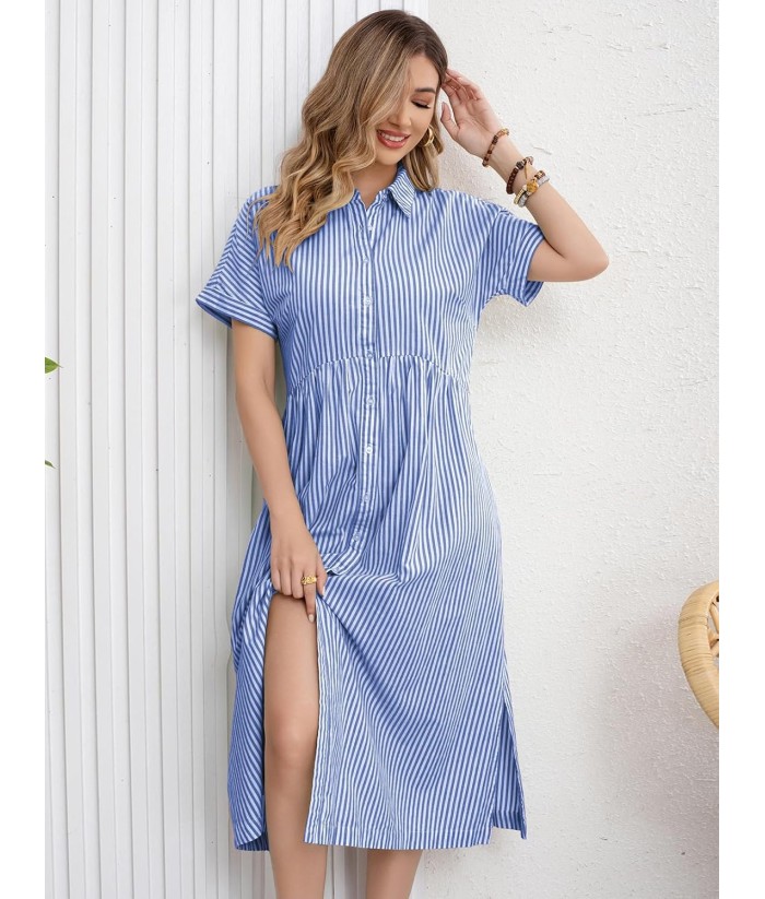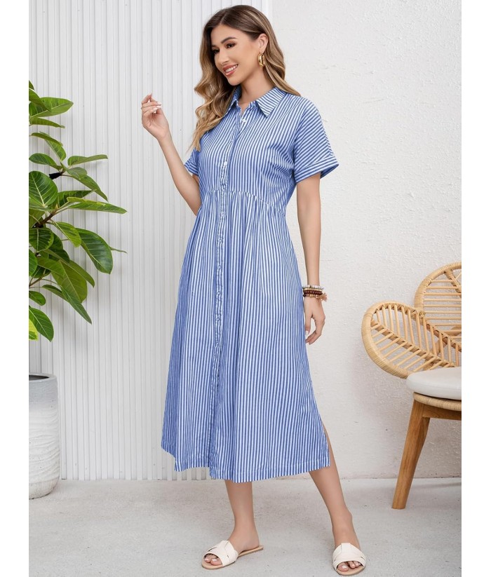 ebossy Women's Boho Striped Shirt Dress Button Up Side Slit Loose Mid Long Cotton Dress with Pockets