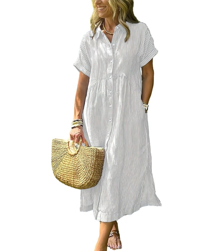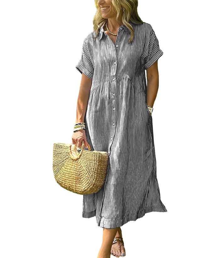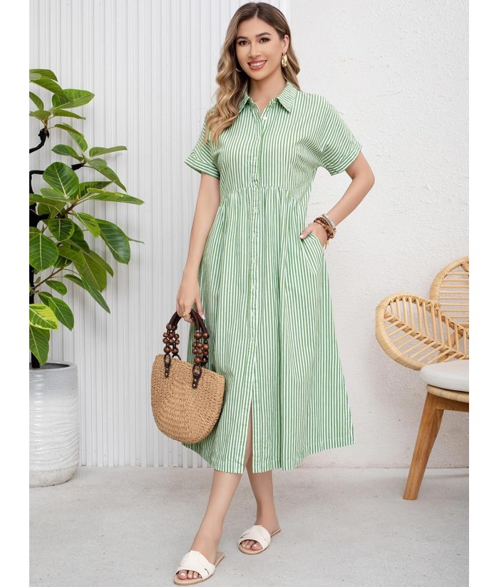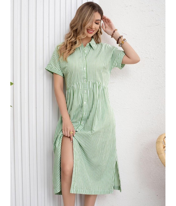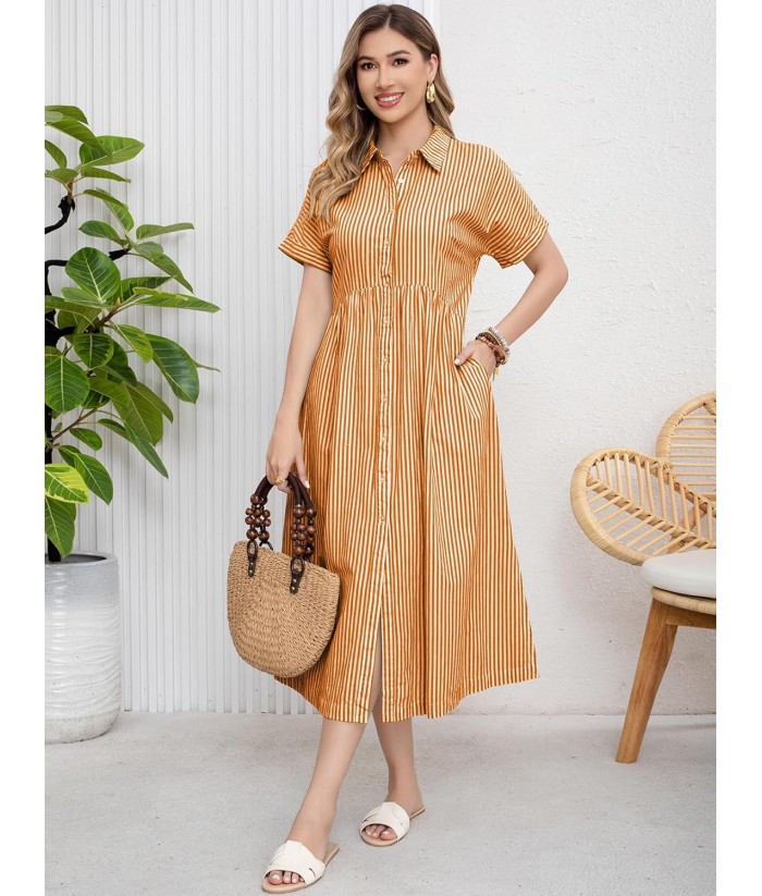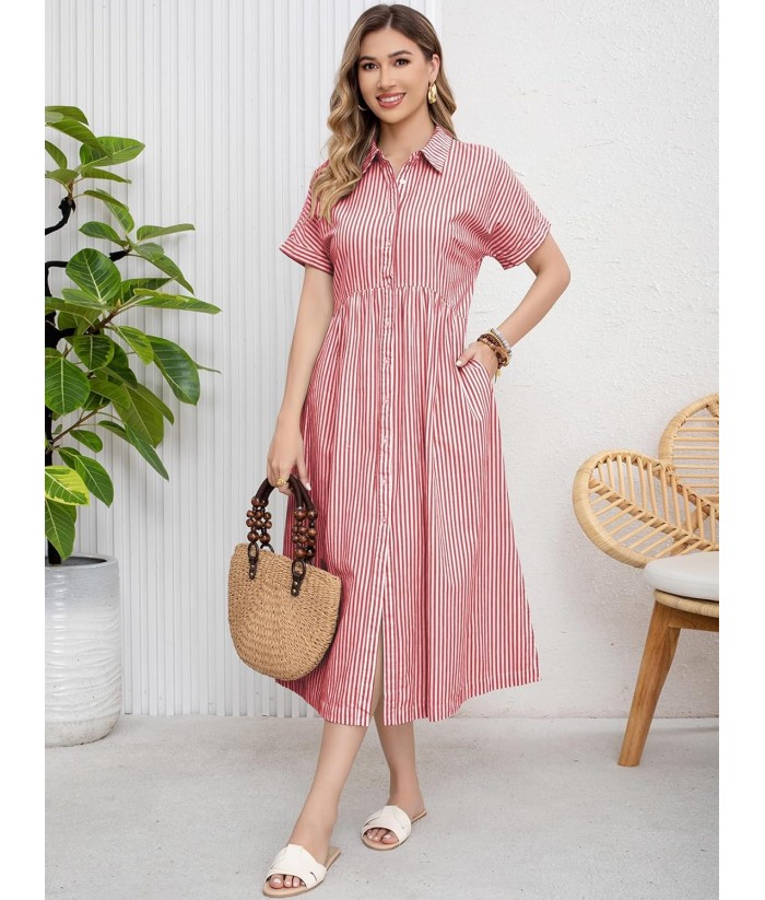 ebossy Women's Boho Striped Shirt Dress Button Up Side Slit Loose Mid Long Cotton Dress with Pockets