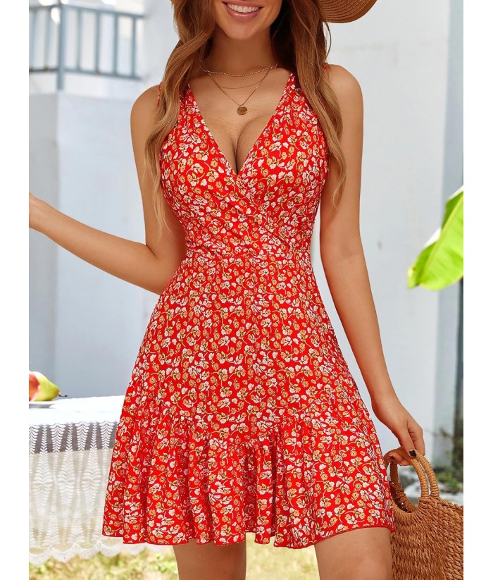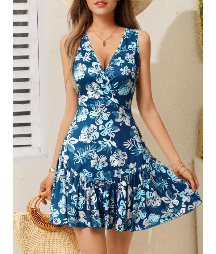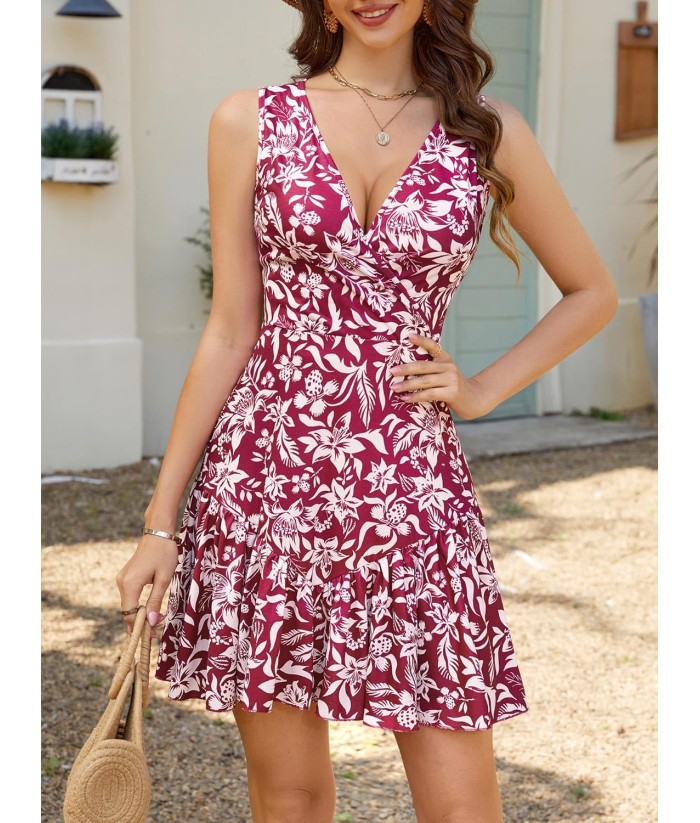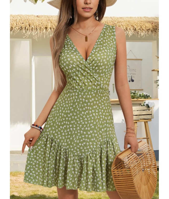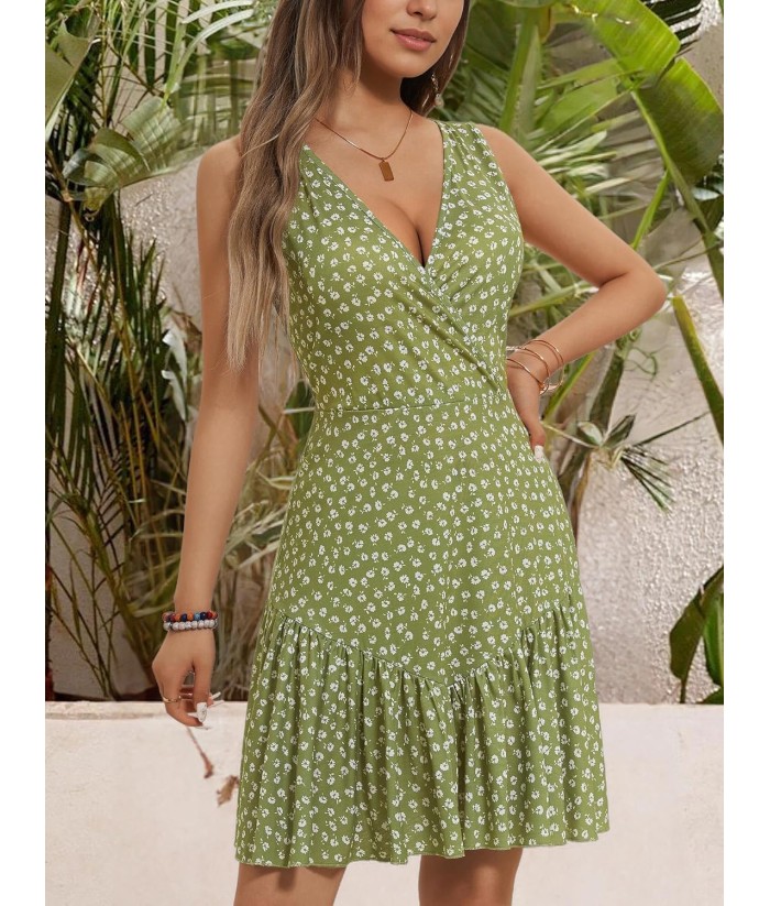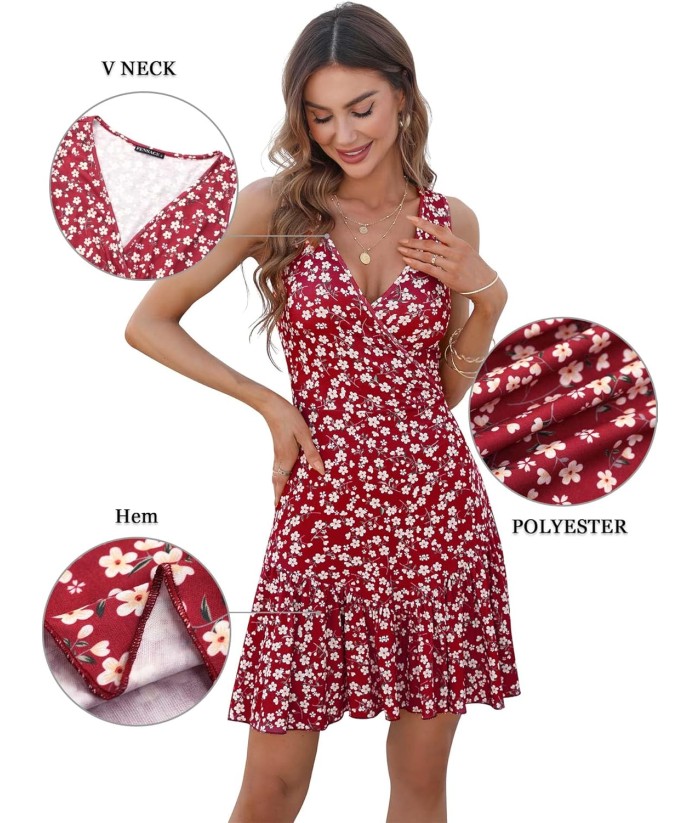 FENSACE Women's Summer Sleeveless Sexy Wrap V Neck Floral Sundress Mini Dress