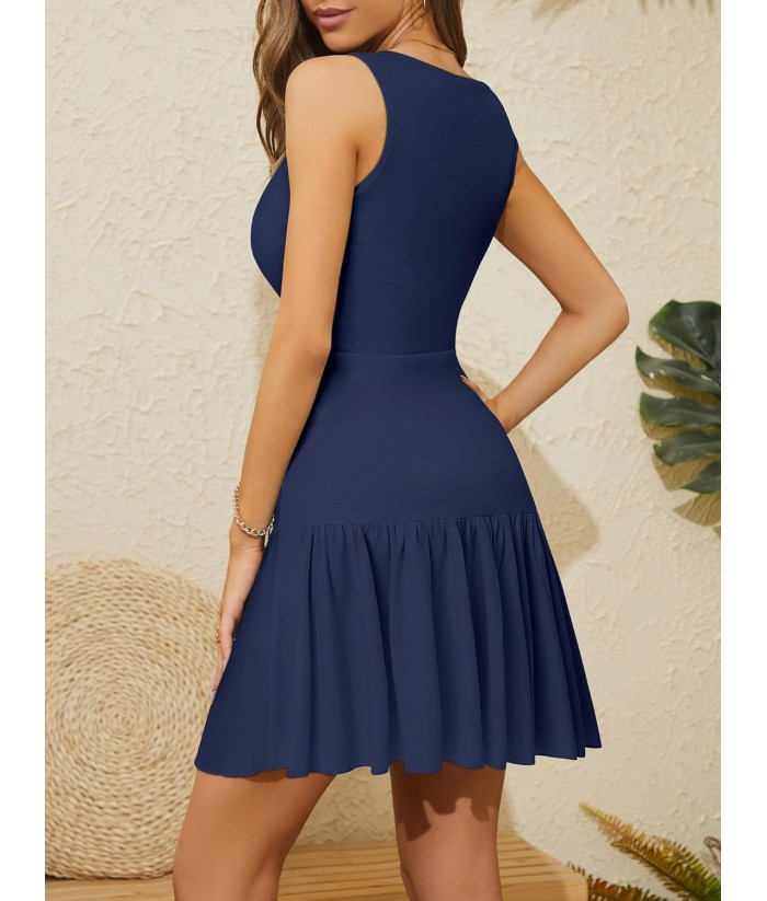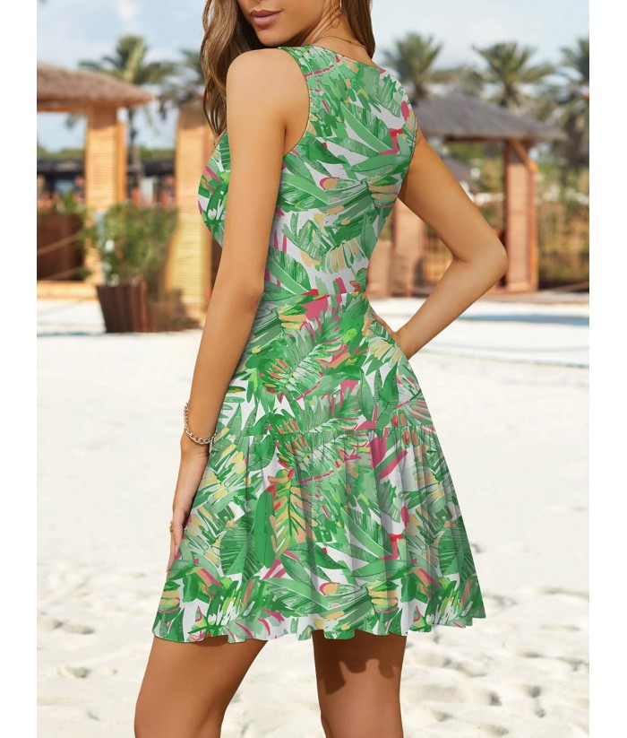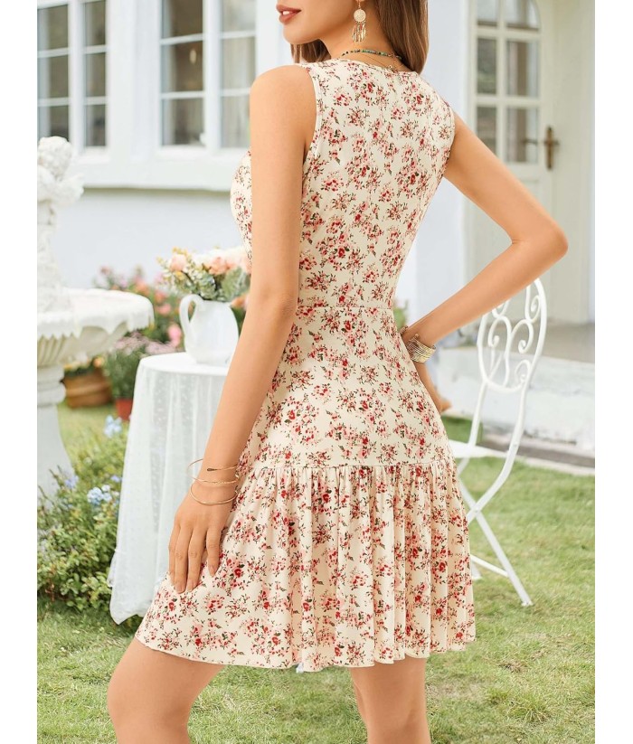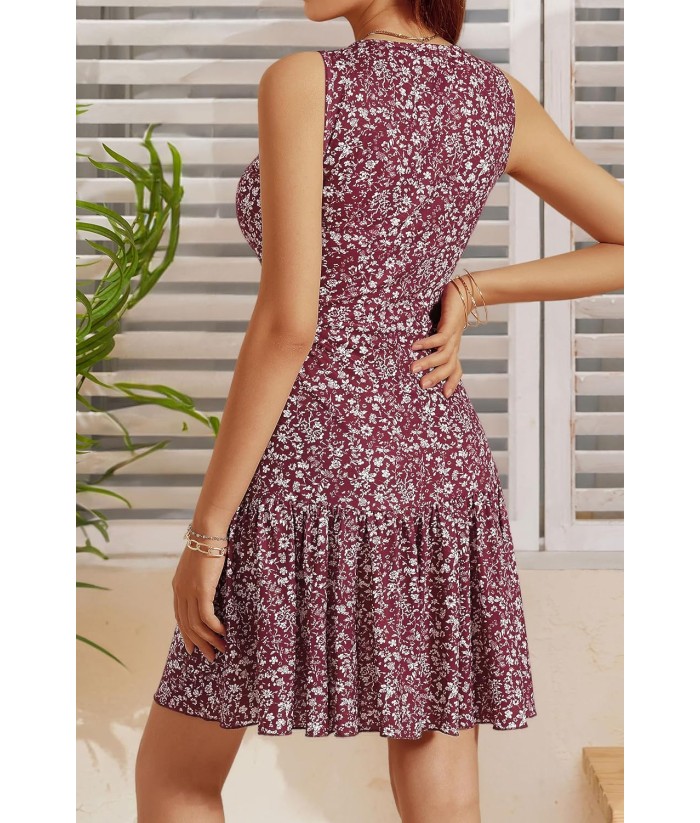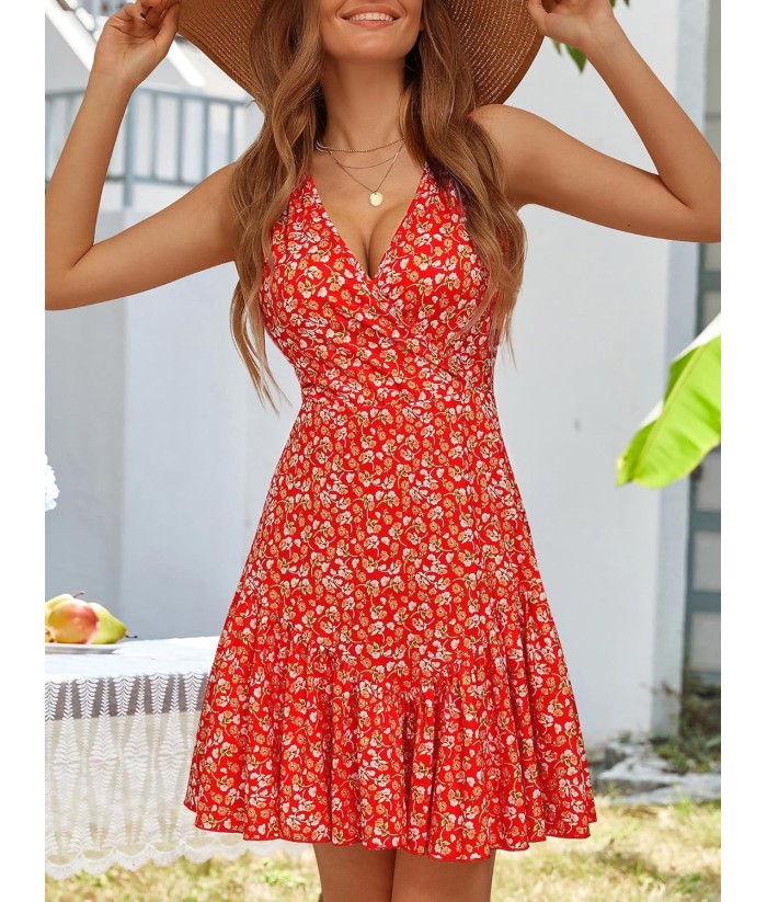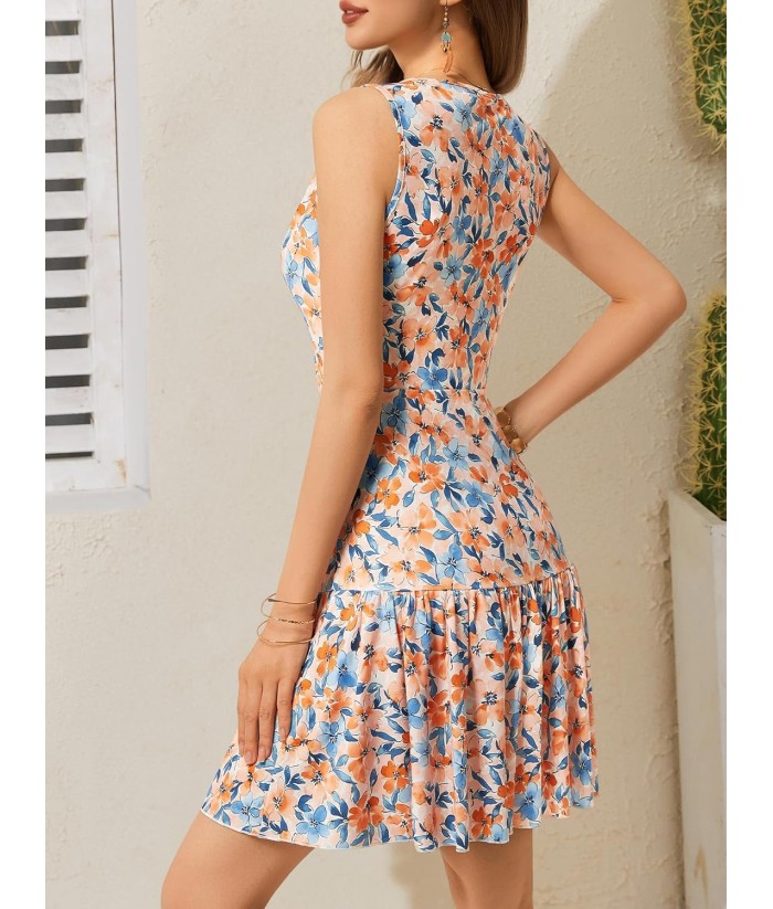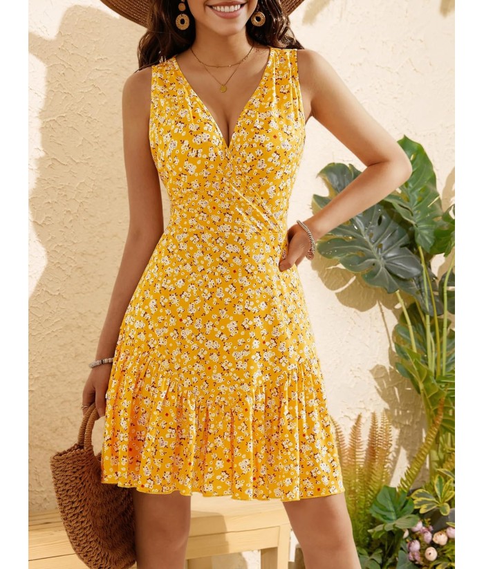 FENSACE Women's Summer Sleeveless Sexy Wrap V Neck Floral Sundress Mini Dress