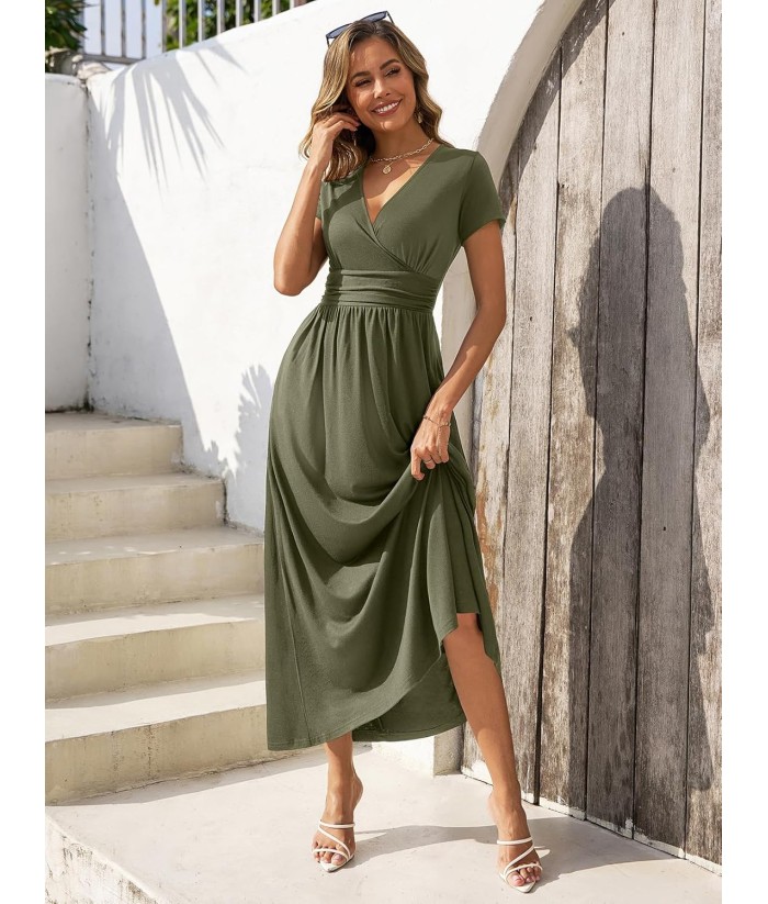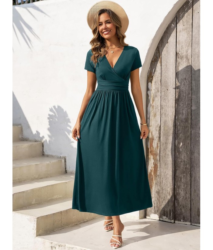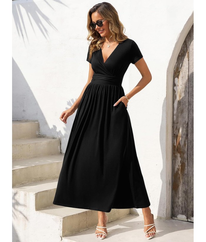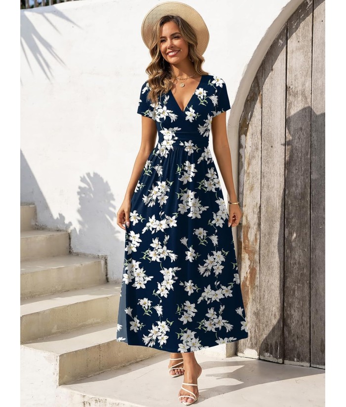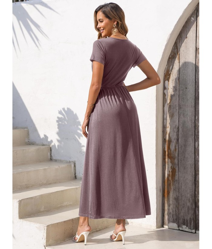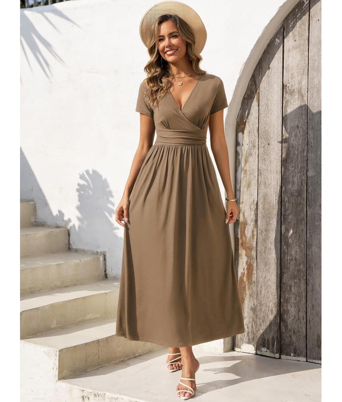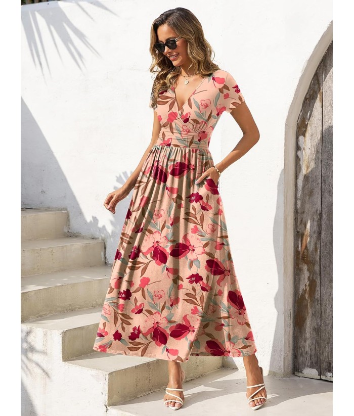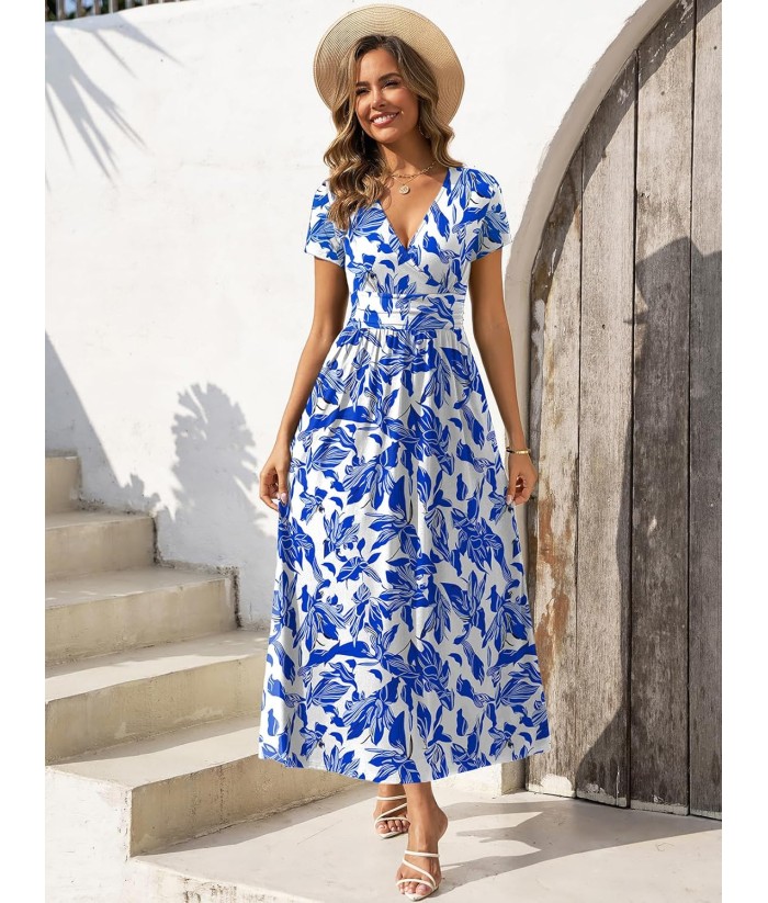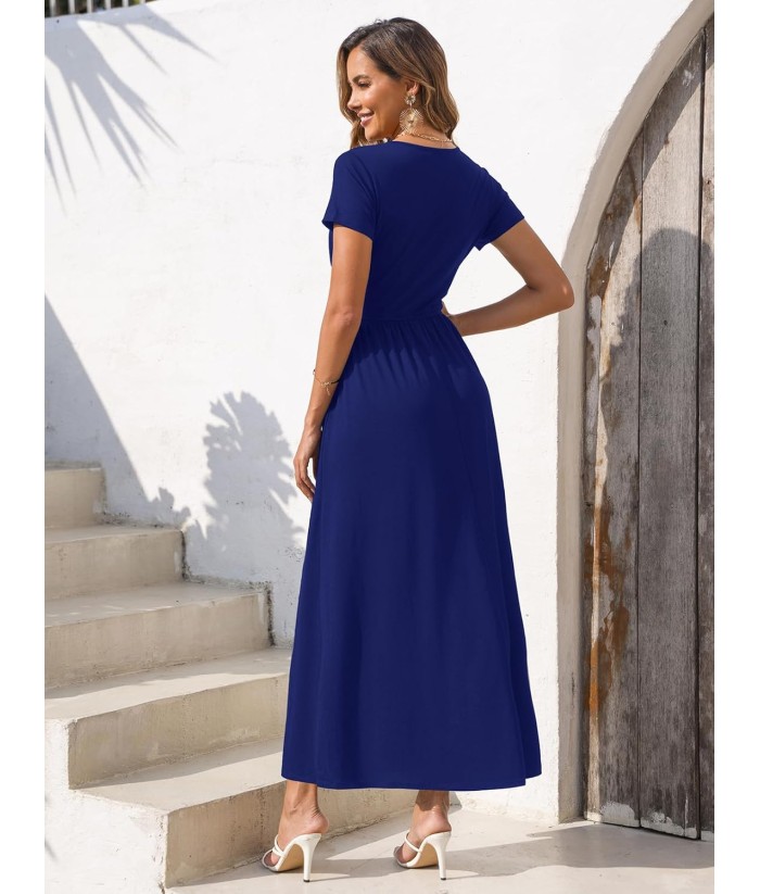 Gracyoga Women's Summer Dresses 2025 Short Sleeve Maxi Dress Casual V Neck Flowy Sundress with Pockets